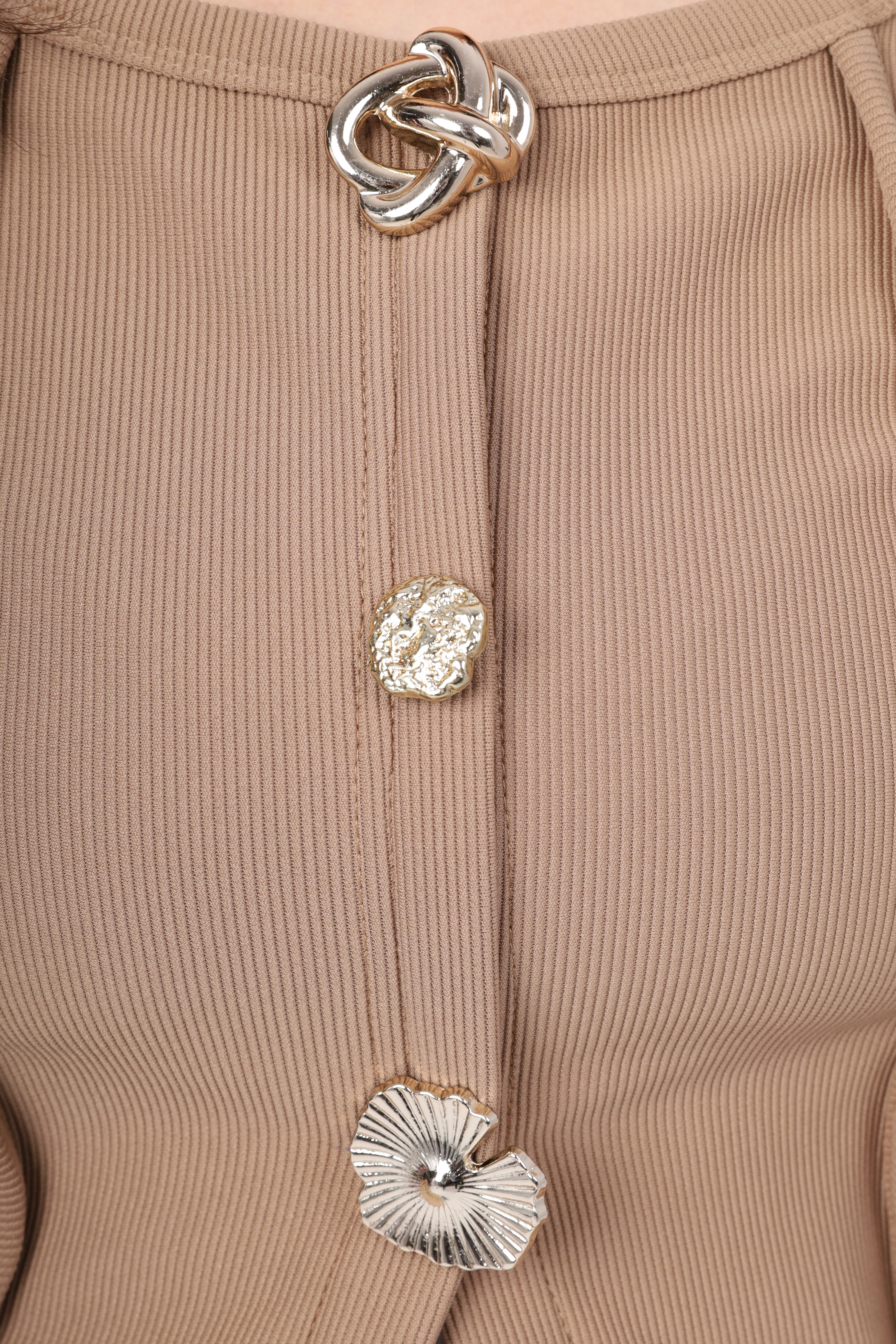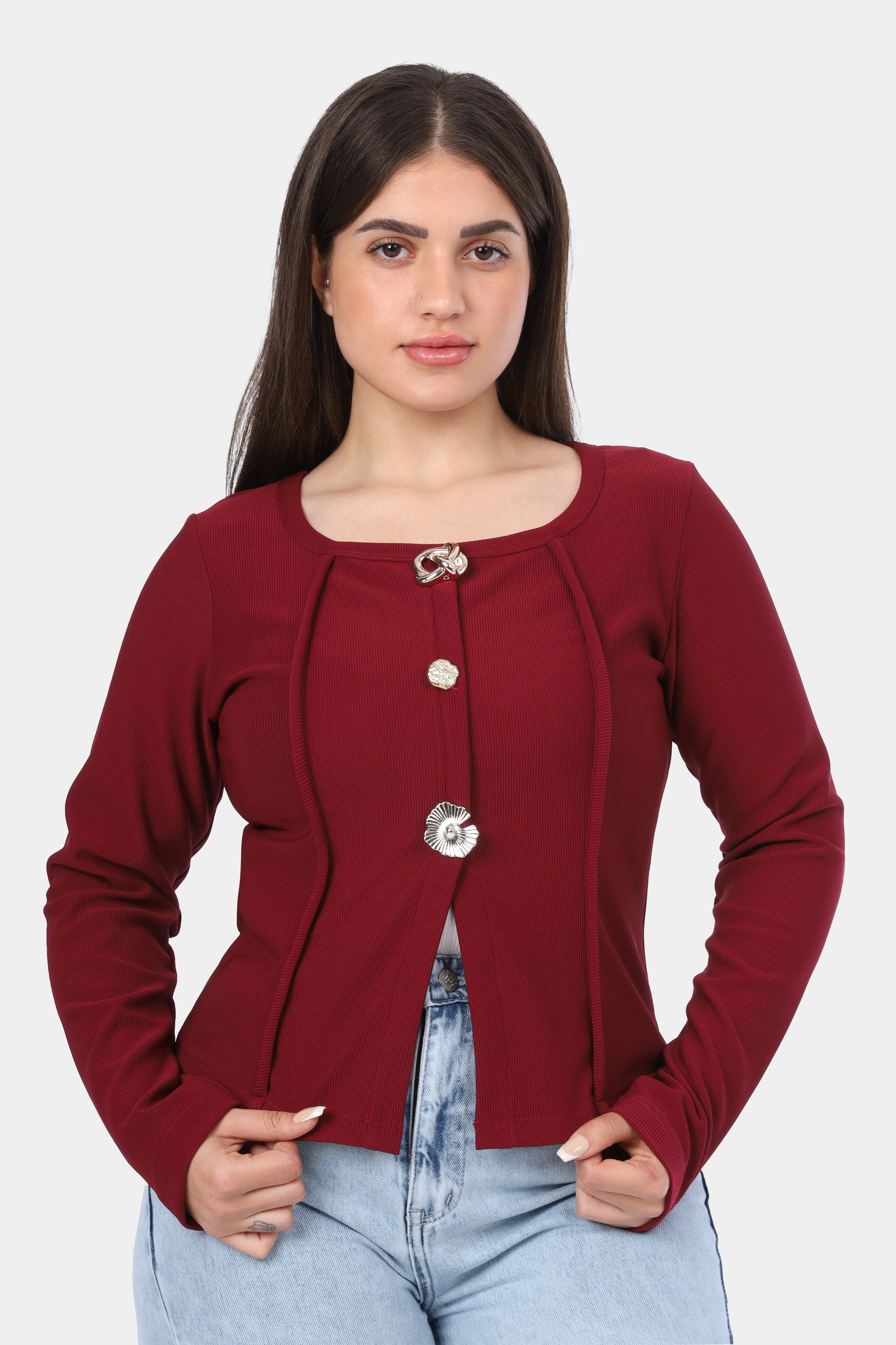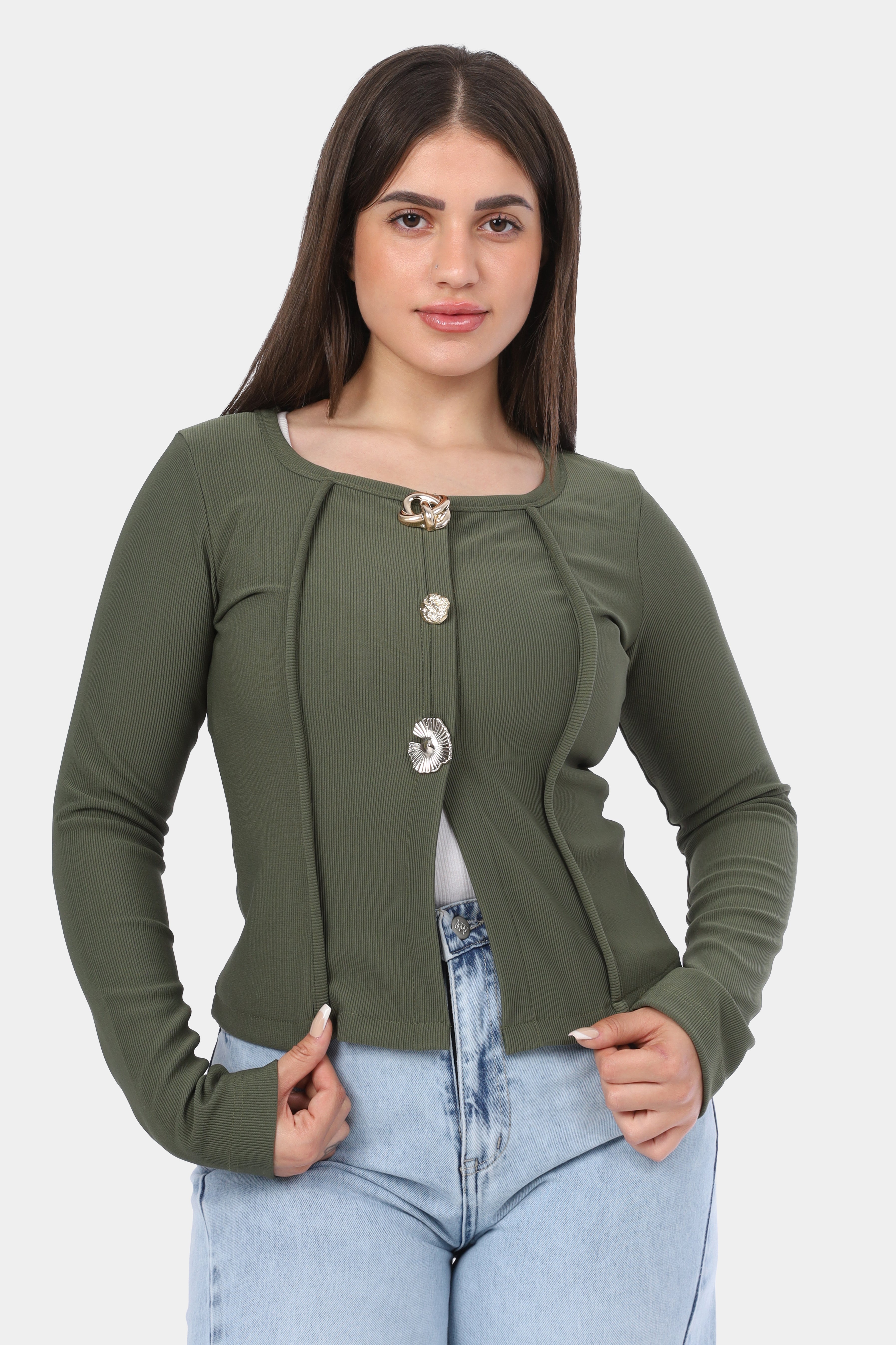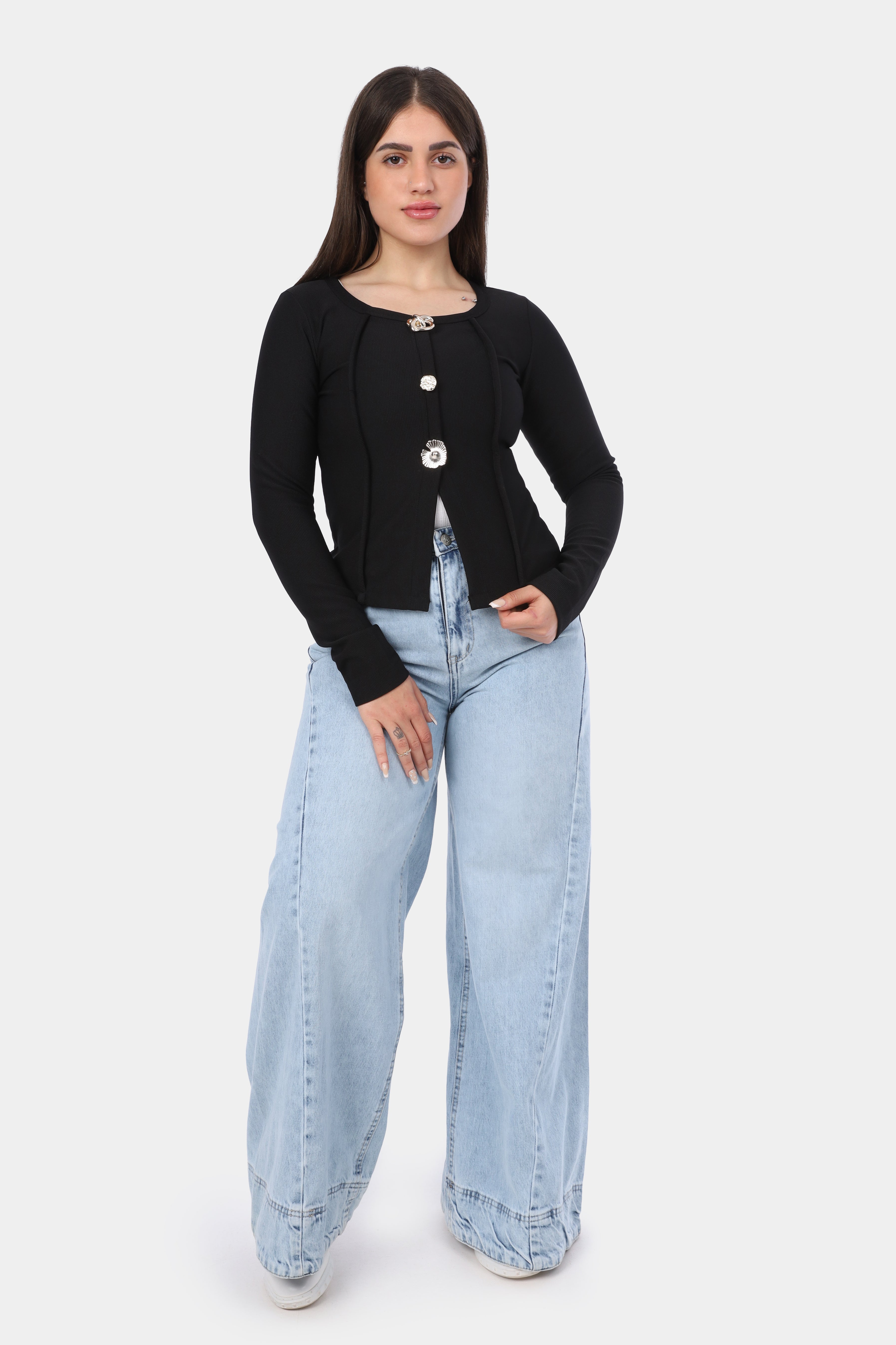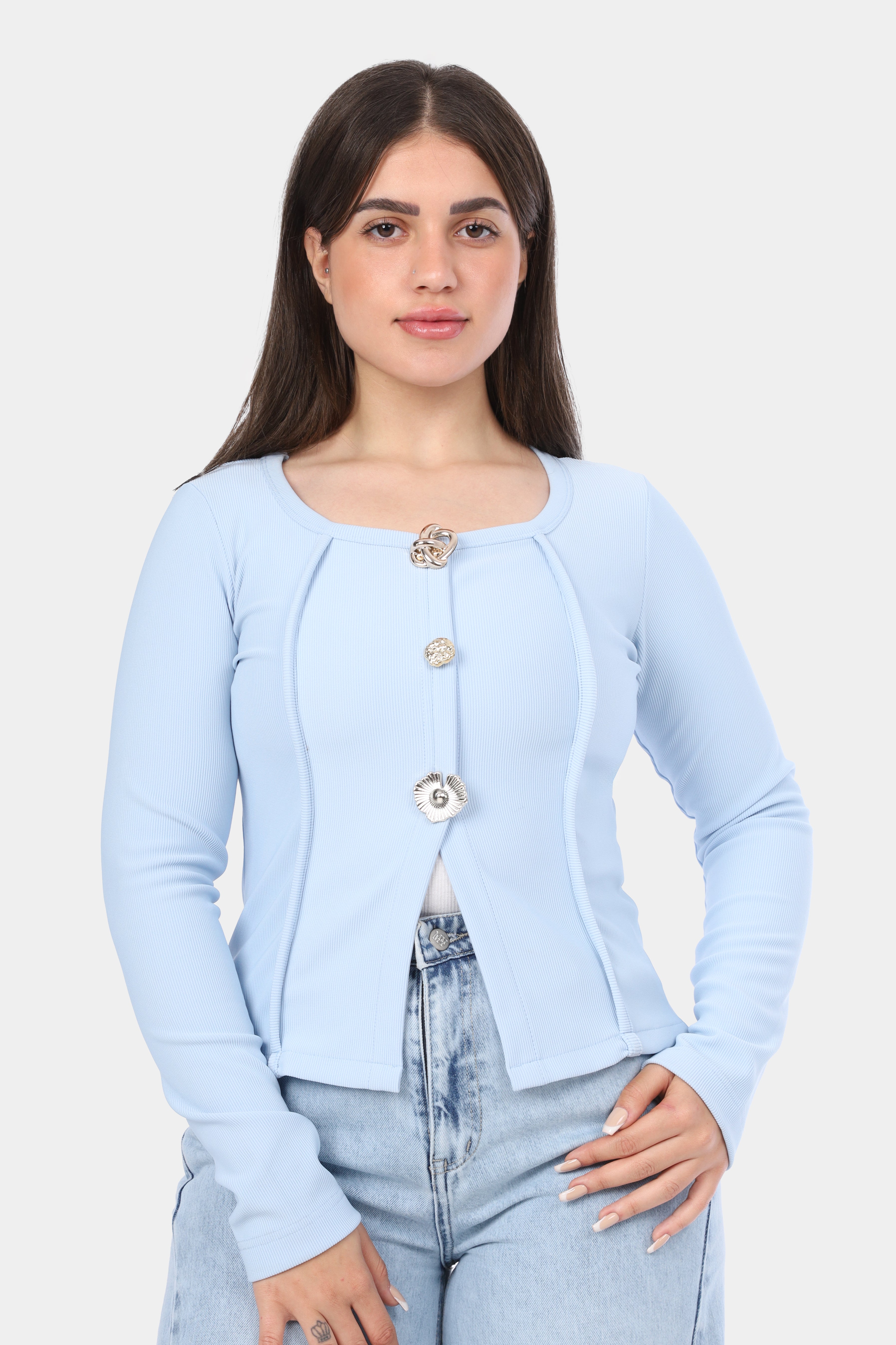 Button-Front Fitted Long Sleeve Top w164543