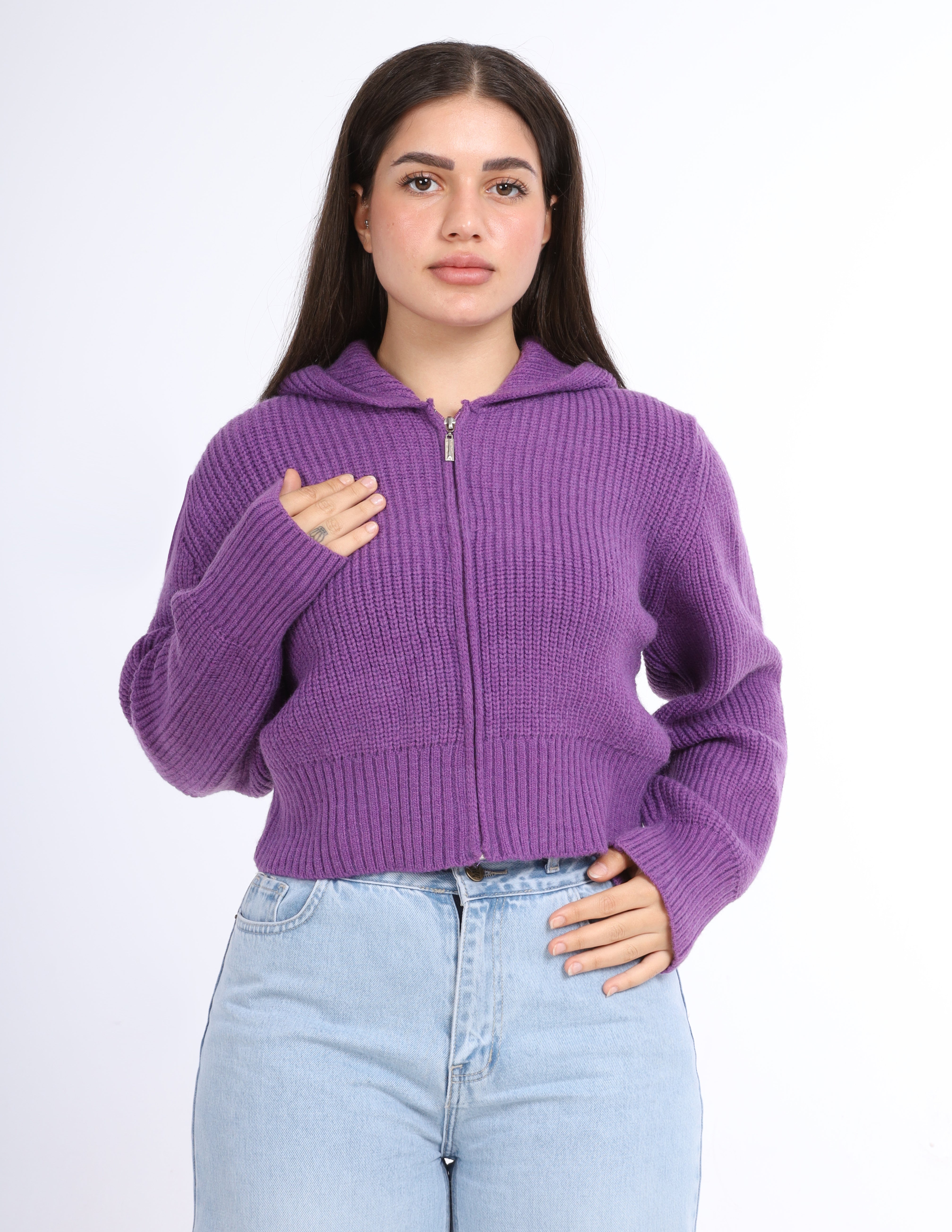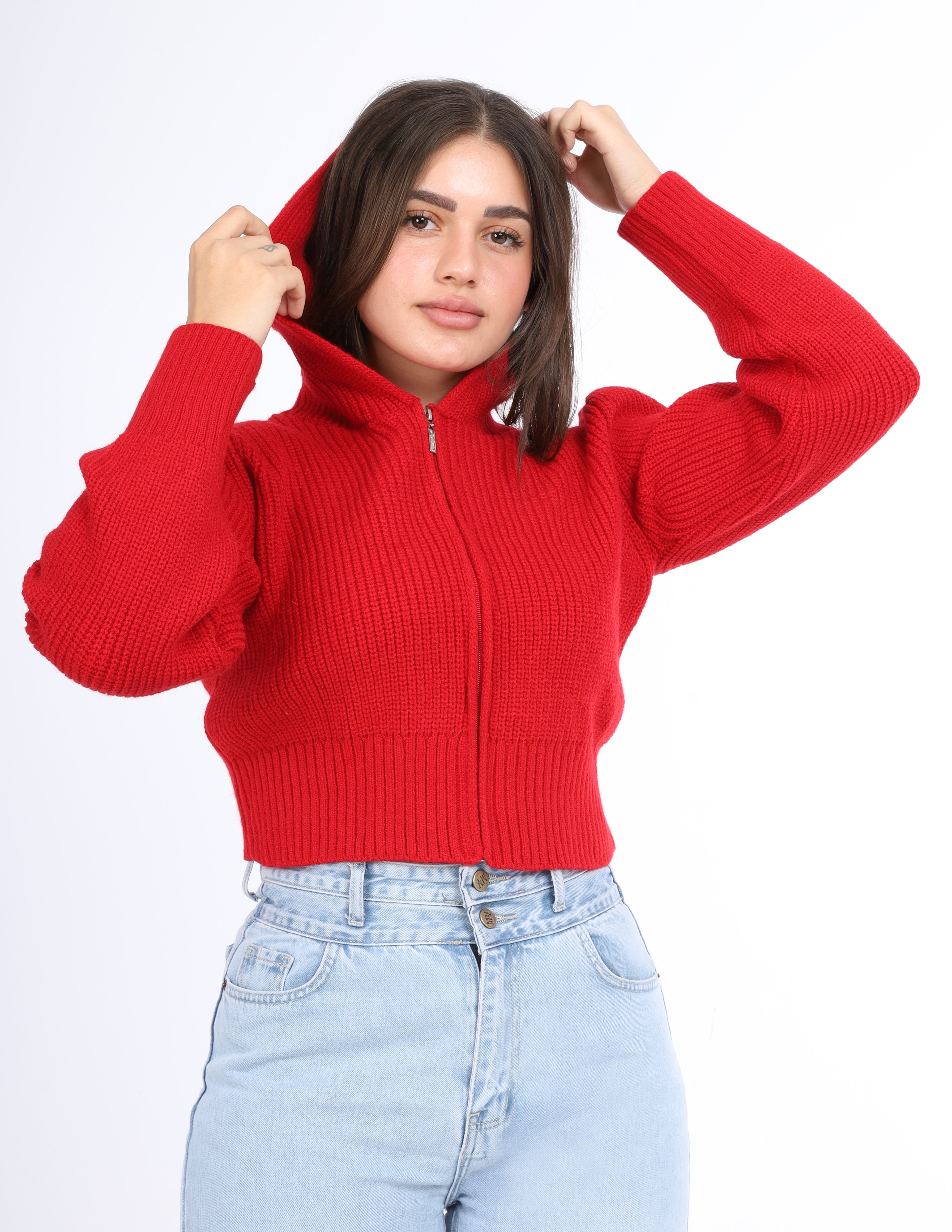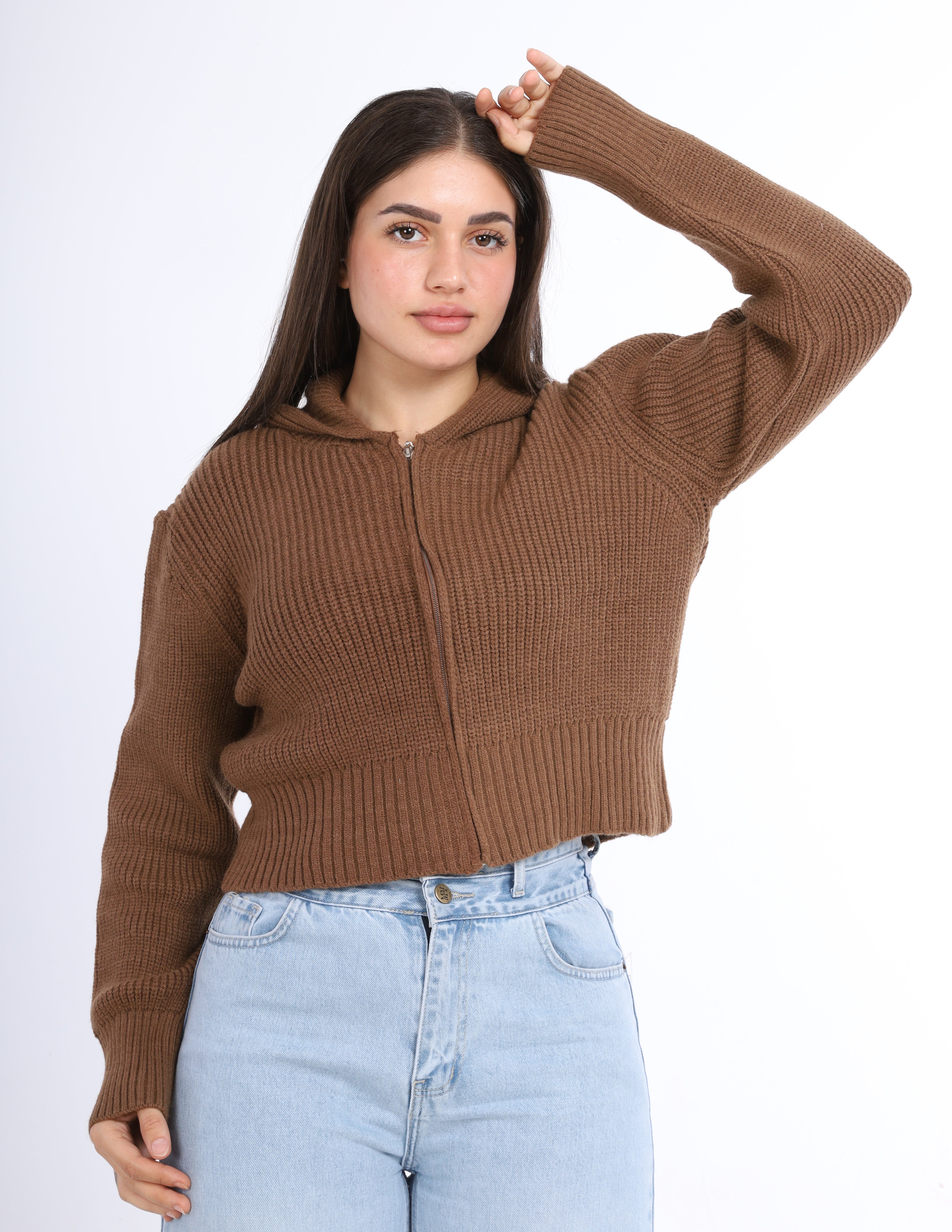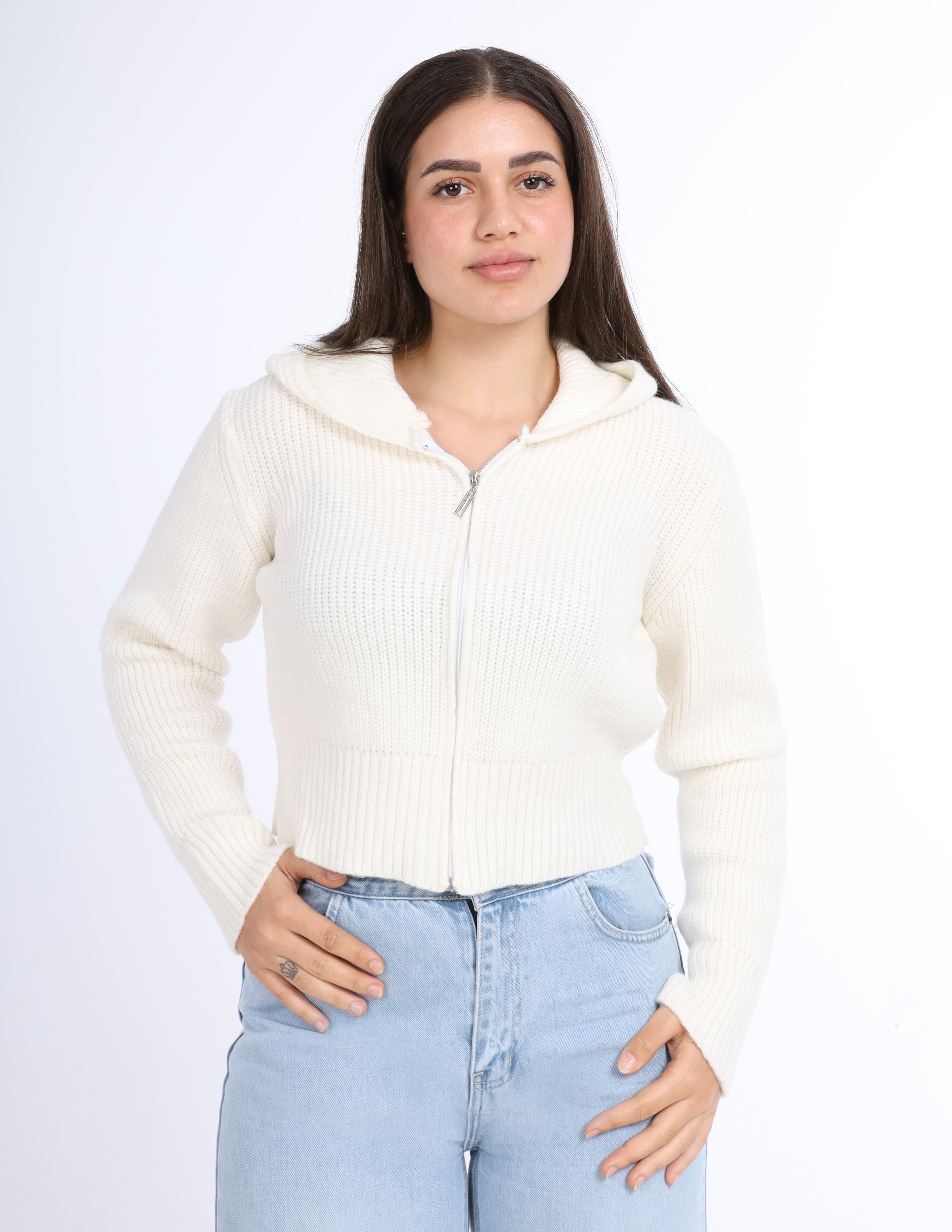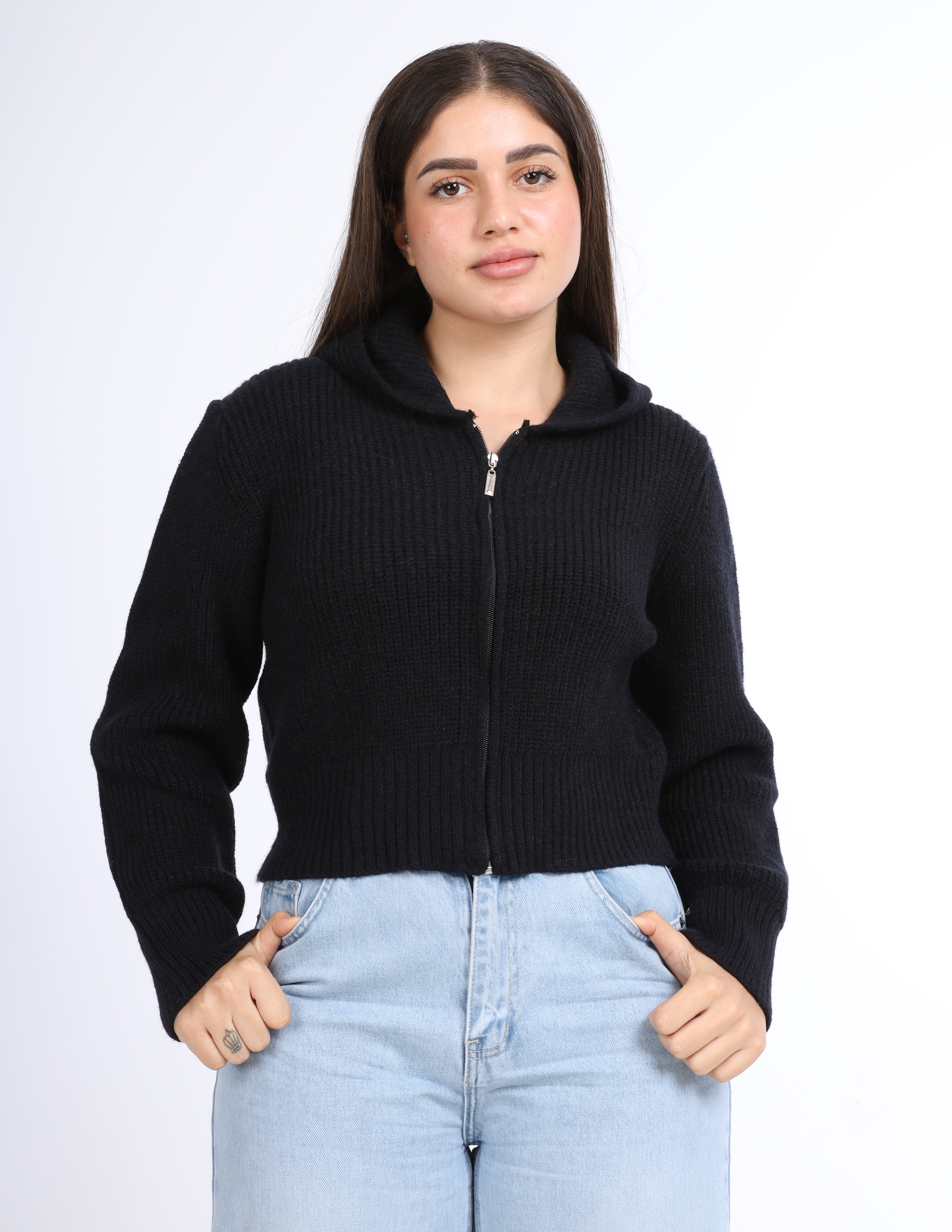 Cropped knit Hoodie with a front zipper and hood, perfect for a casual and cozy look