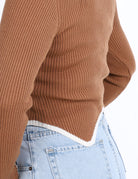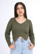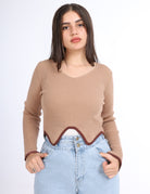 Stylish ribbed top features an asymmetrical curved hem and a fitted design