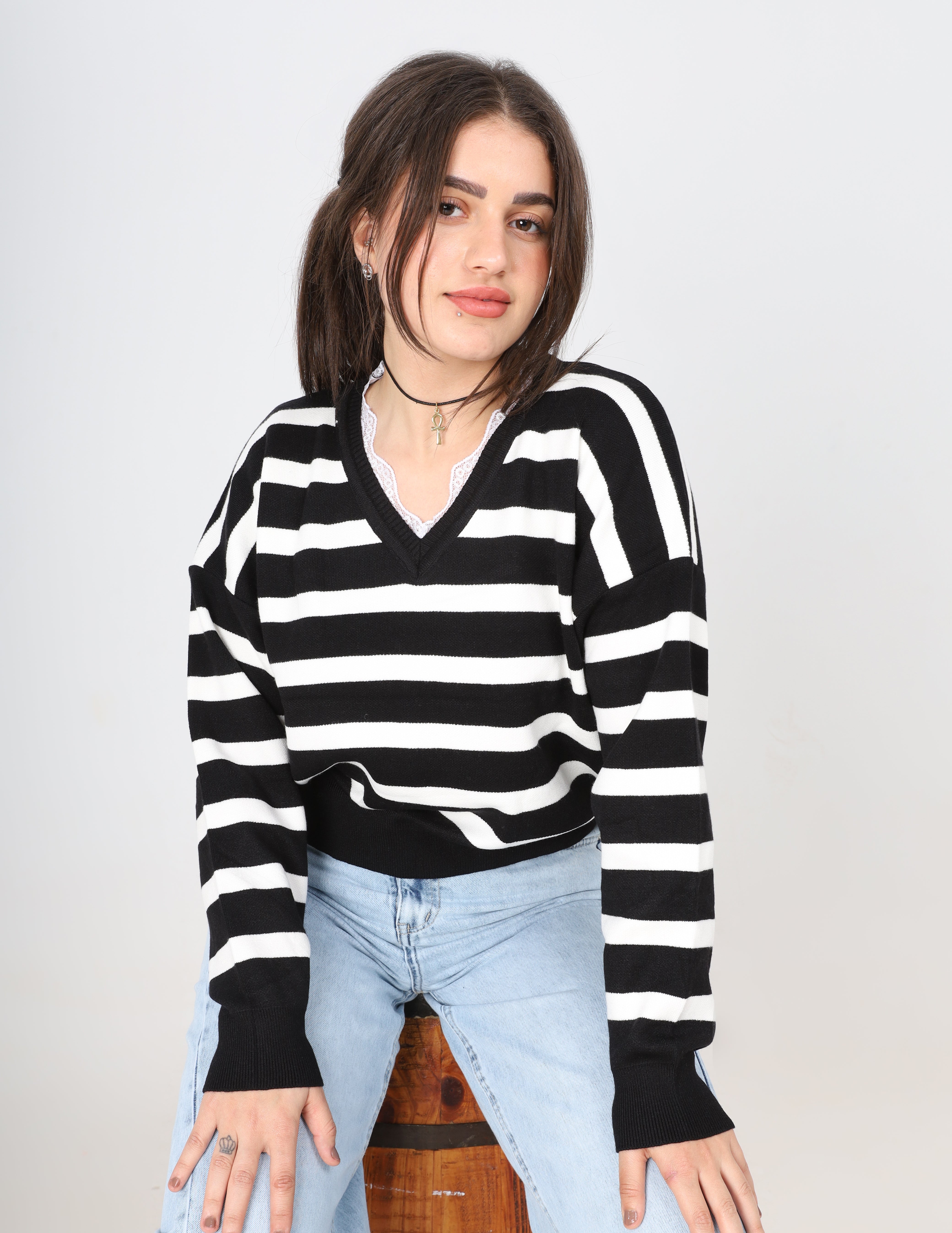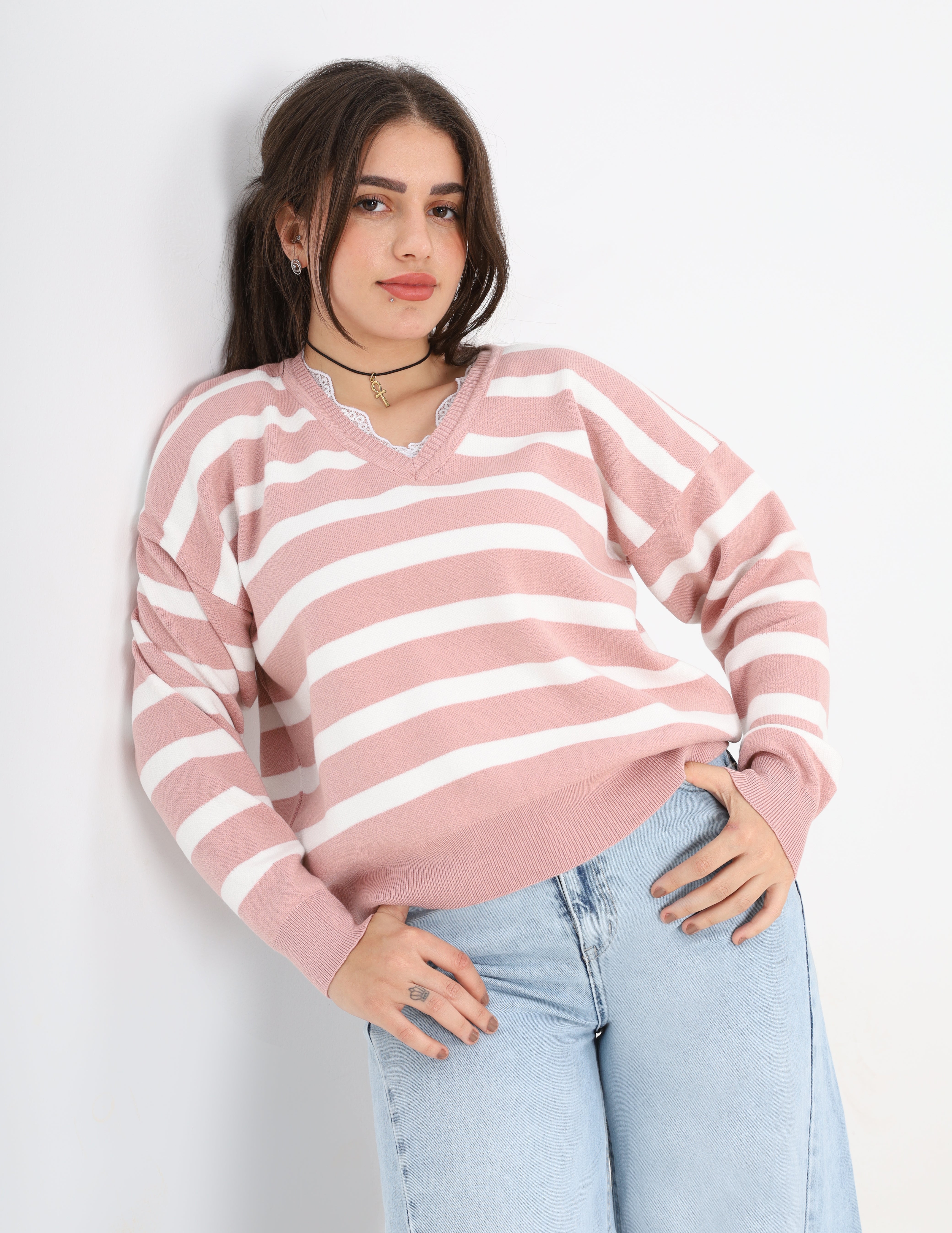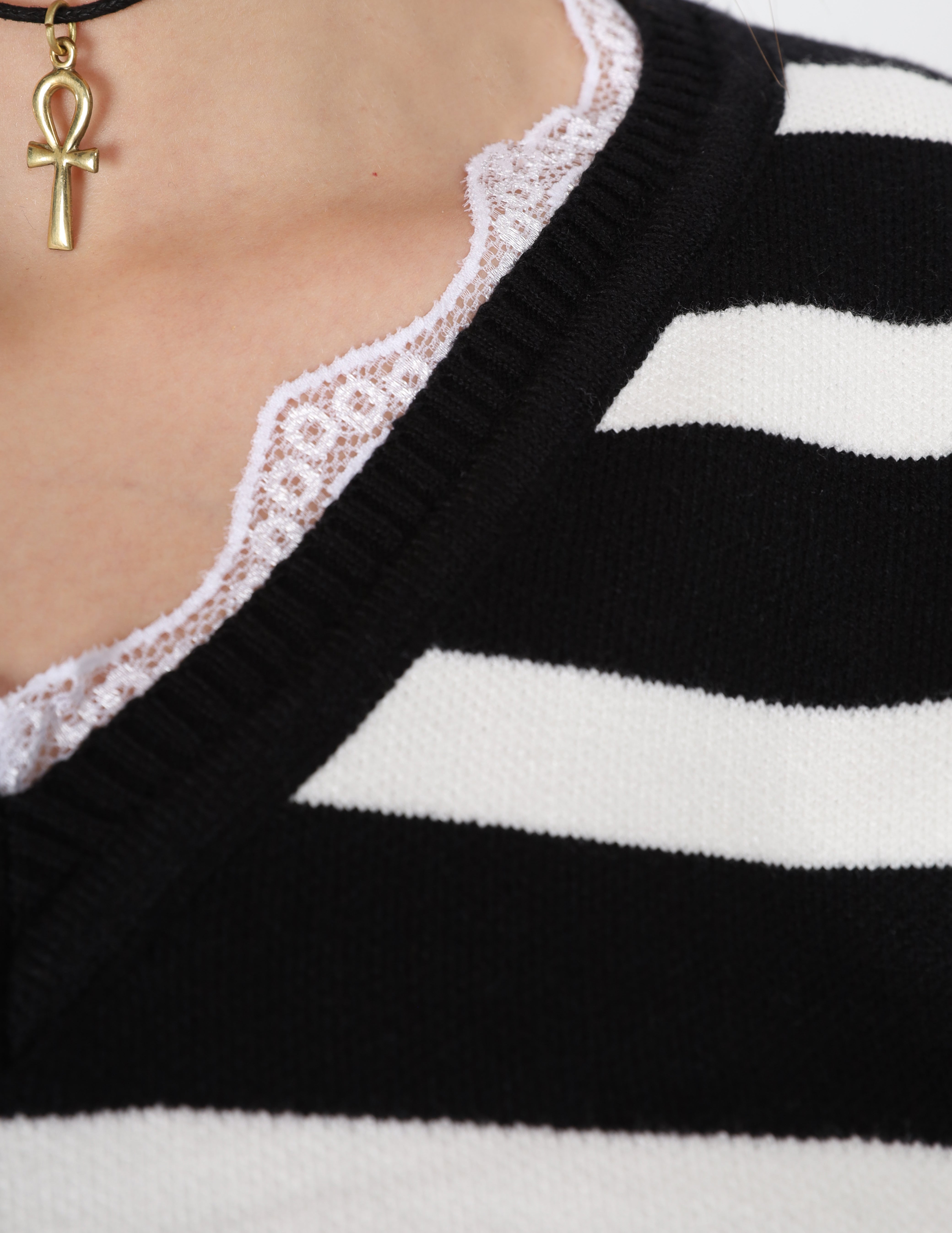 A soft striped knit sweater featuring a delicate lace V-neckline for a feminine, stylish touch.