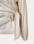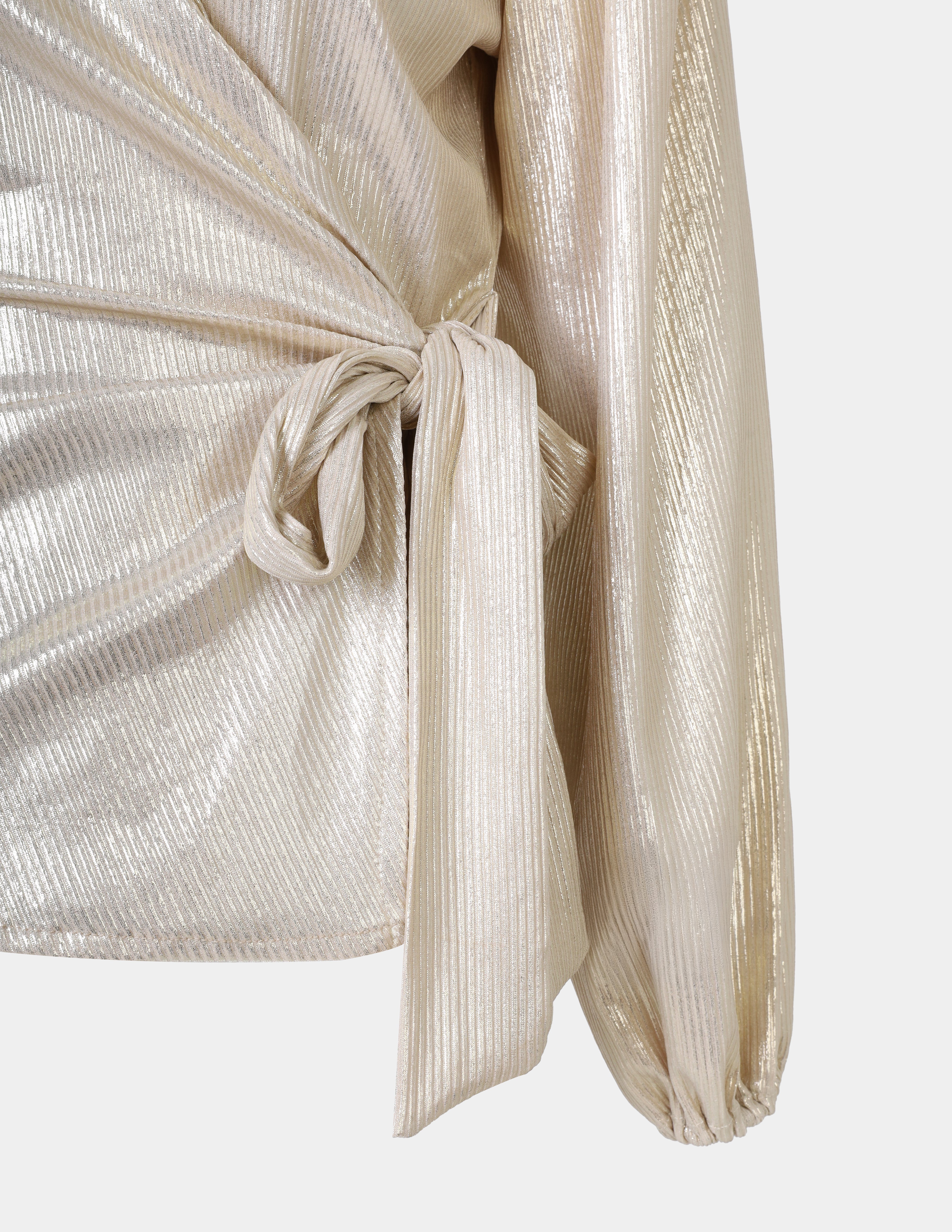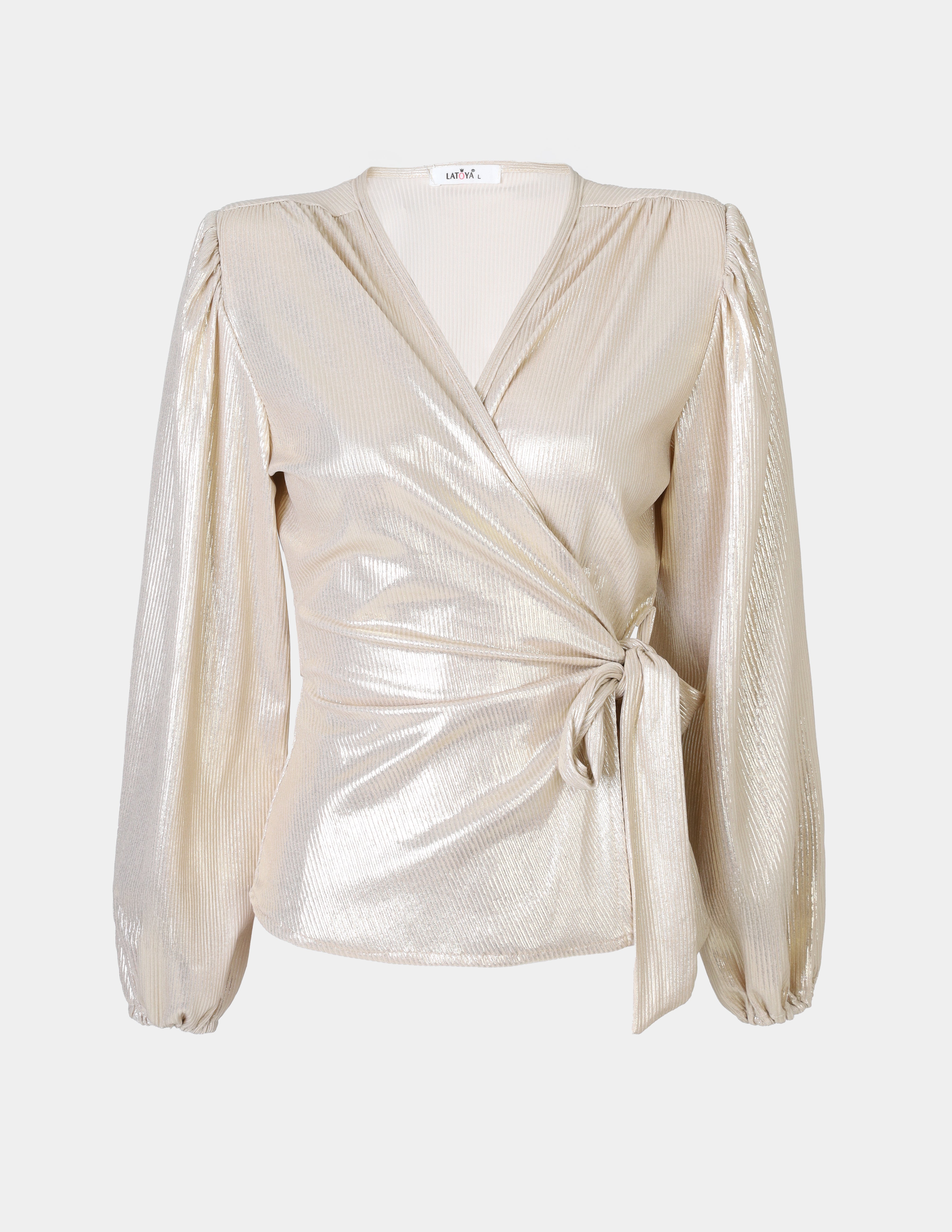 Glow Rib Side-Tie Shiny Blouse, a chic piece that combines ribbed texture with a subtle shimmer for a bold yet elegant look.