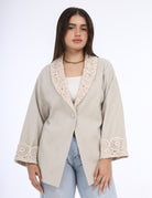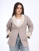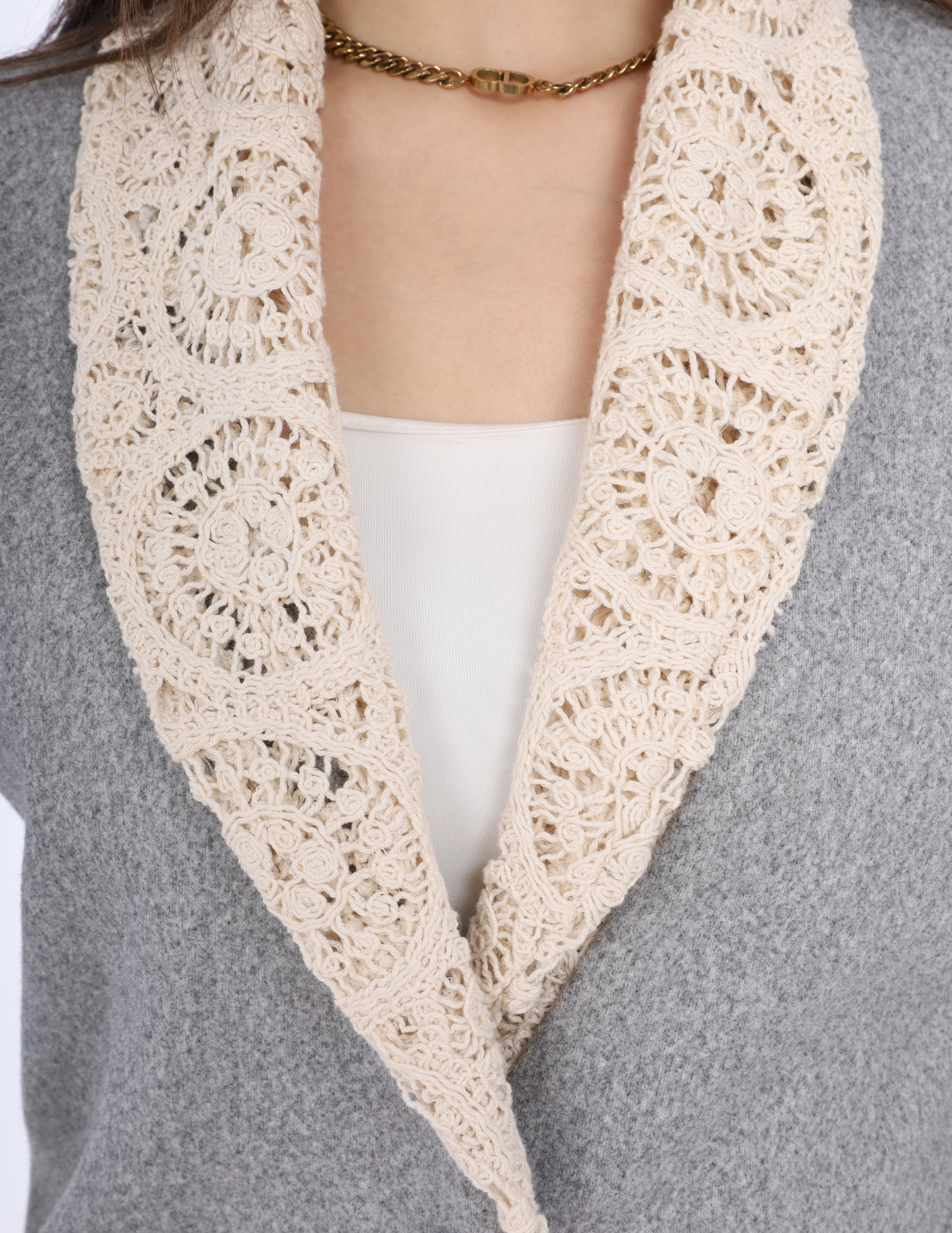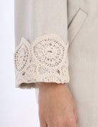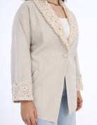 An elegant wool blazer featuring delicate lace details on the collar and sleeves , perfect for chic and formal looks.