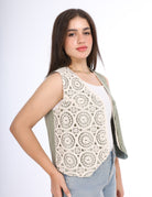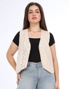 Chic sleeveless vest crafted with a mix of crochet and linen textures. Designed for a trendy layered look that blends boho charm with modern style.