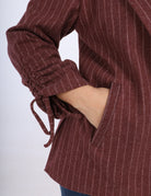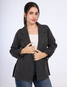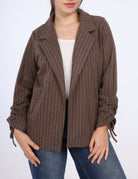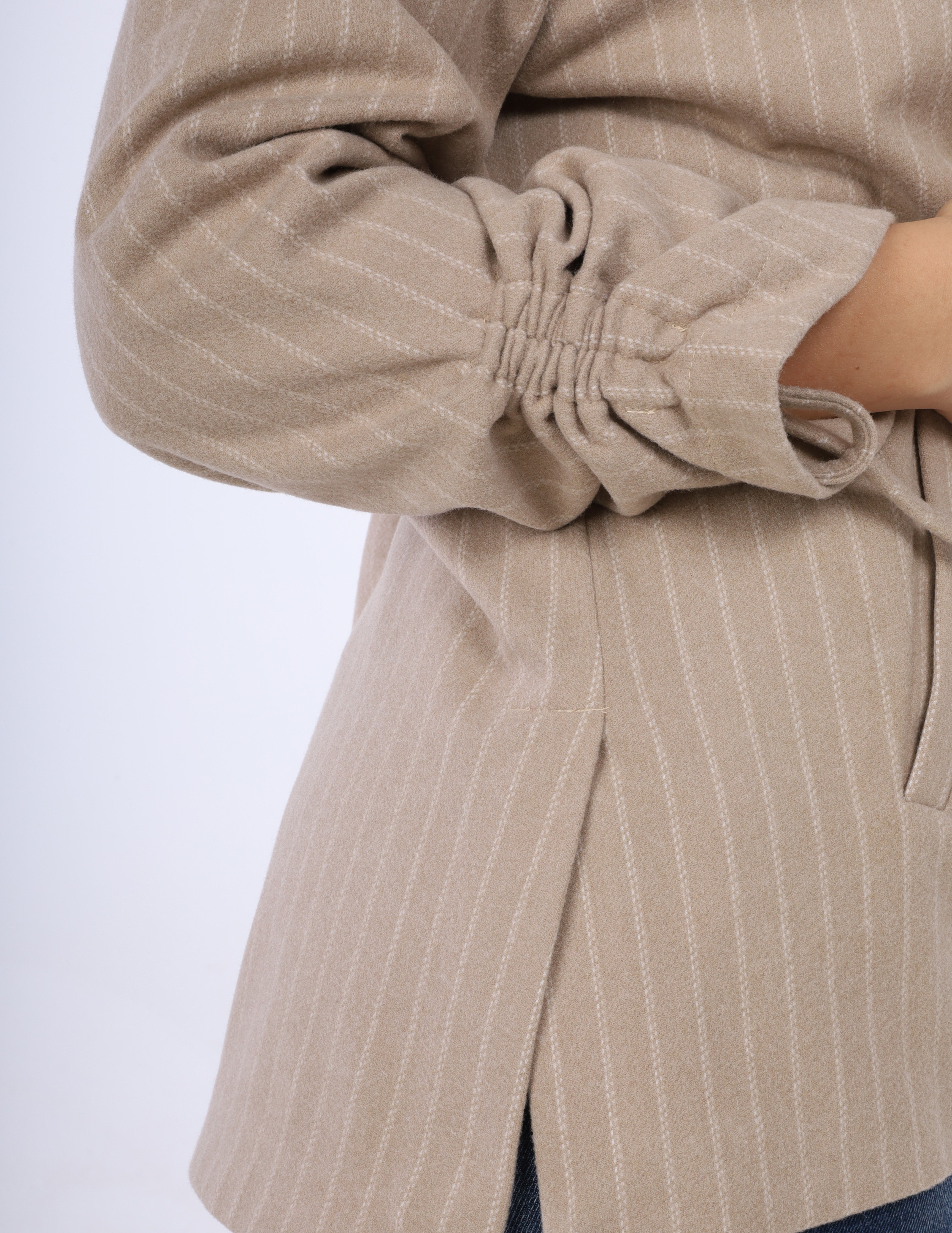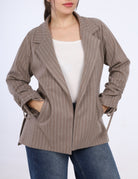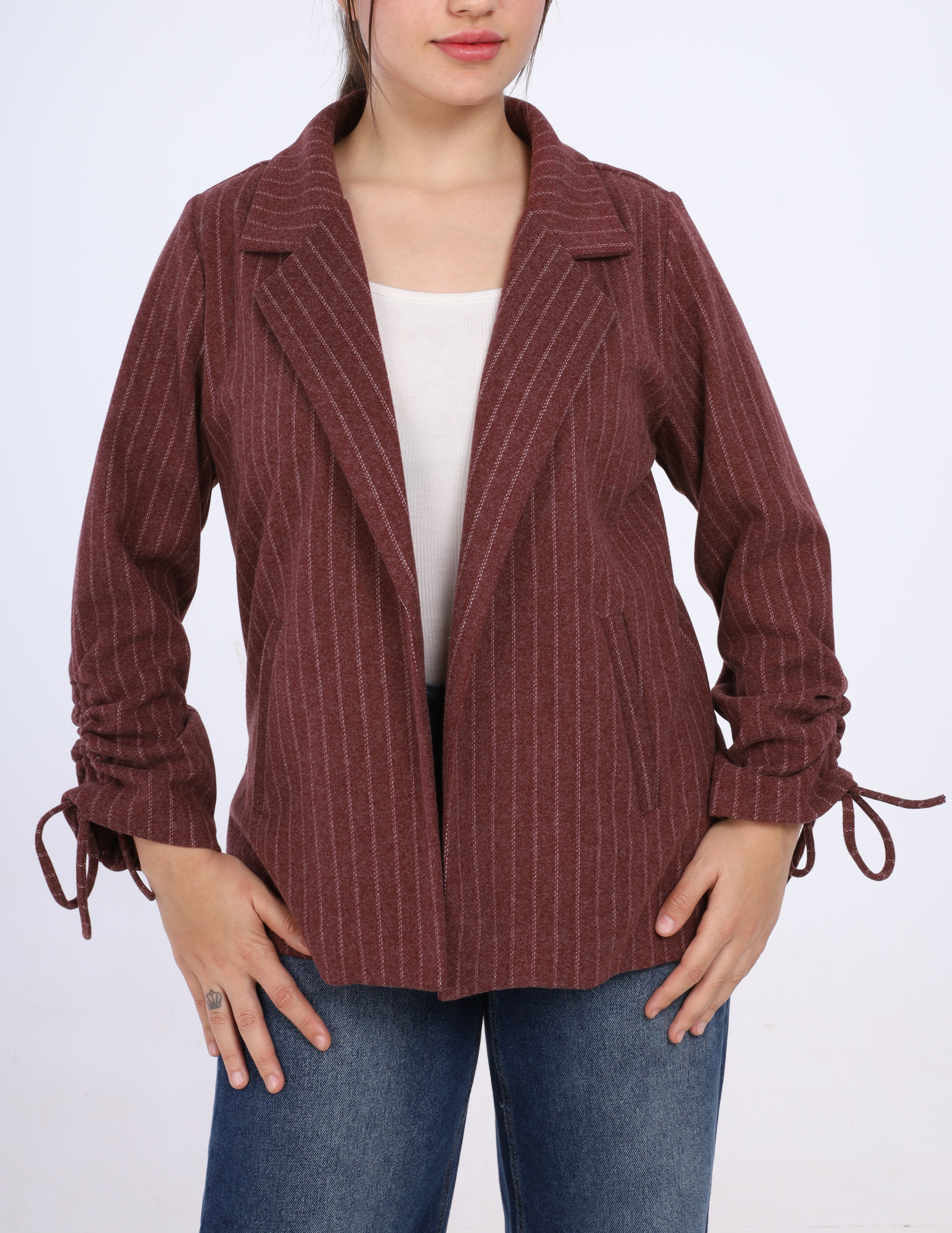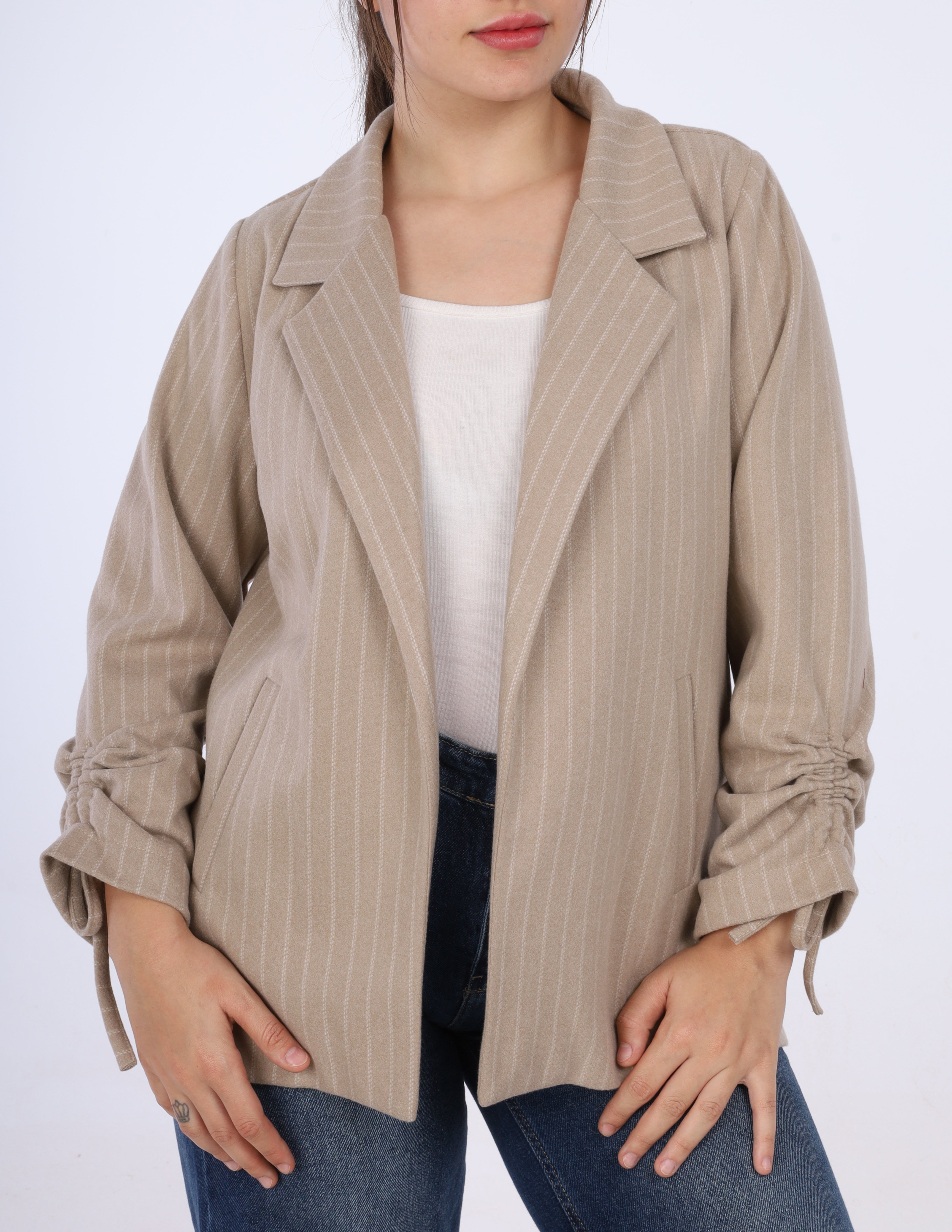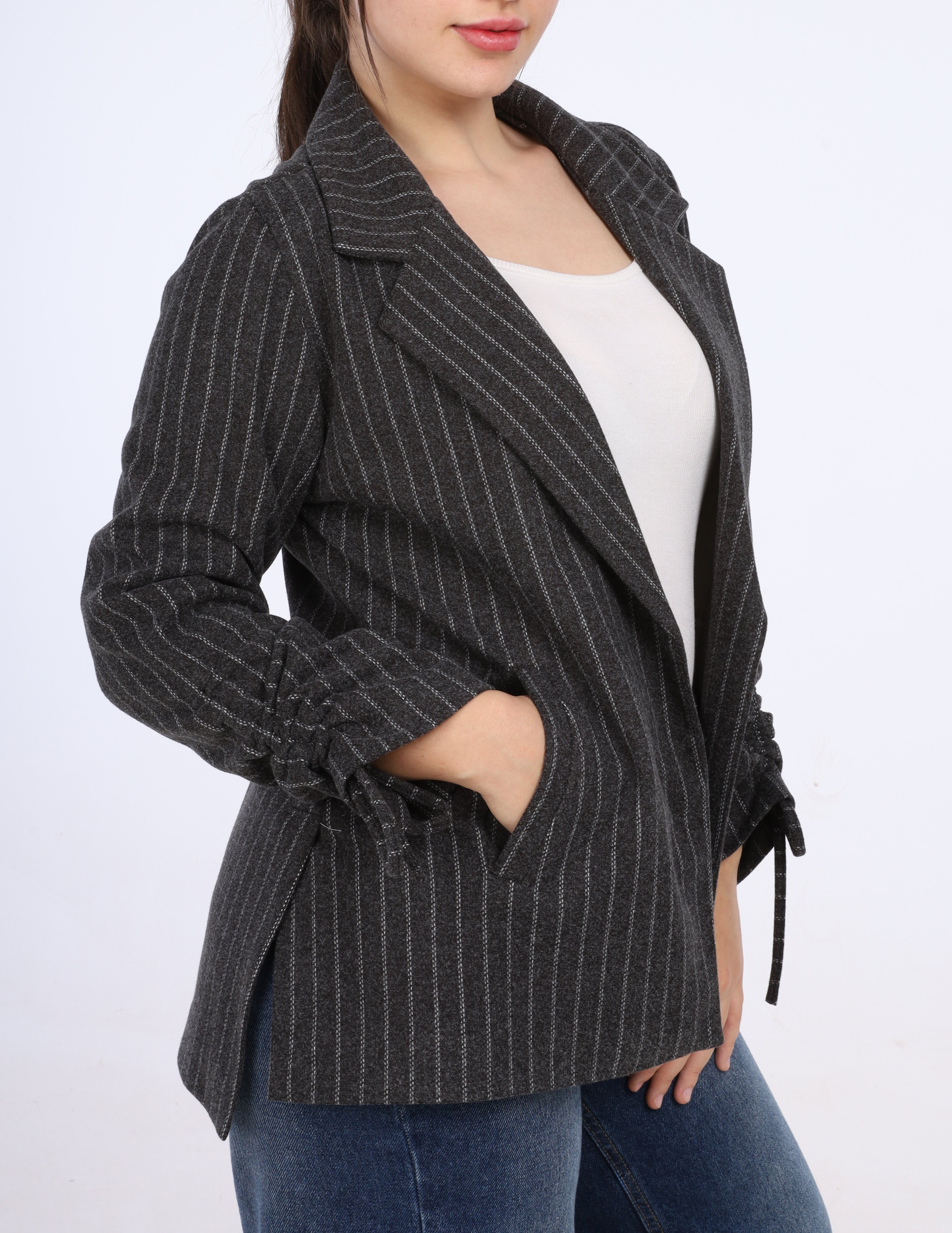 A striped blazer with ruffled sleeves and a feminine touch, functional, elegant for everyday looks.