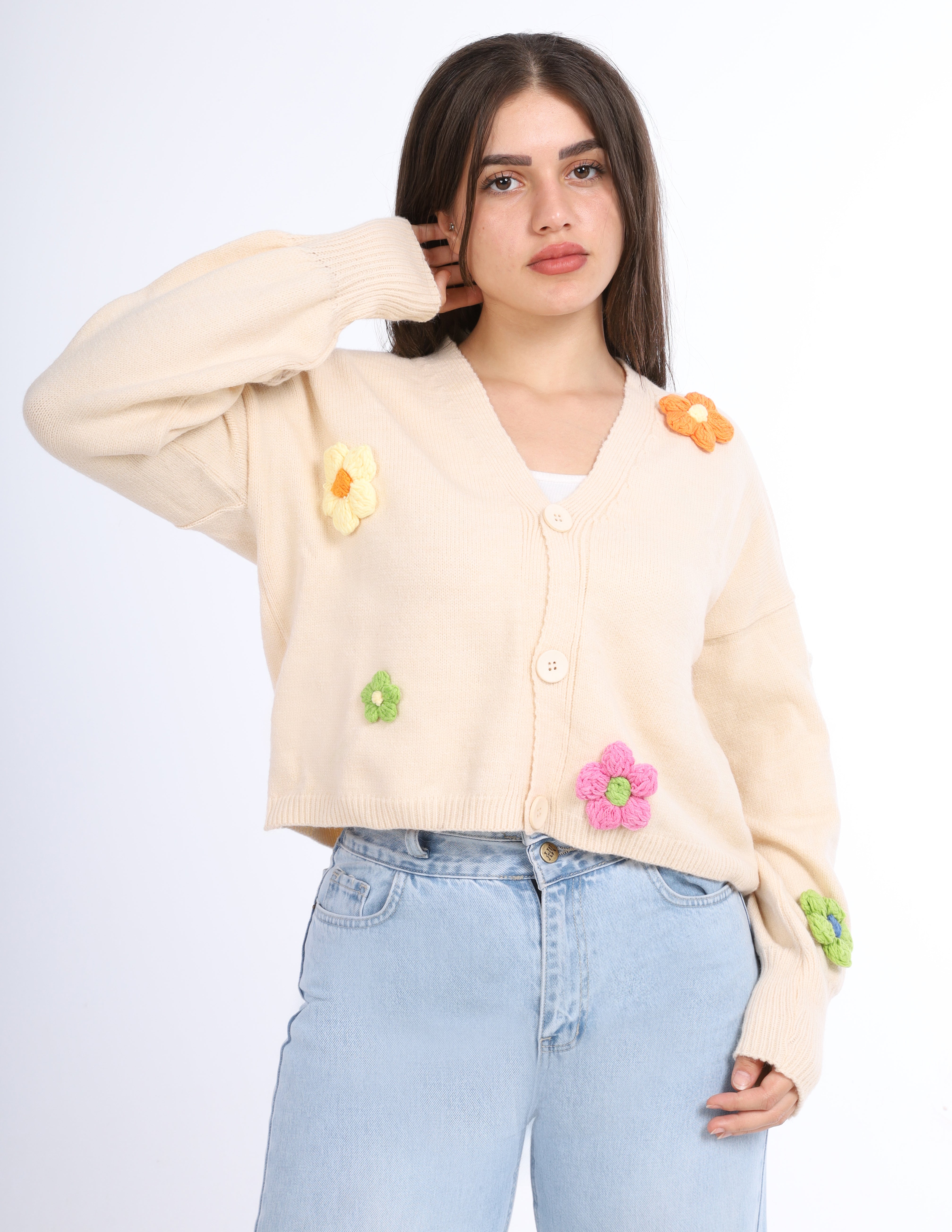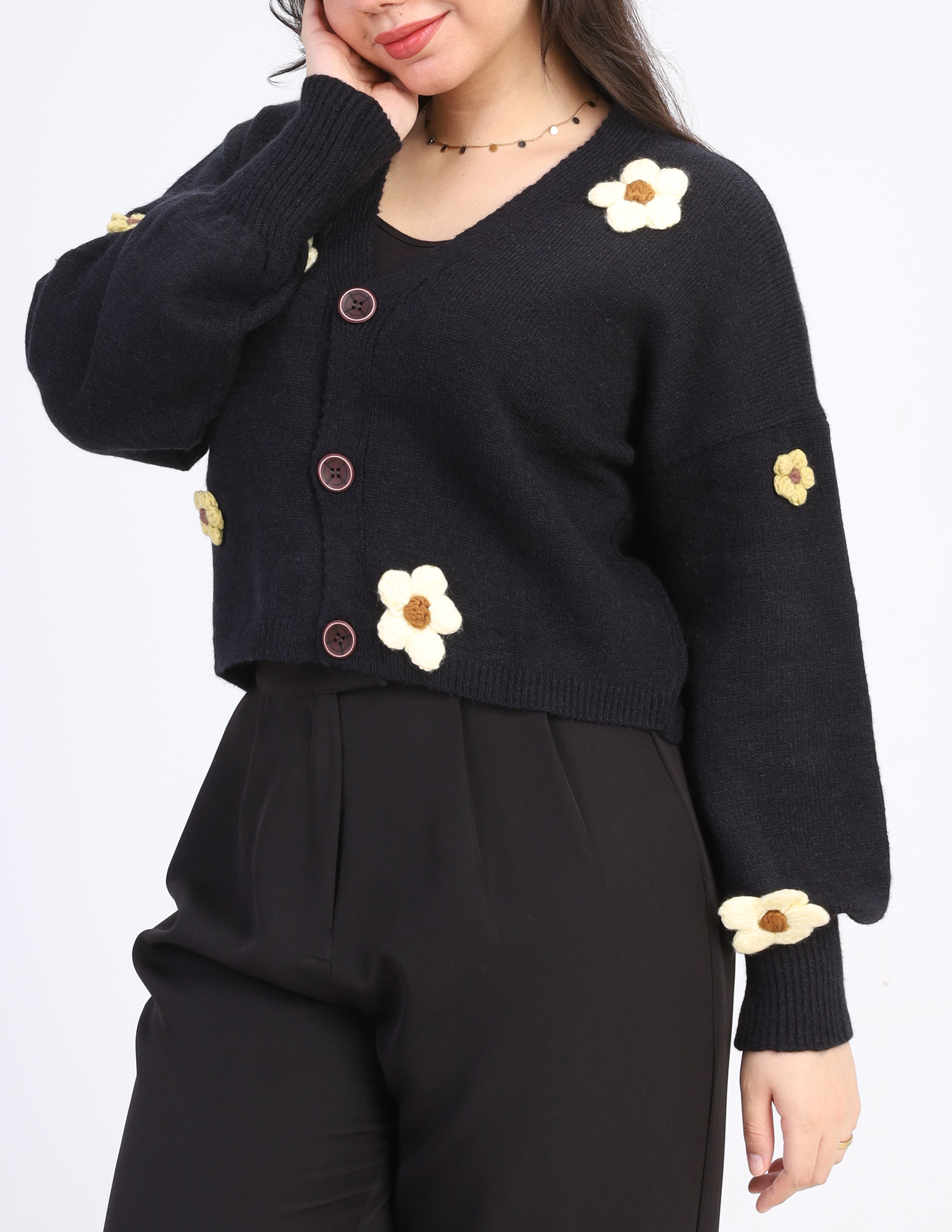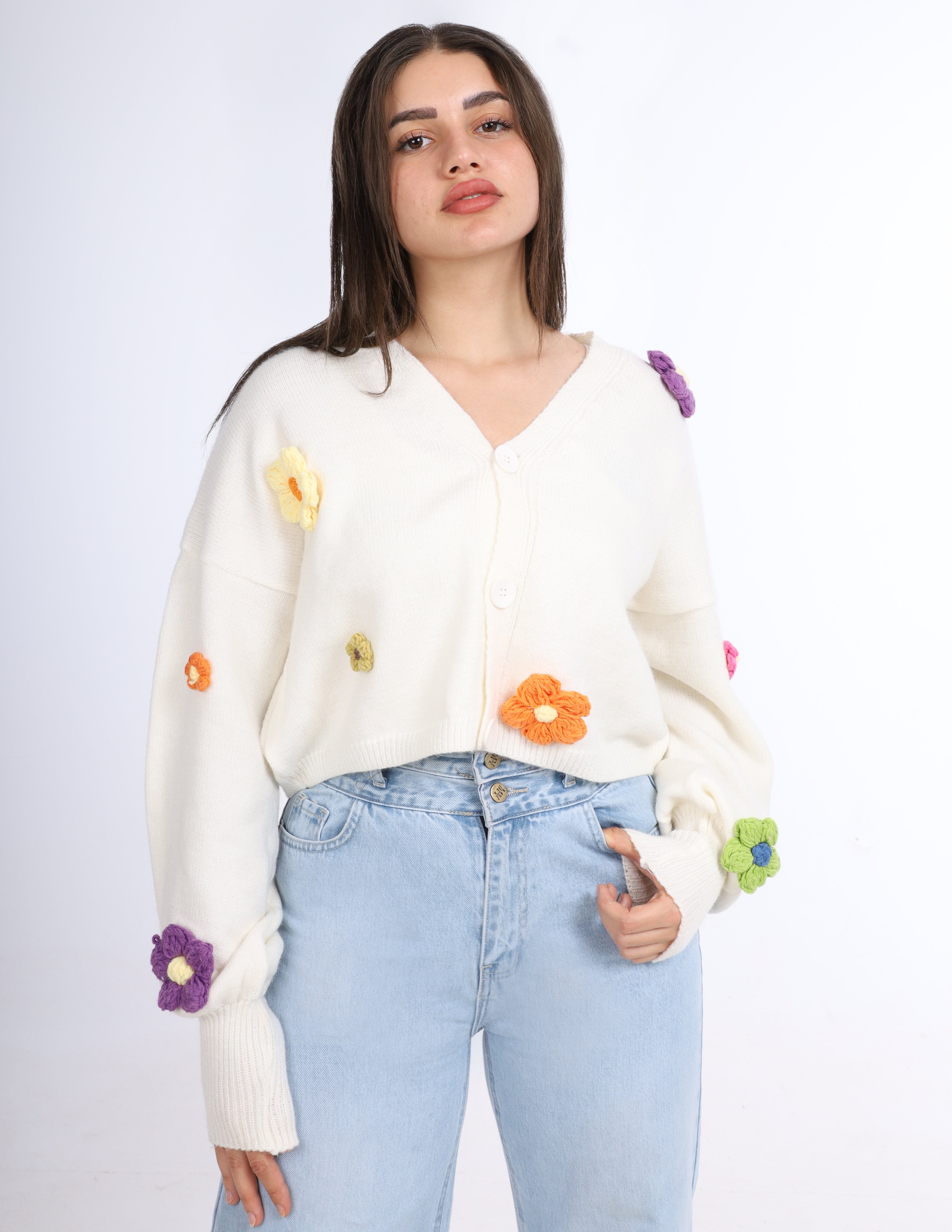 Soft cropped knit cardigan adorned with floral knit accents, adding a cute and feminine touch to your everyday look.