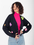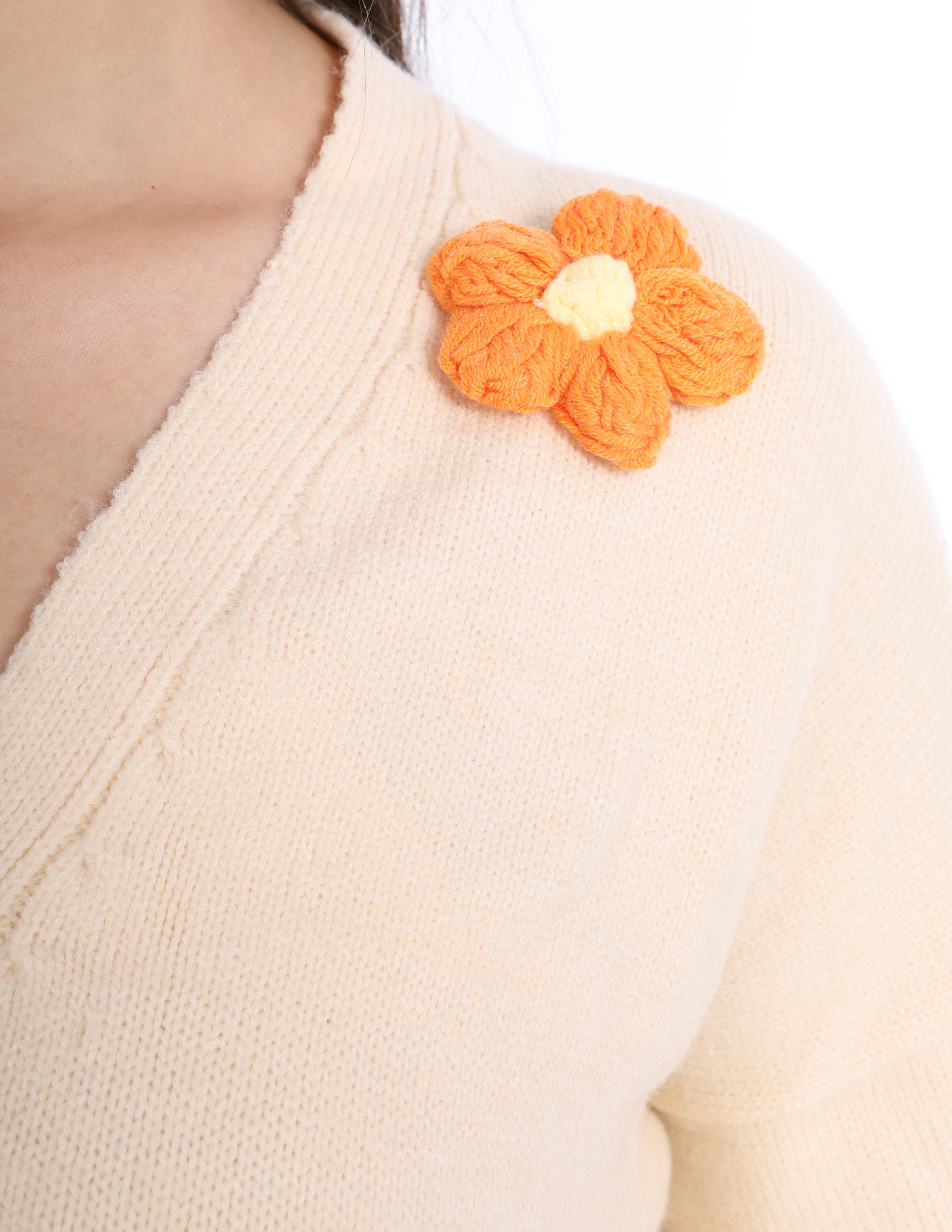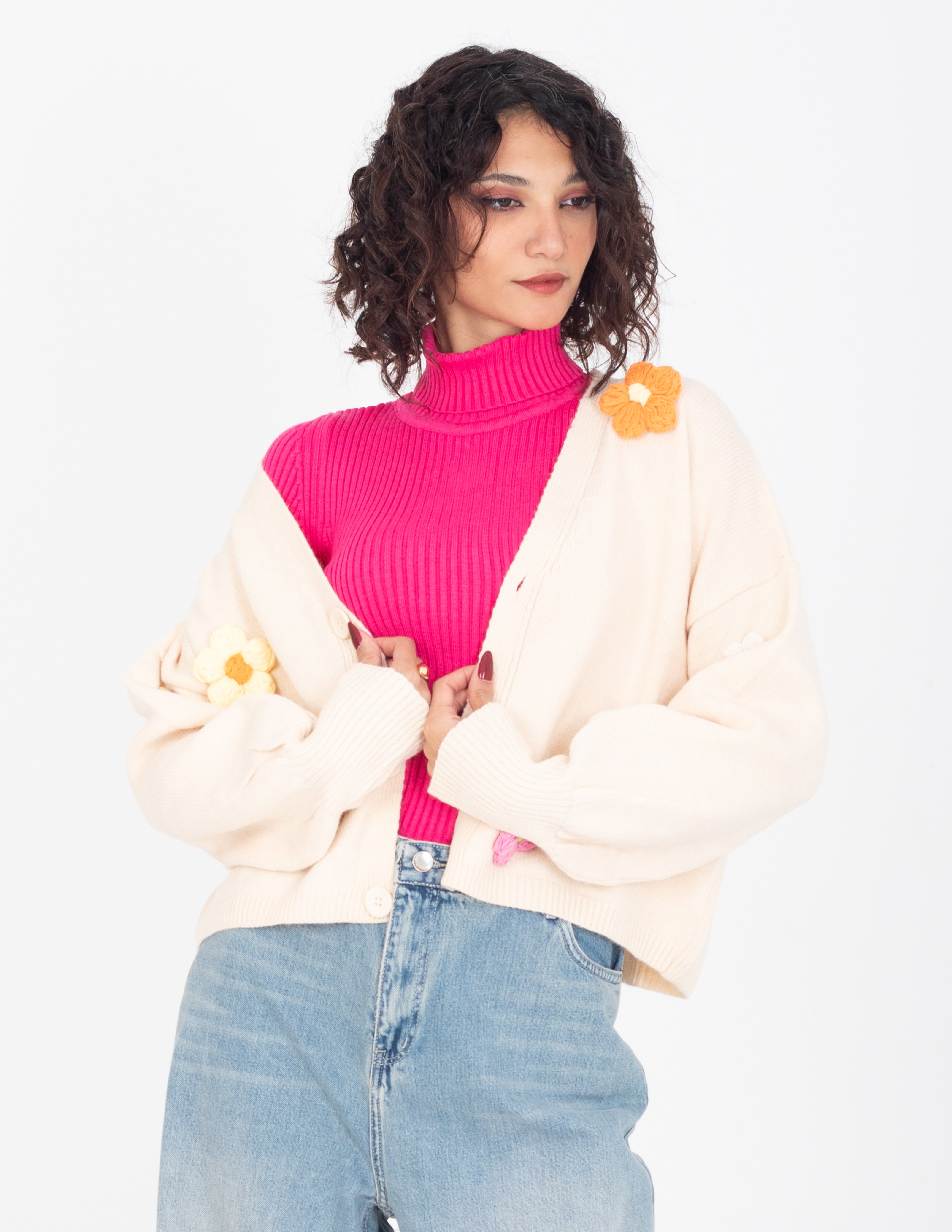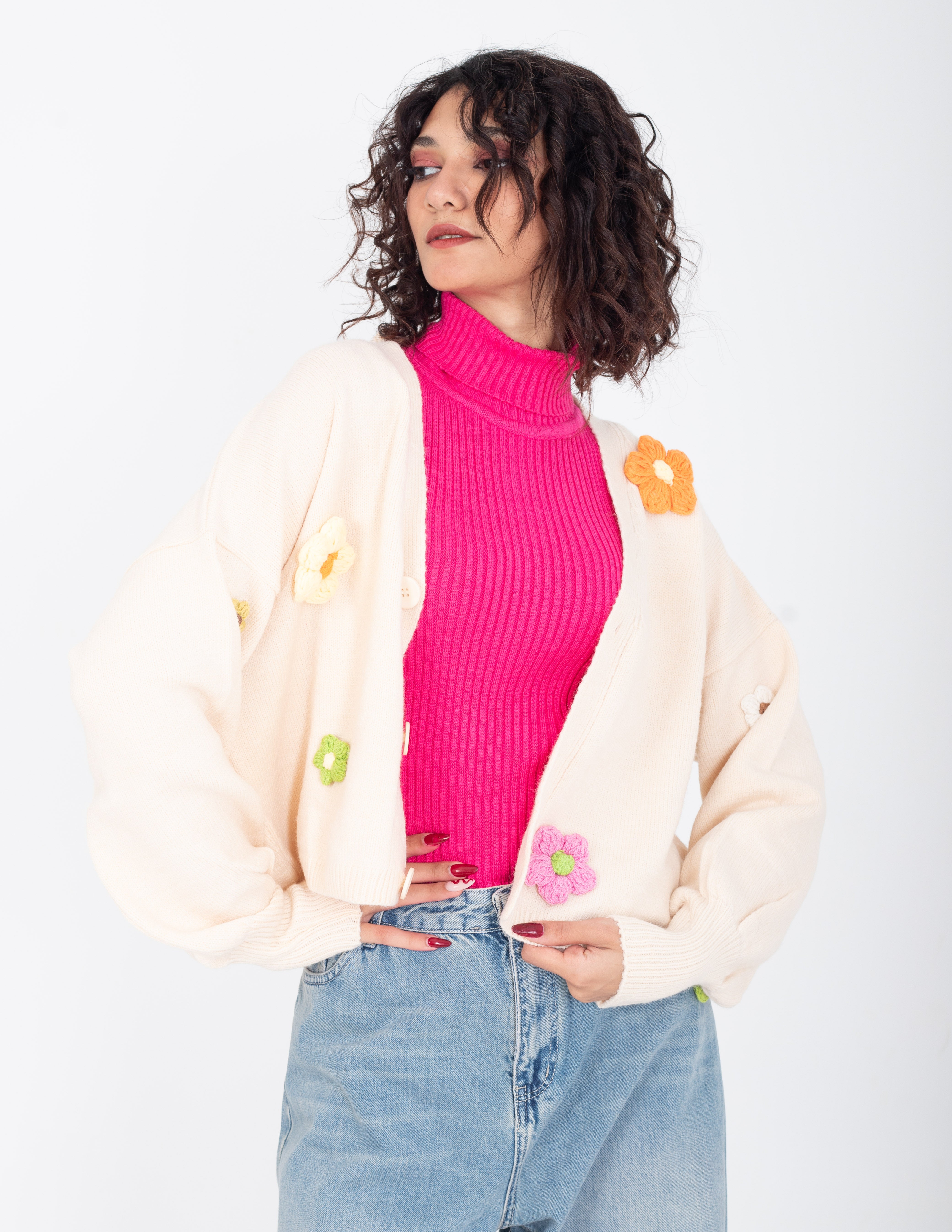 Soft cropped knit cardigan adorned with floral knit accents, adding a cute and feminine touch to your everyday look.