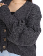 textured knit cardigan designed for everyday warmth and style. Features a soft feel, front buttons for easy layering