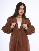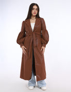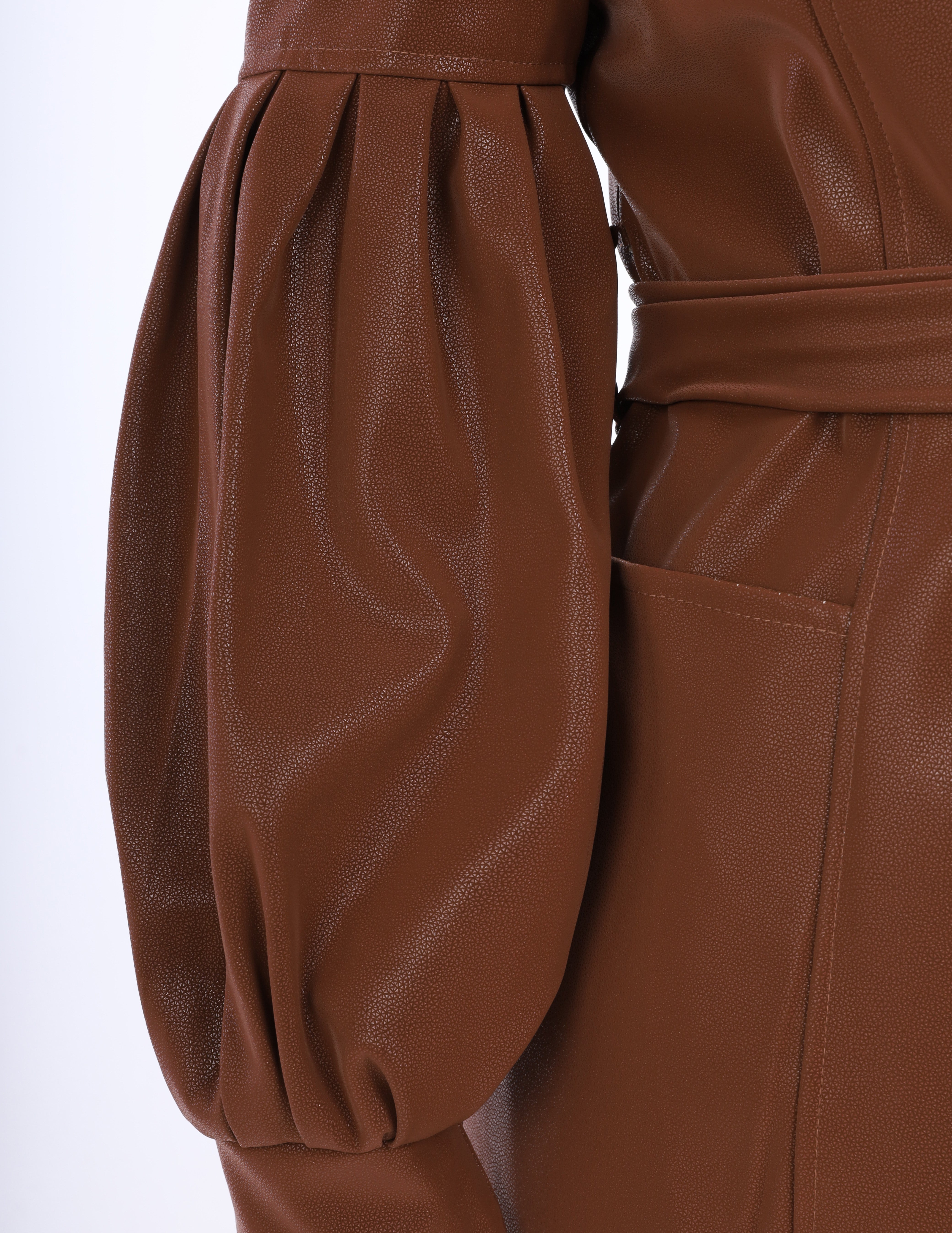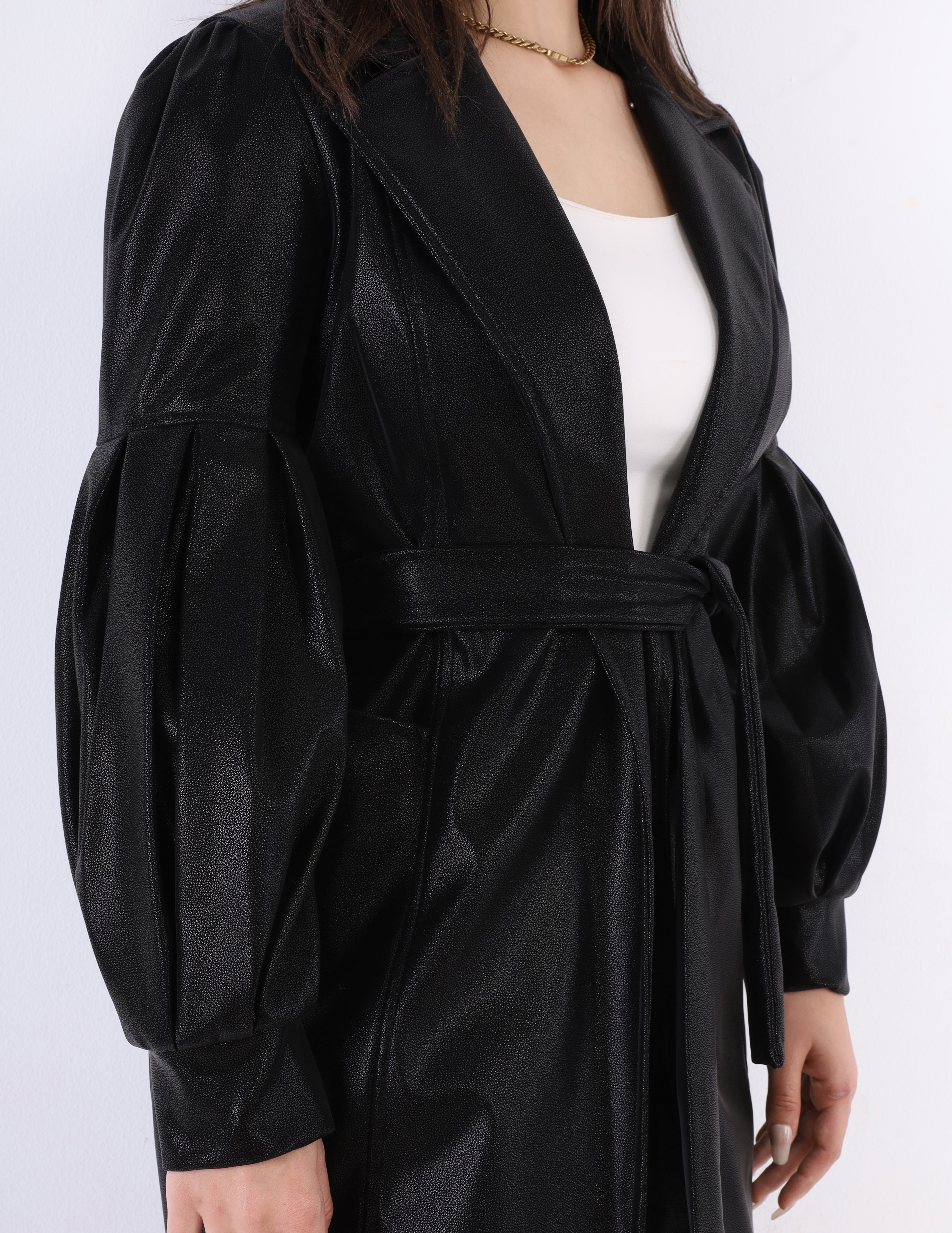 A luxe maxi leather coat with a soft textured feel, puffed sleeves, and a flattering belted waist