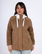 A cozy and chic hooded jacket featuring a zip-up front and side pockets for extra comfort.
