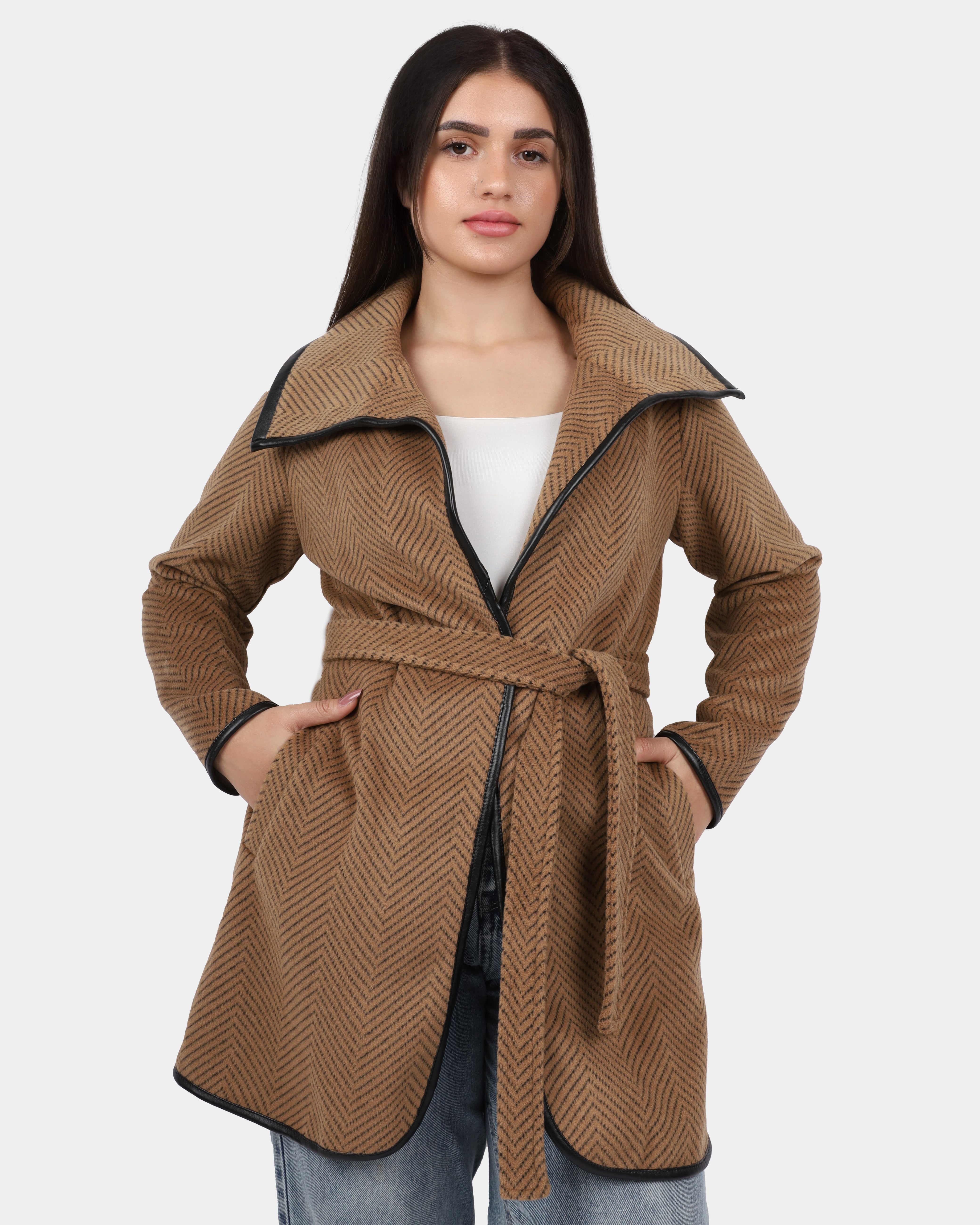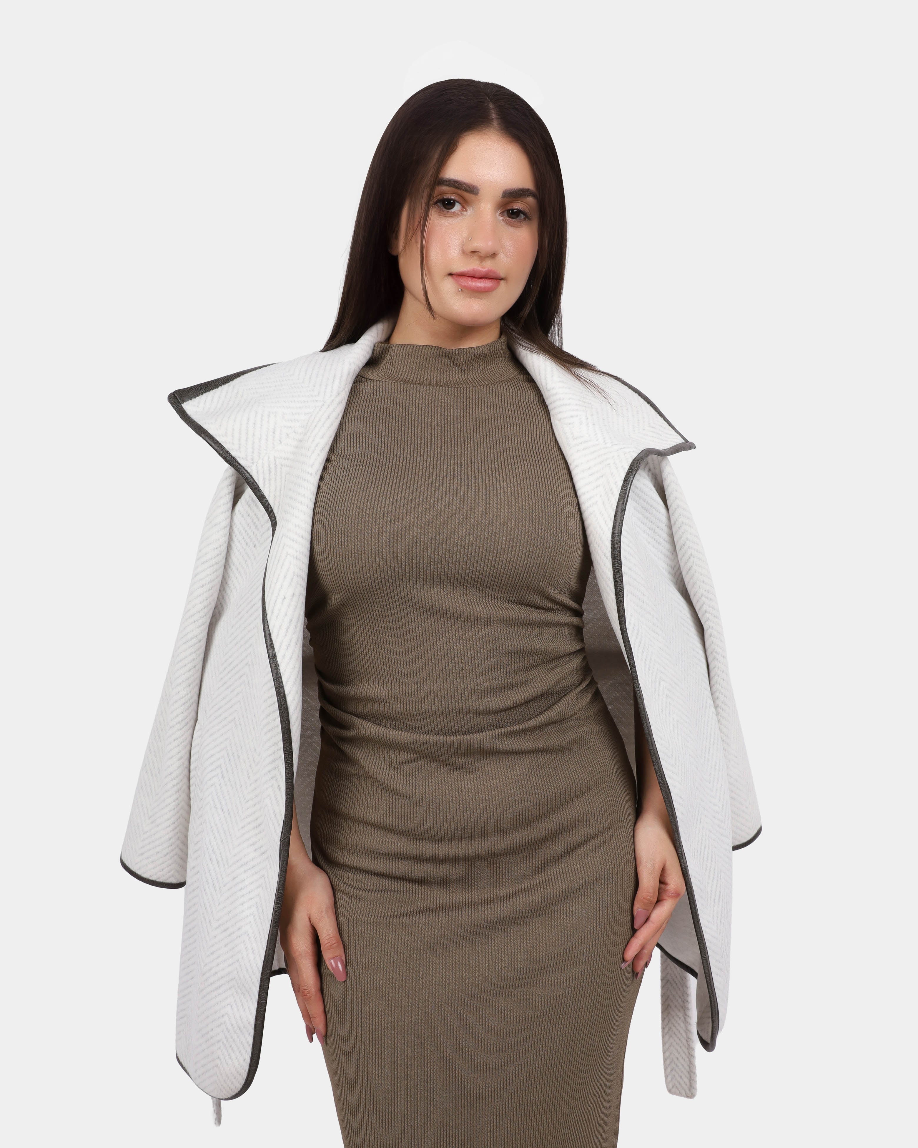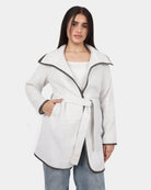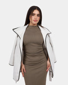 A sleek lightweight jacket featuring an open-front design with subtle contrast trim details. Perfect for layering over dresses or casual outfits.