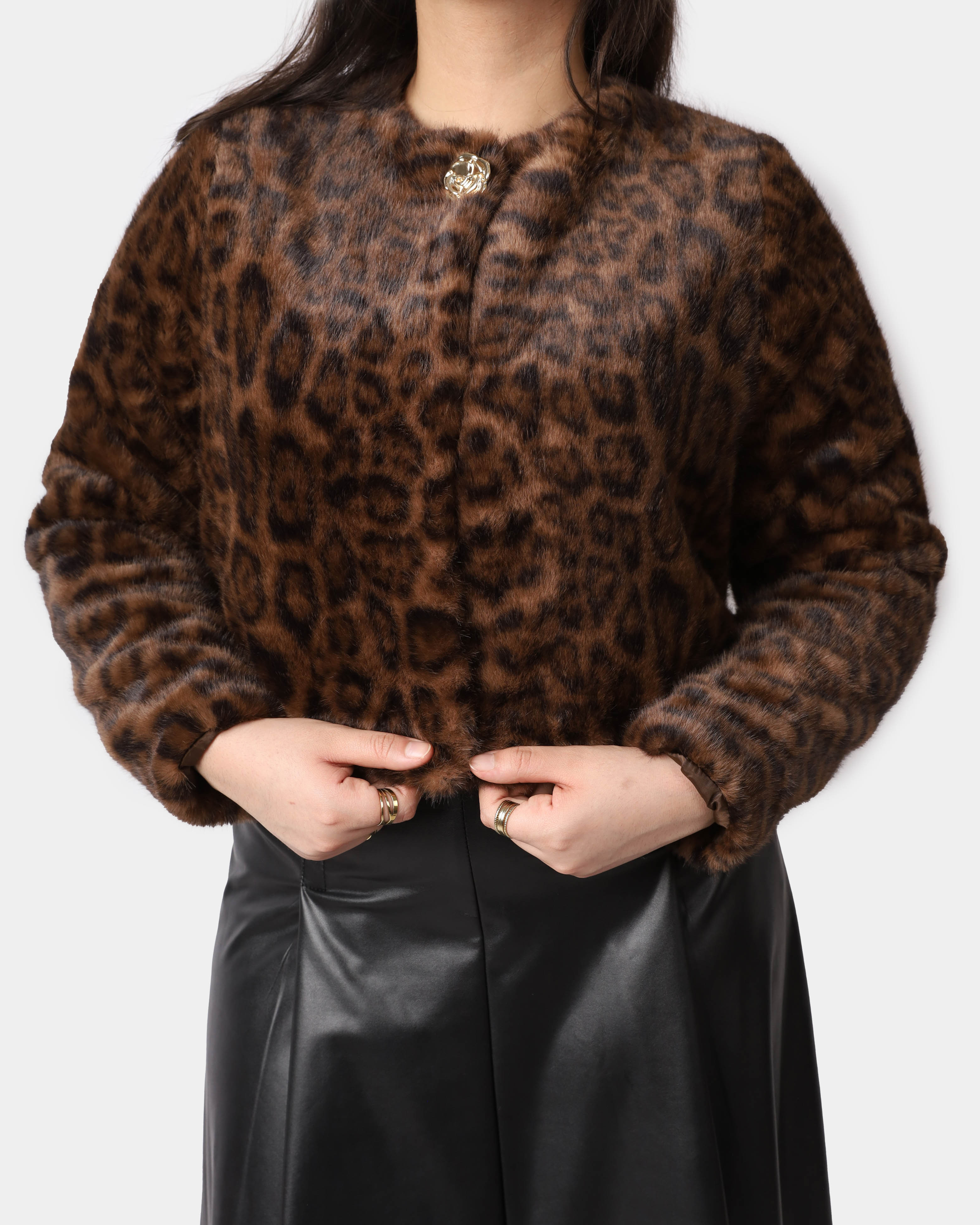 stylish short jacket in leopard print faux-fur, perfect for making a statement while staying cozy.
