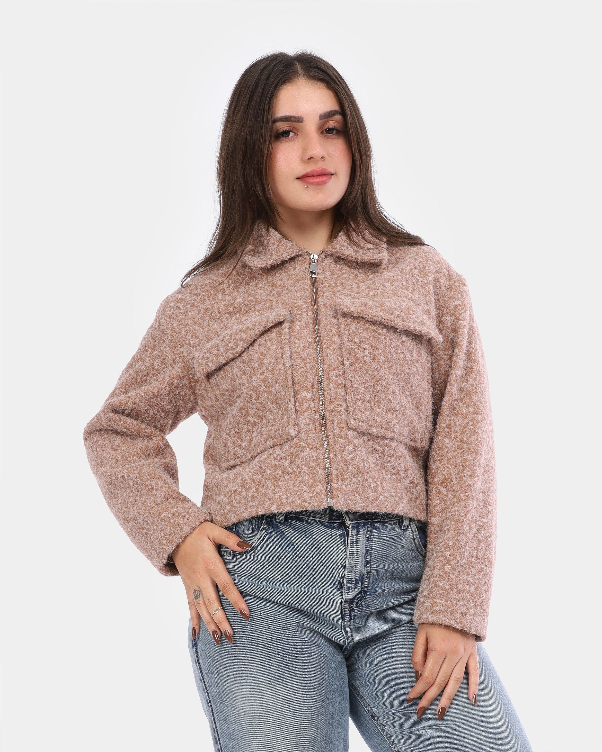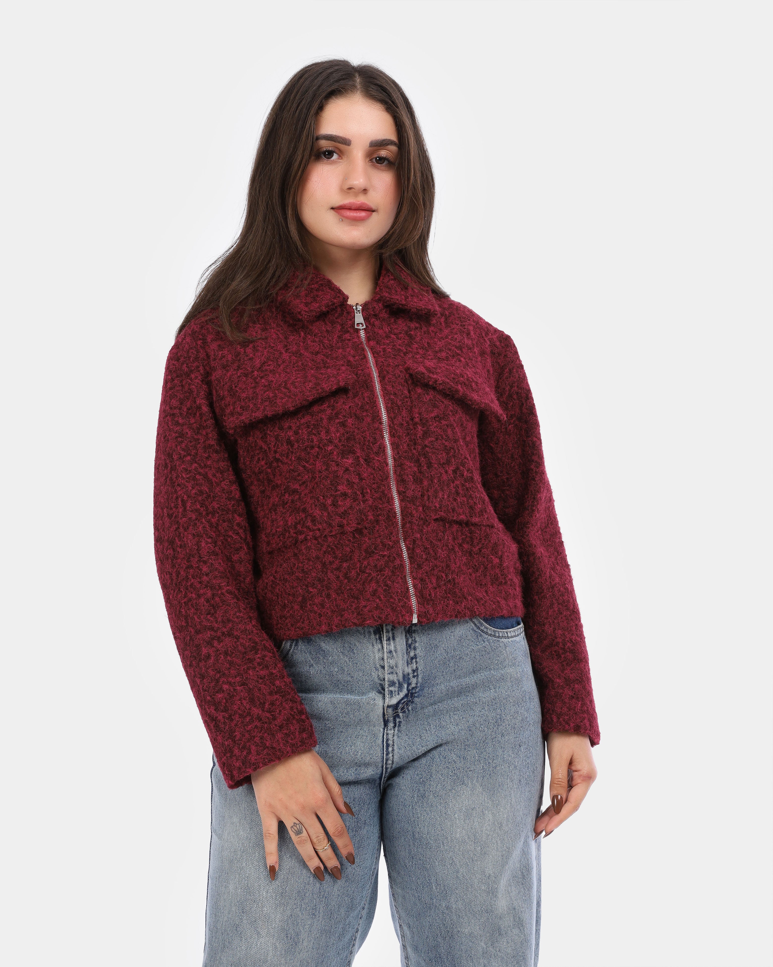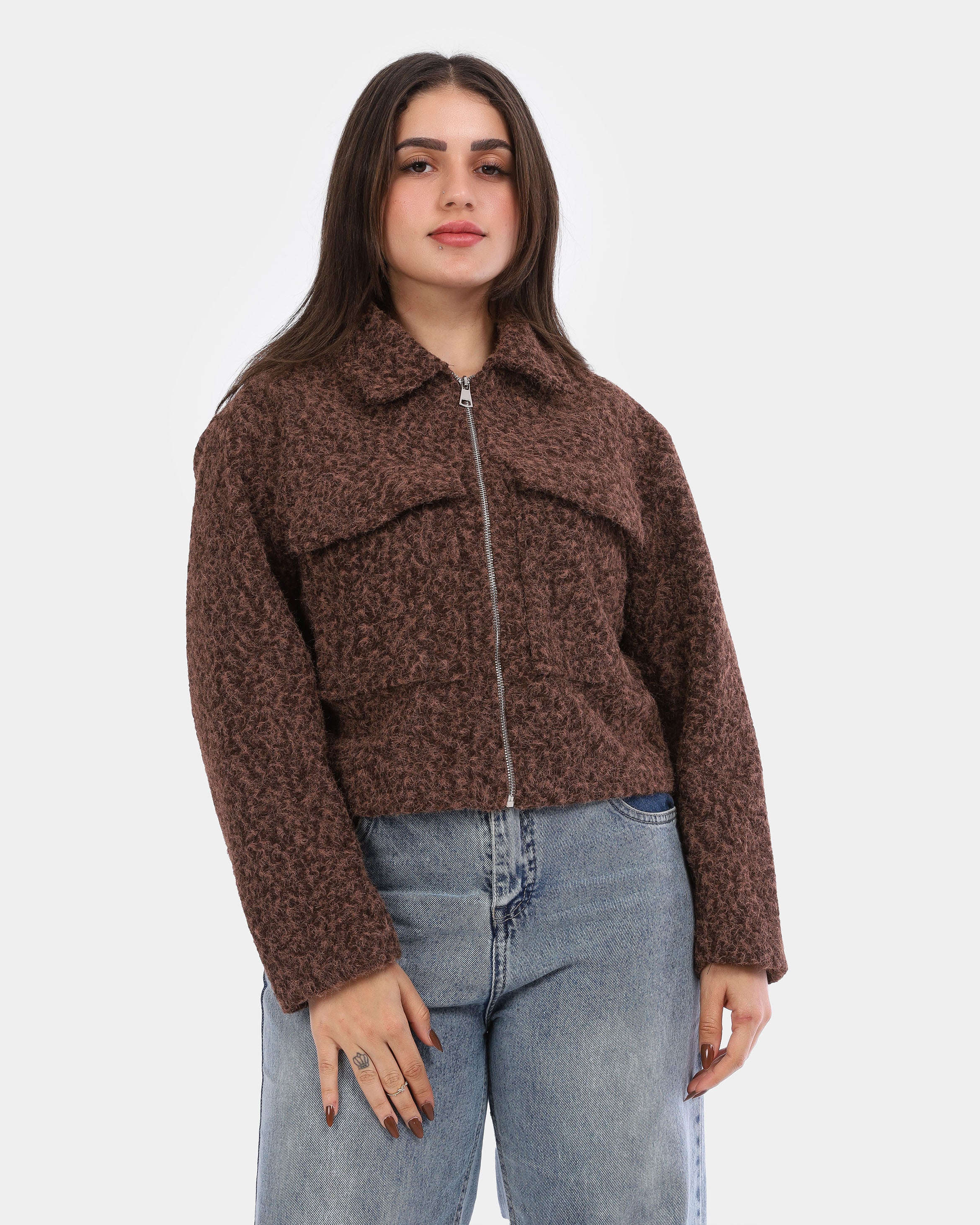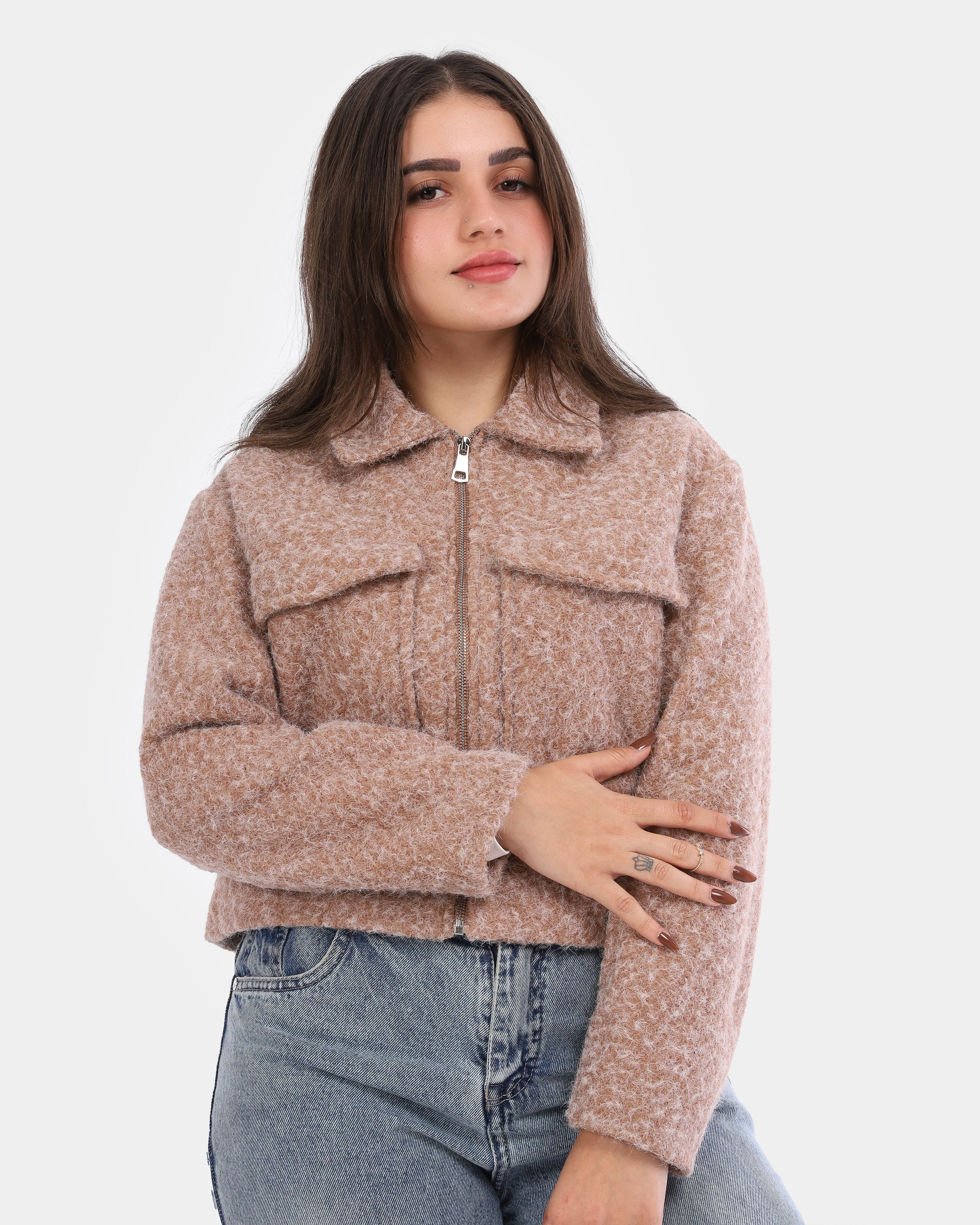 A cropped textured wool jacket featuring soft fleece-like fibers for a warm and stylish look.