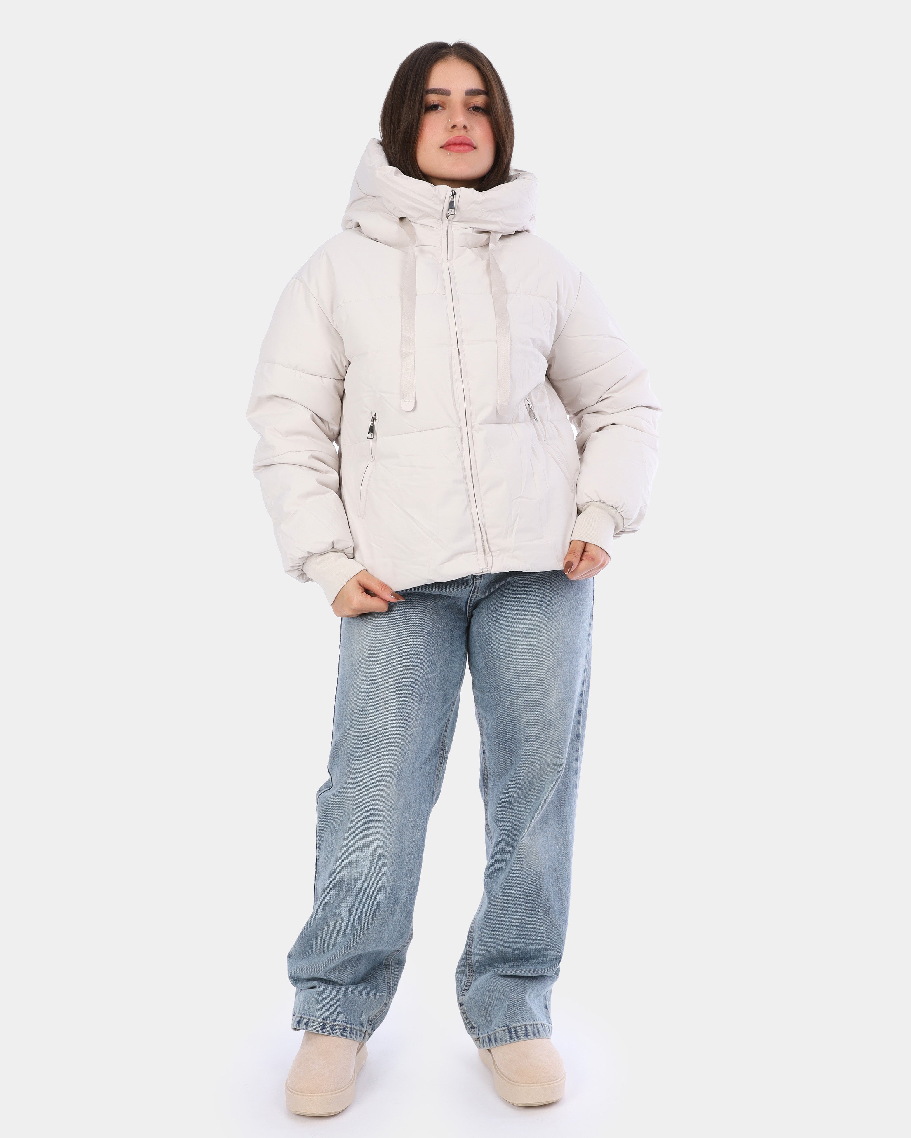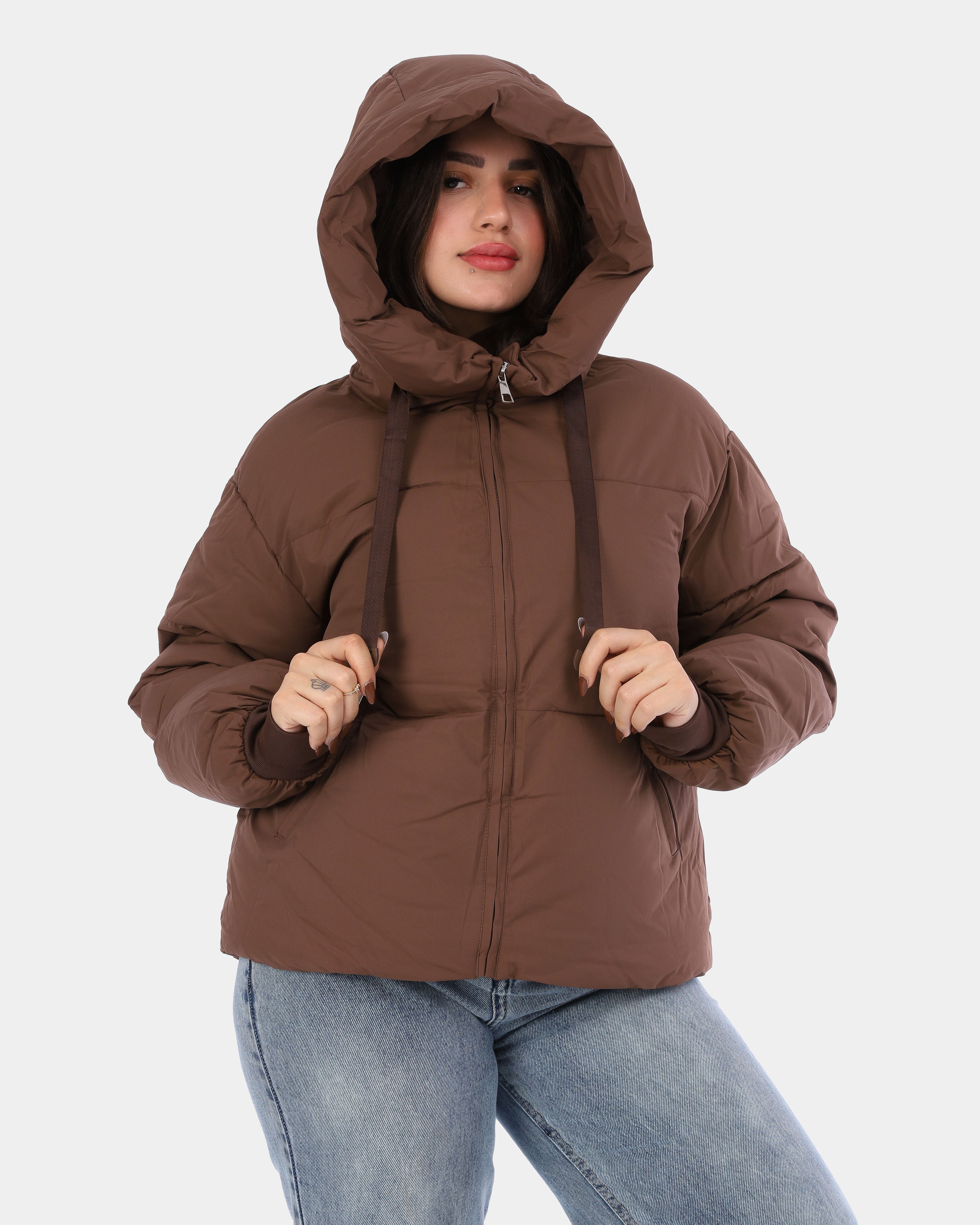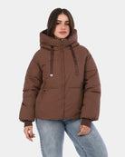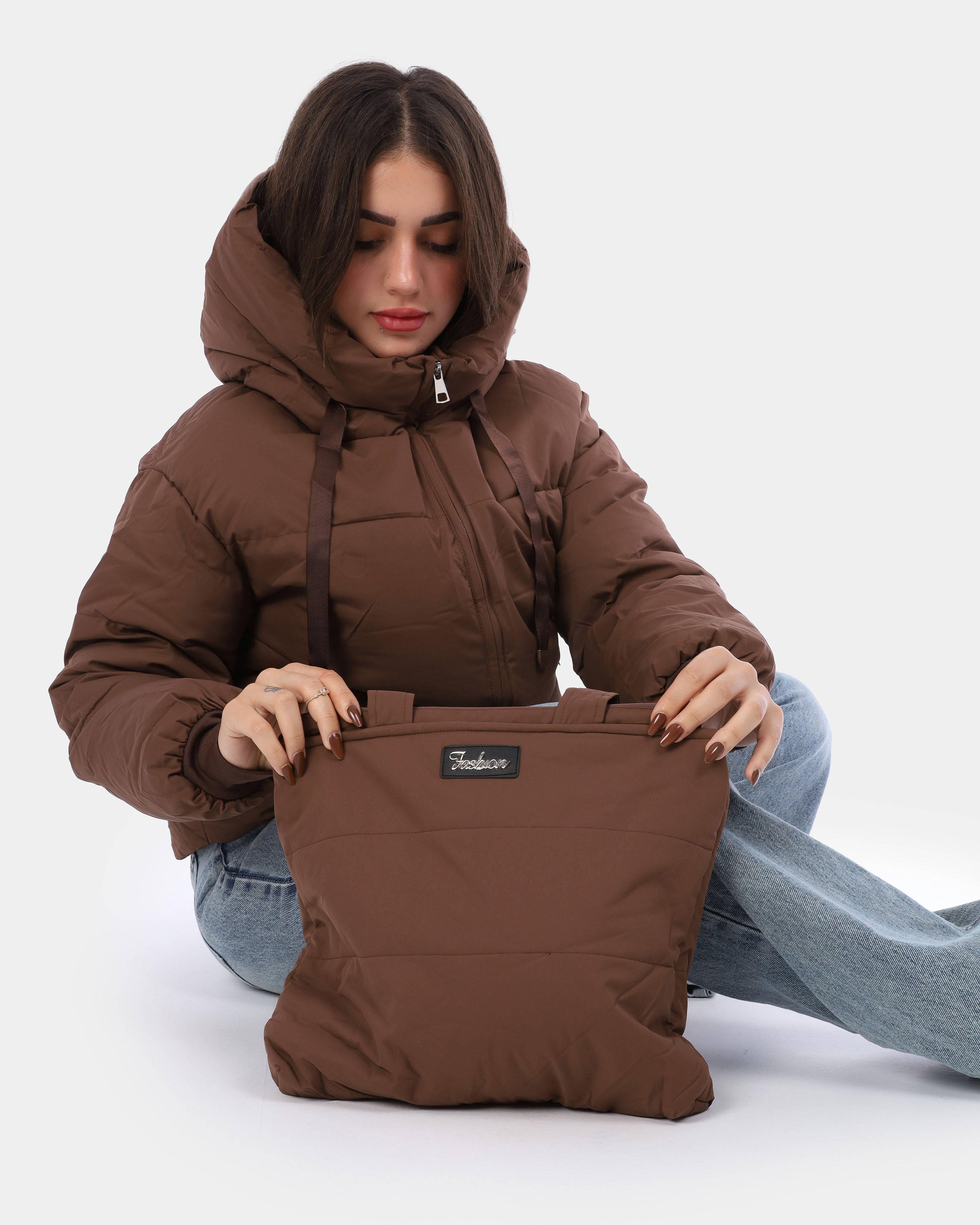 Stay warm and chic with this waterproof puffer jacket, paired with a matching tote bag