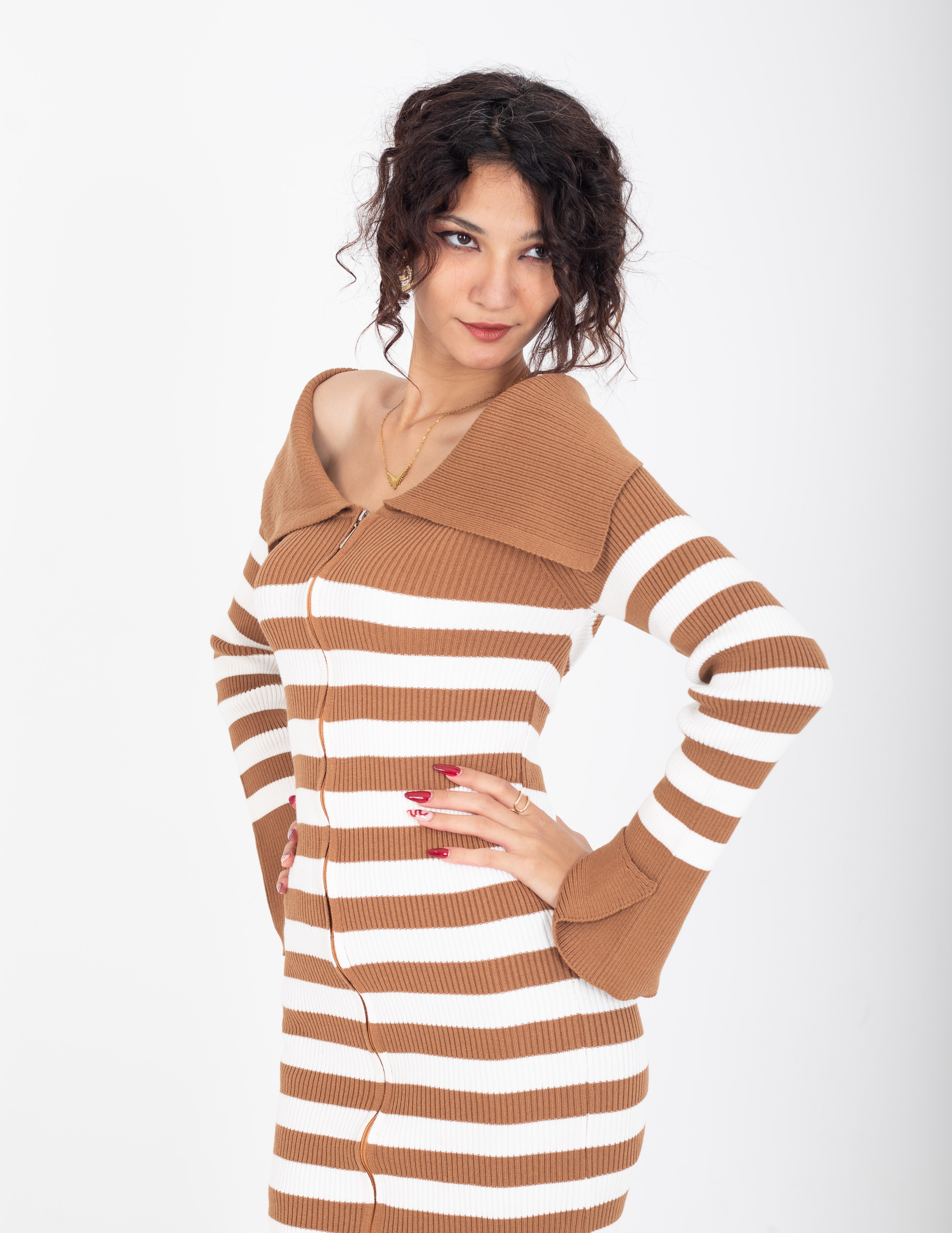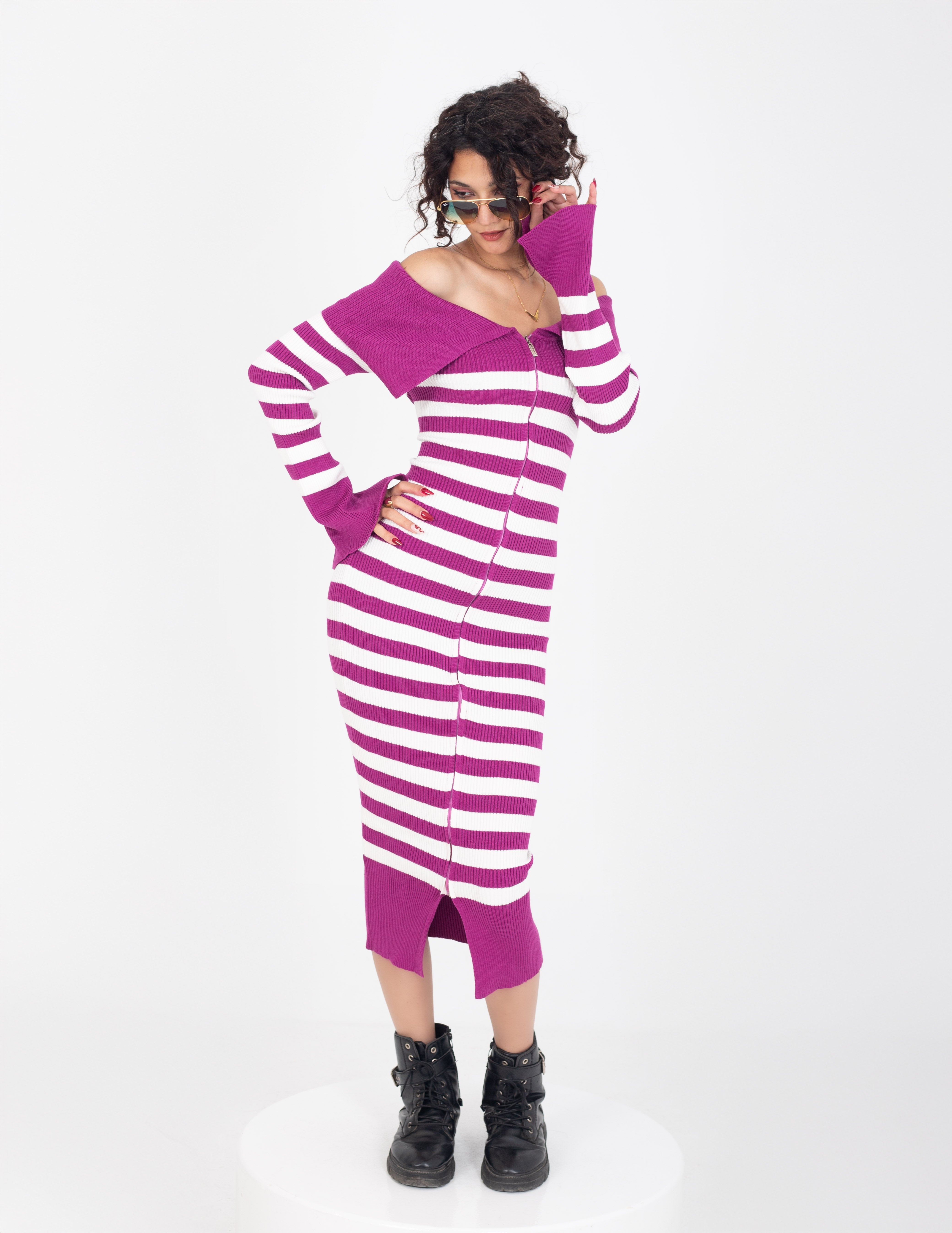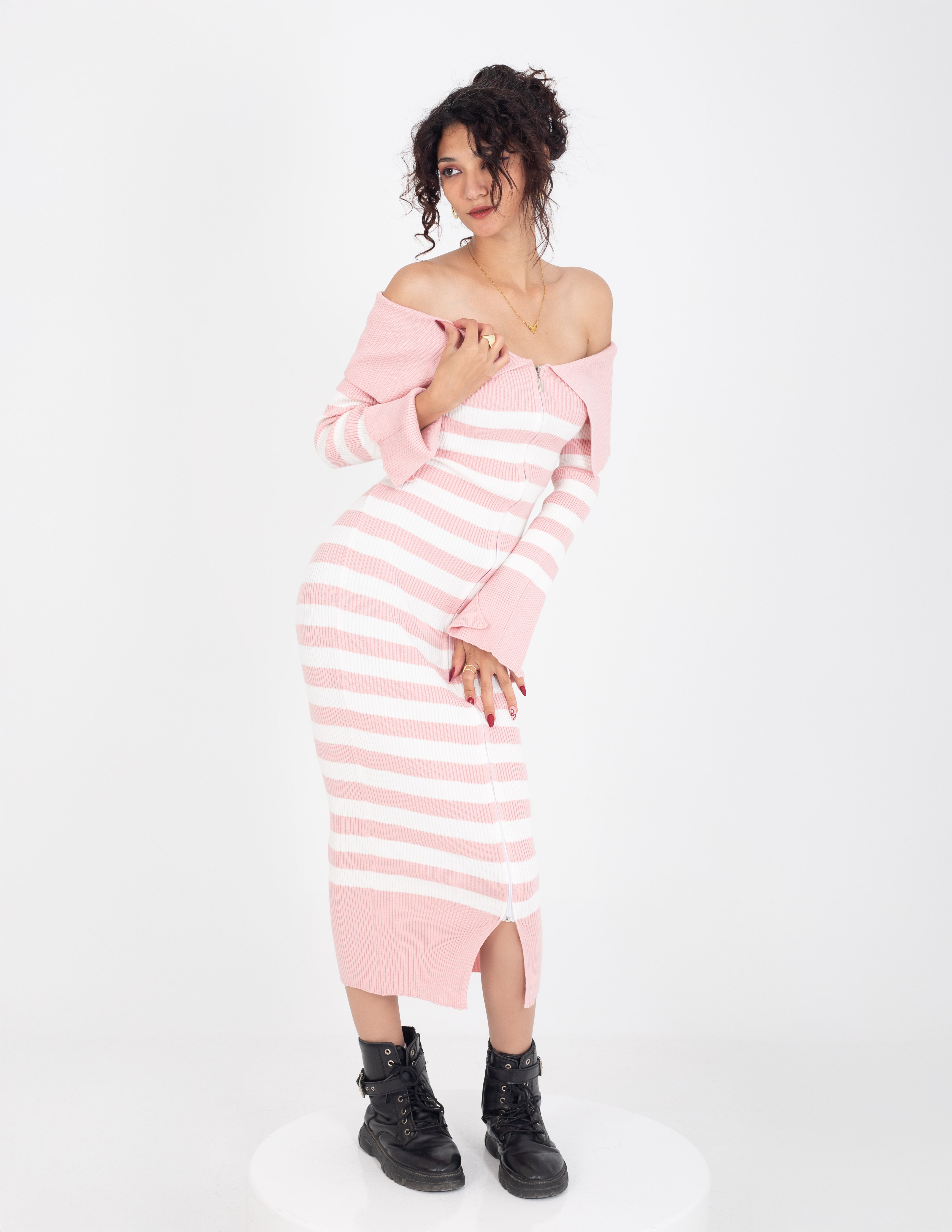 Striped Off-Shoulder Maxi Dress with Front Zipper  w16252634