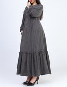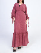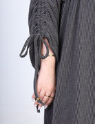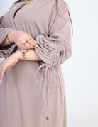 Elegant textured maxi dress, designed for both comfort and style. It features long ruched sleeves with drawstring ties, a flattering V-neckline, and a cinched waist that beautifully defines your shape