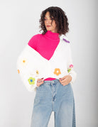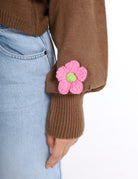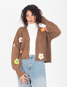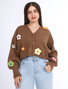 Soft cropped knit cardigan adorned with floral knit accents, adding a cute and feminine touch to your everyday look.