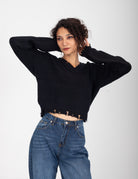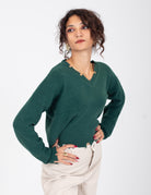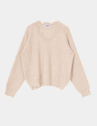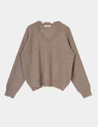 A casual V-neck pullover featuring distressed detailing along the edges for a laid-back, vintage look