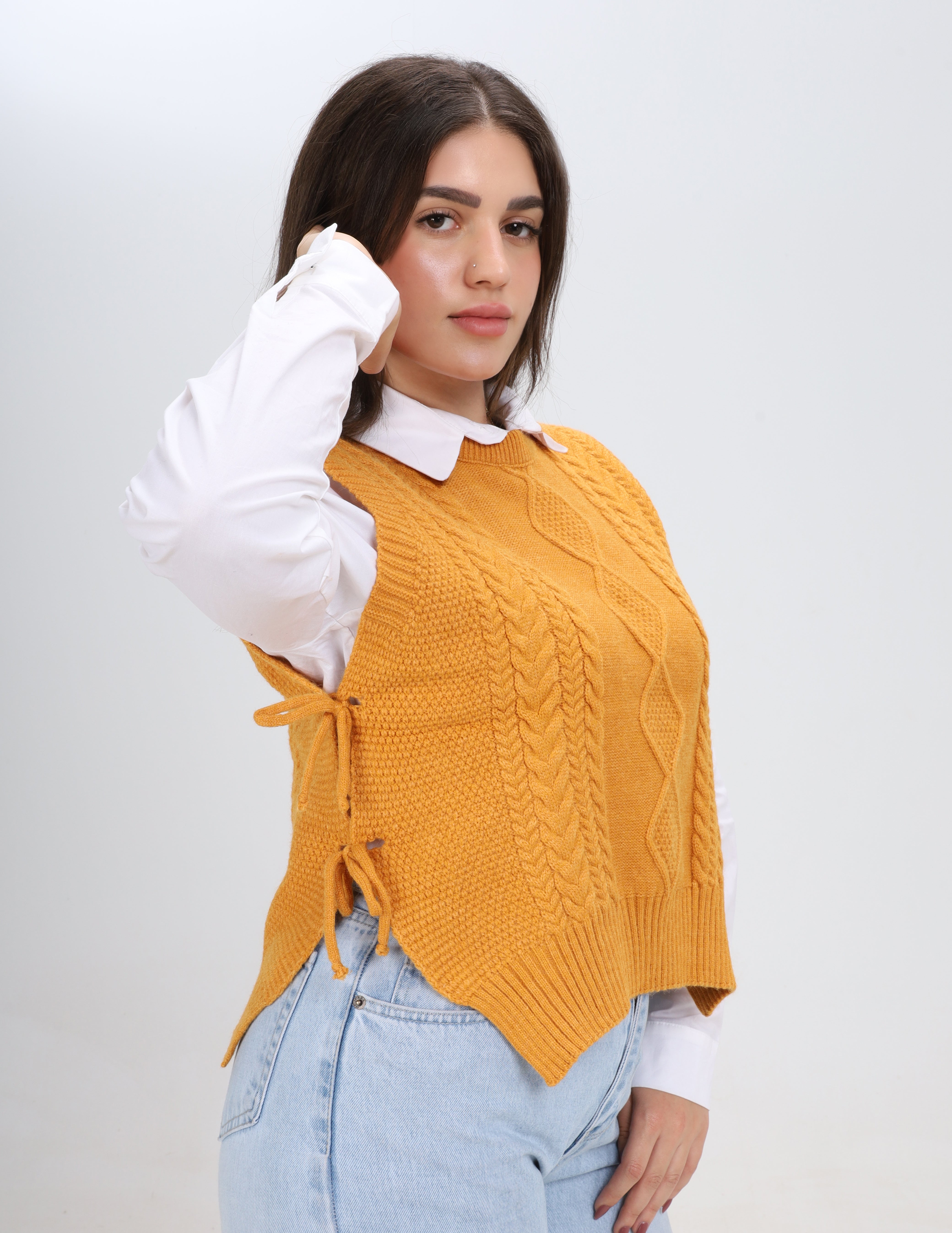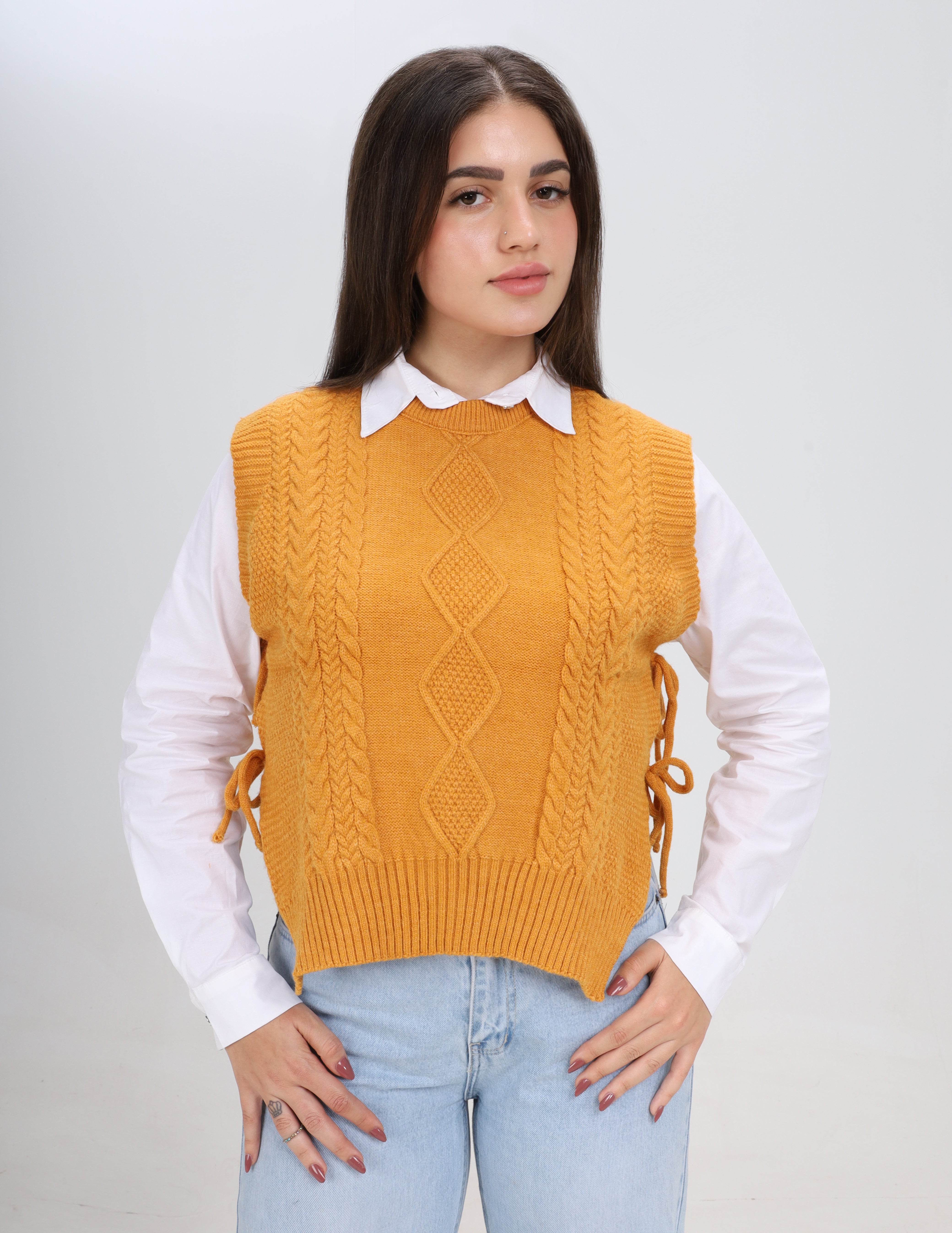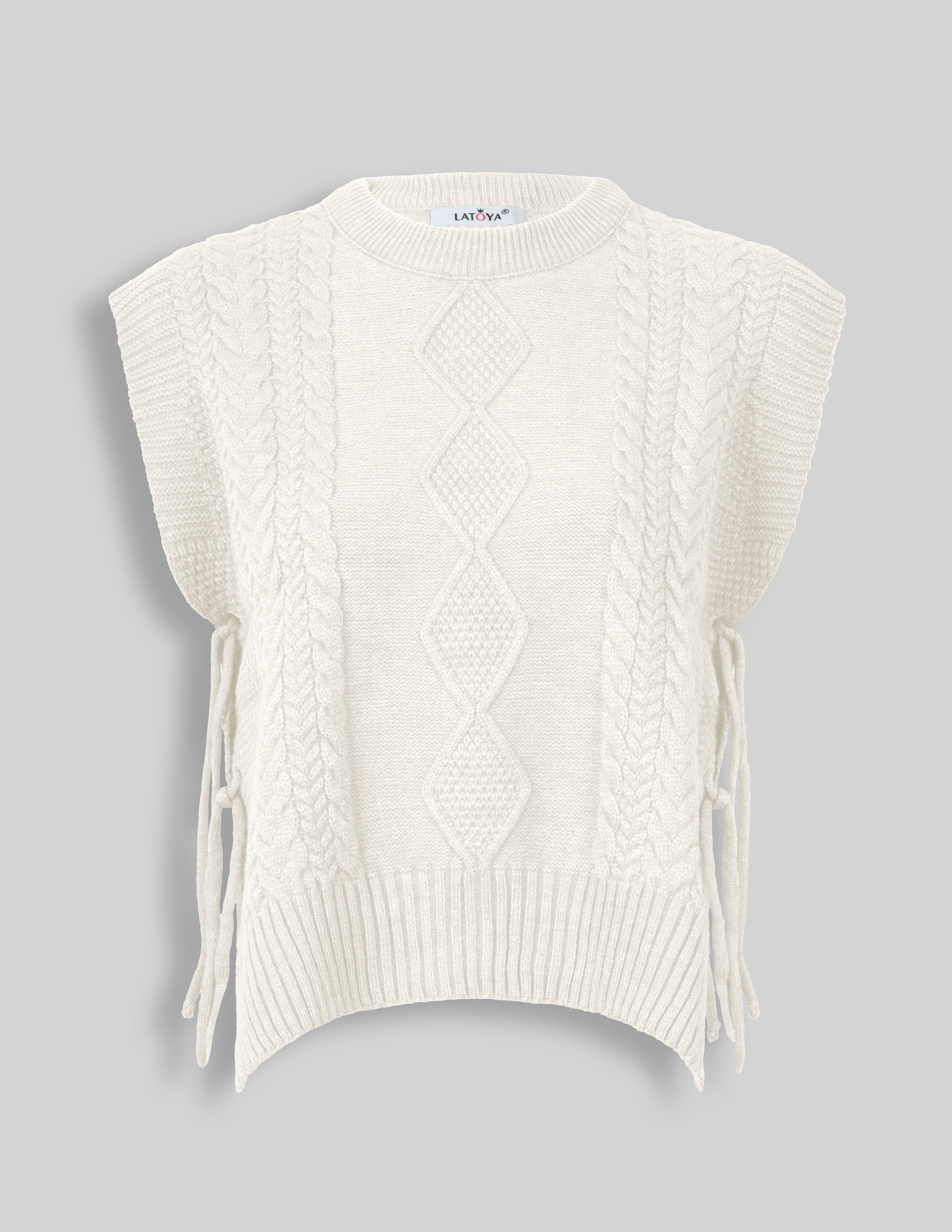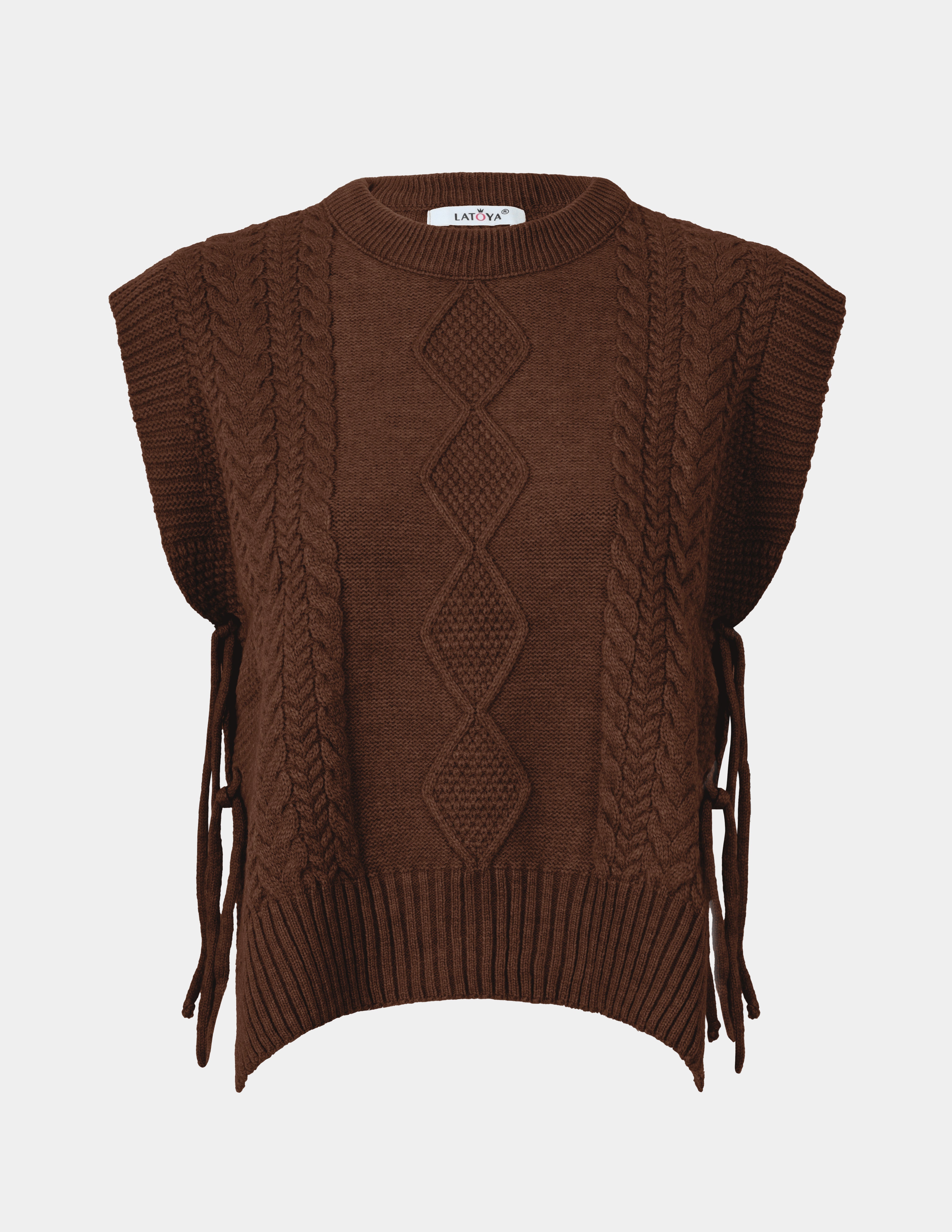 A soft knitted sleeveless sweater featuring a chic side tie detail for an adjustable fit. Perfect for layering or styling solo for a modern, feminine look.