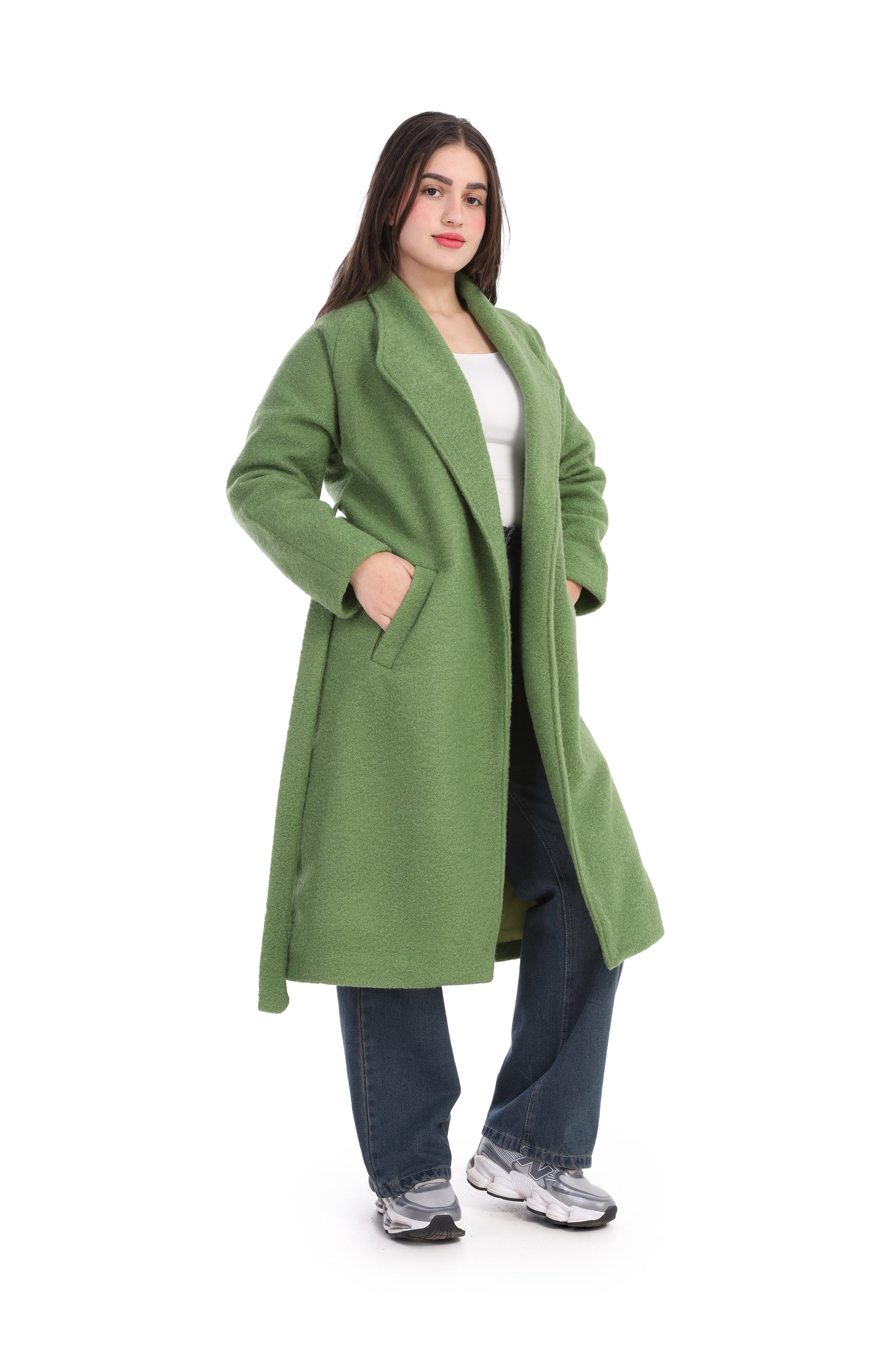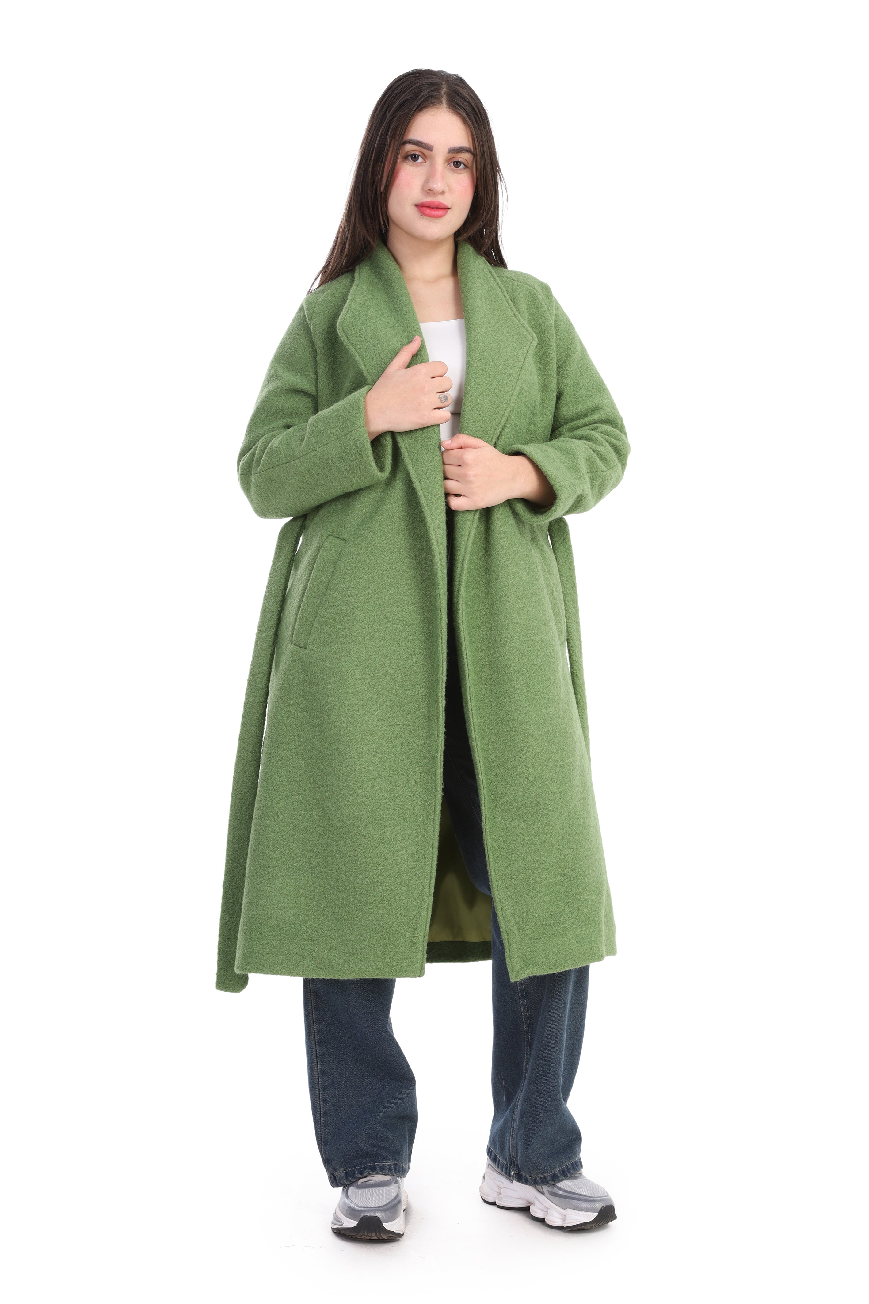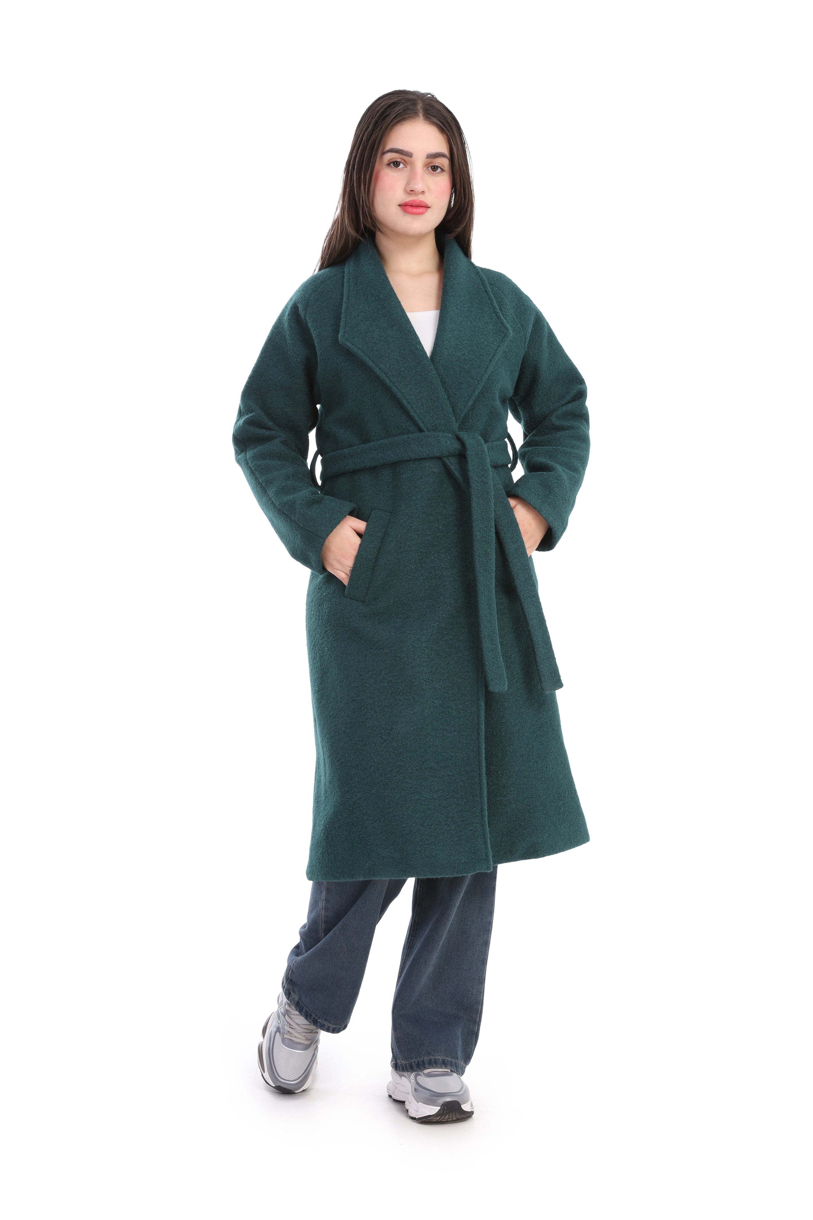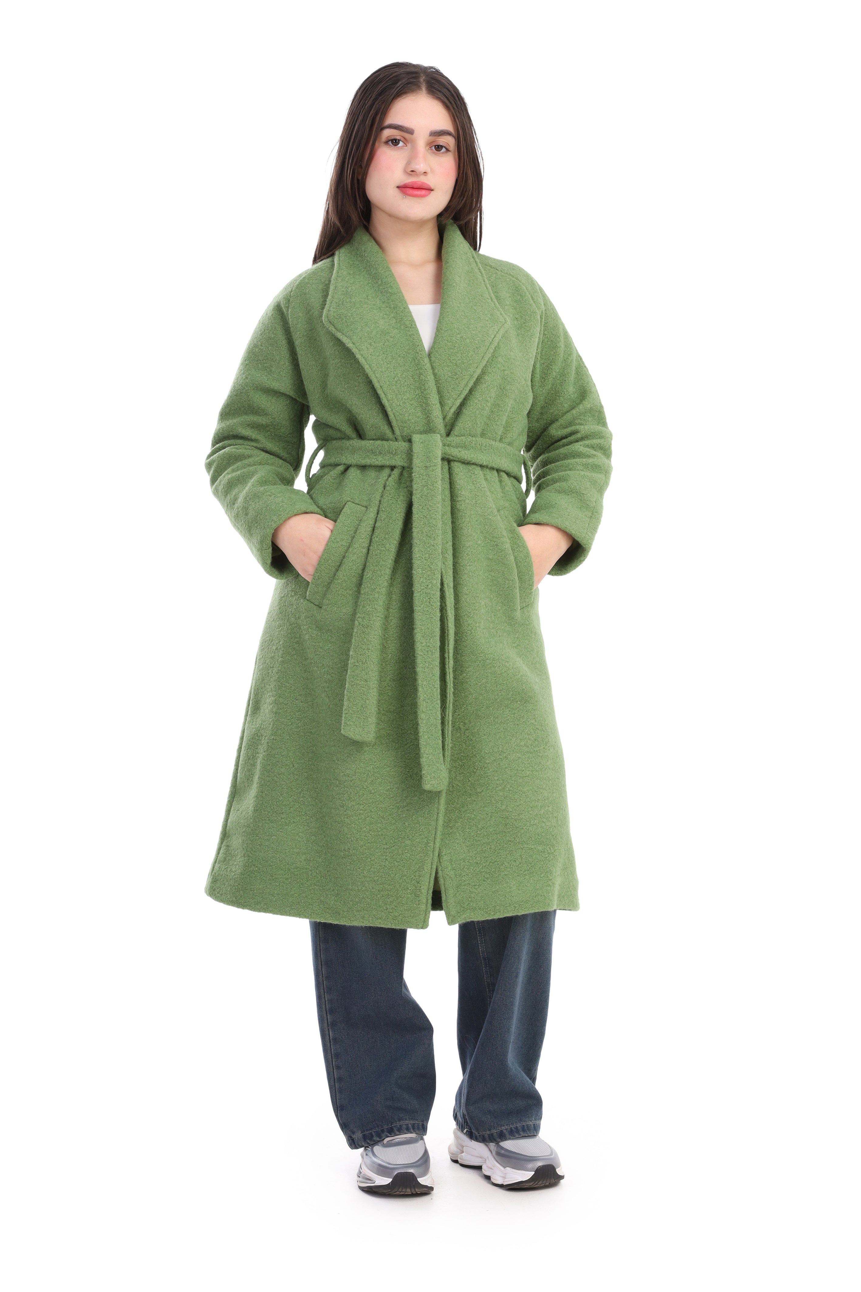 Elegant long wool coat featuring a flattering waist belt. Designed to combine warmth and sophistication.