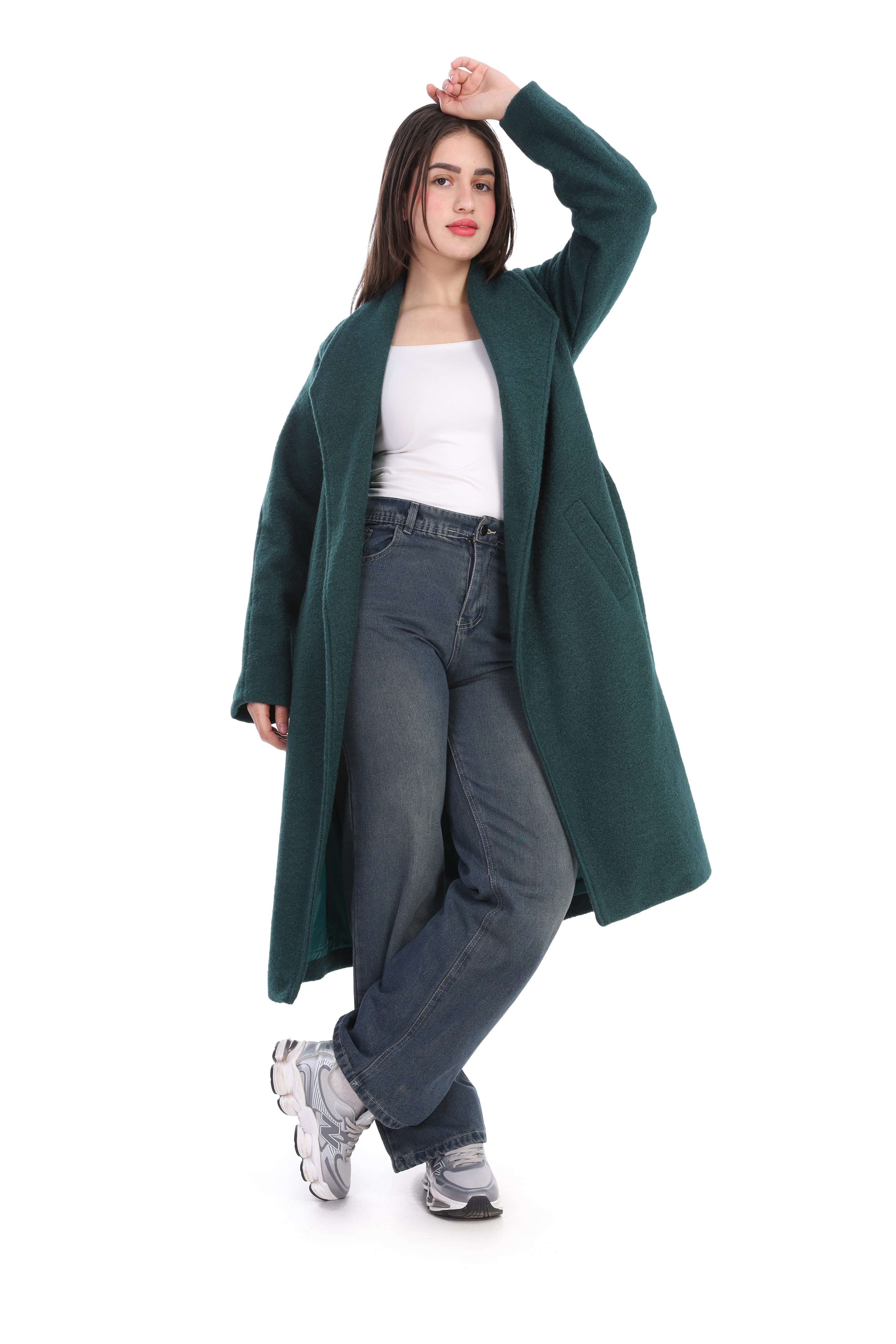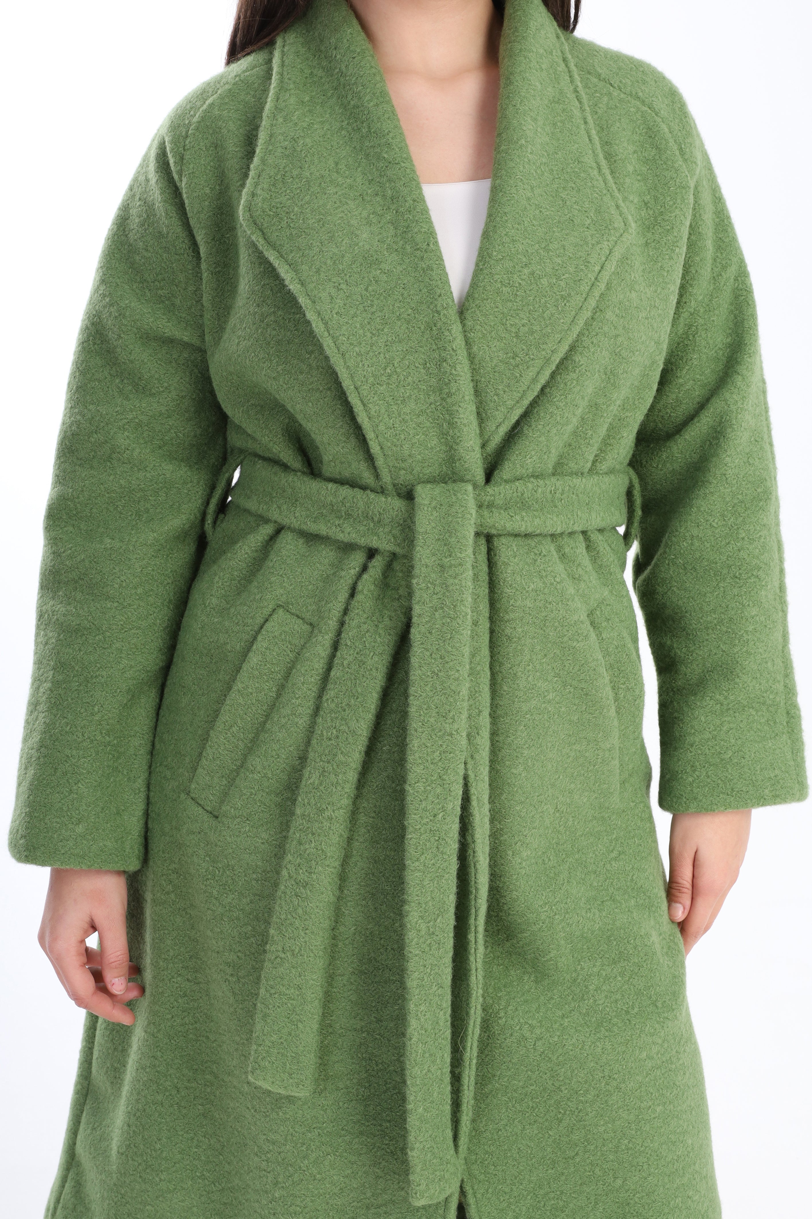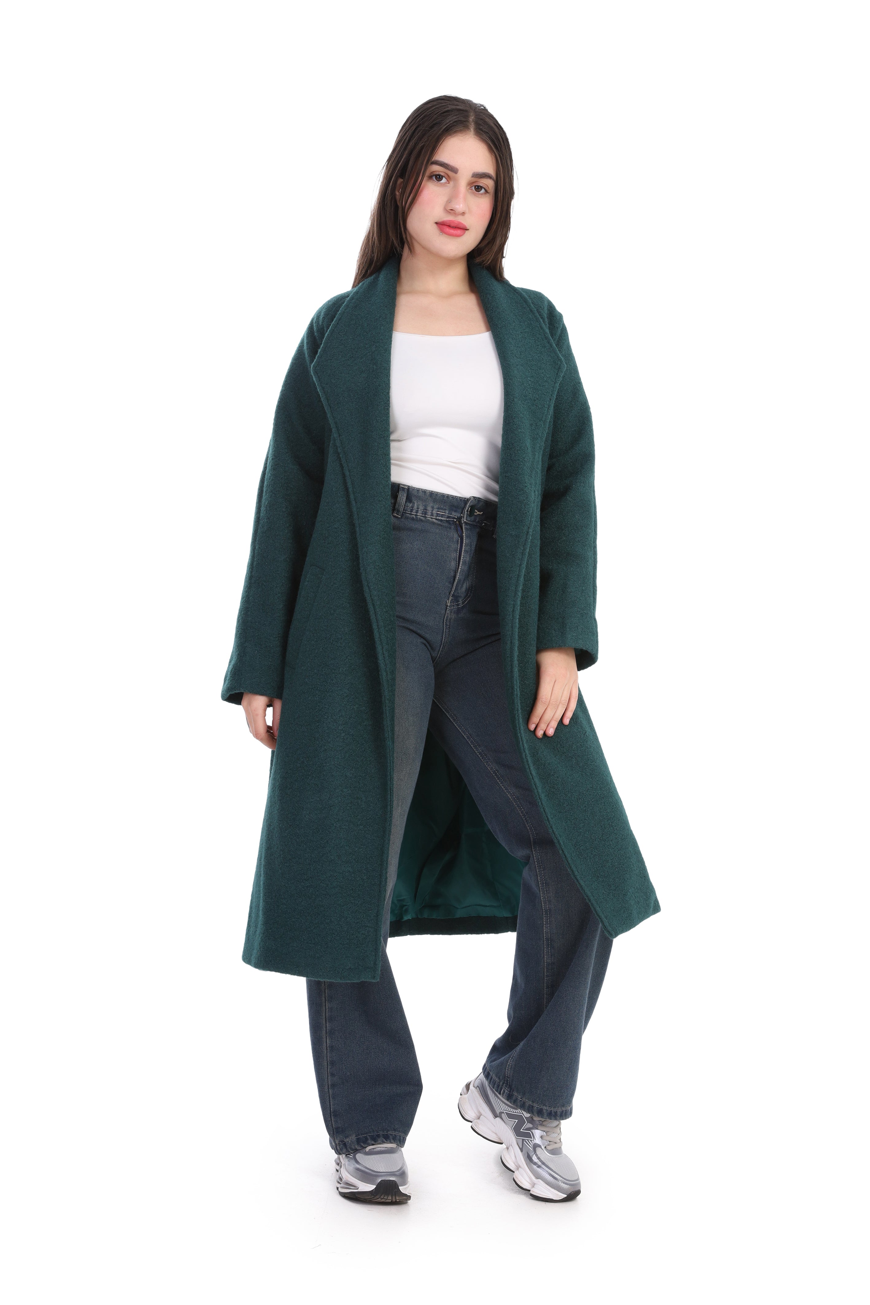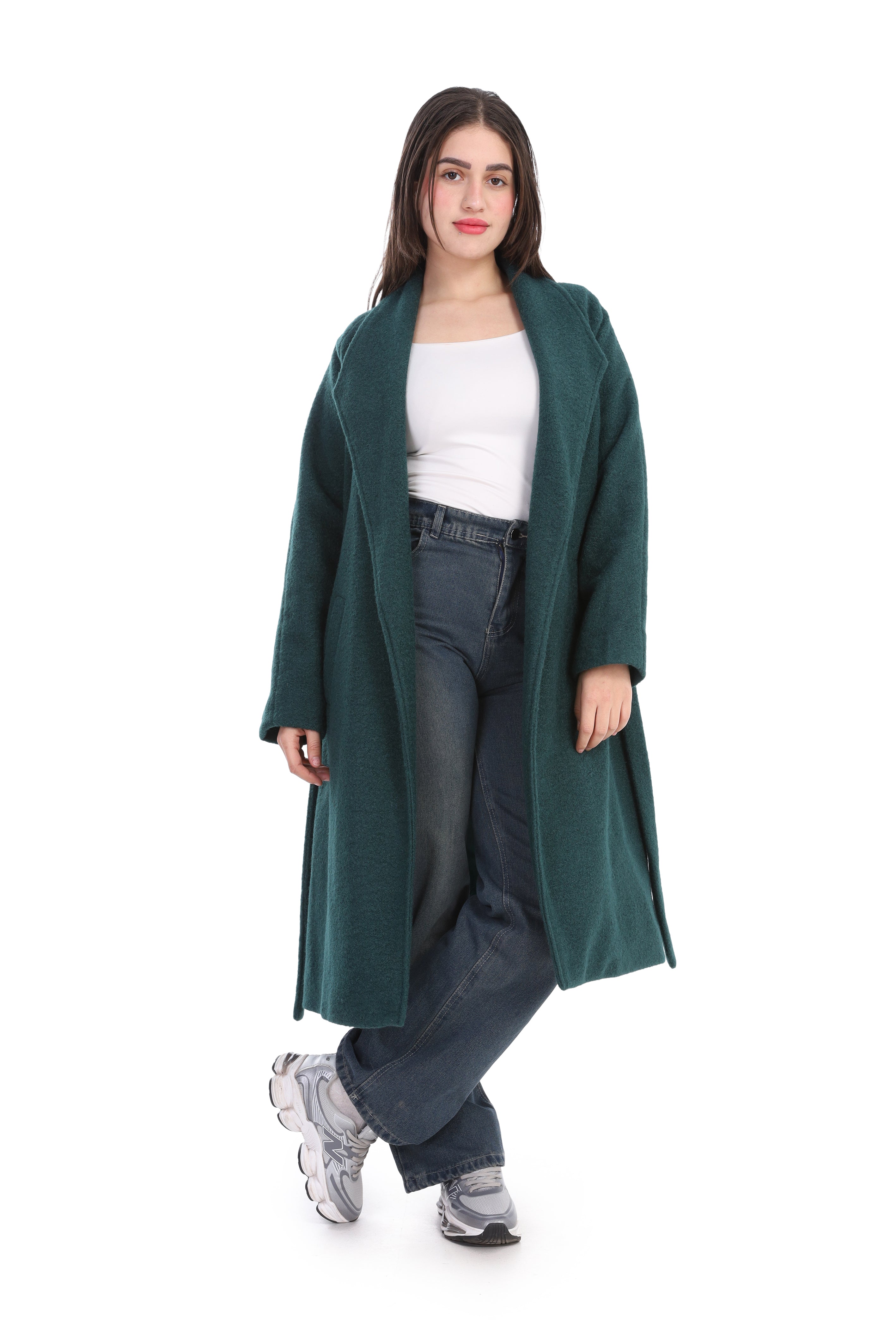 Elegant long wool coat featuring a flattering waist belt. Designed to combine warmth and sophistication.