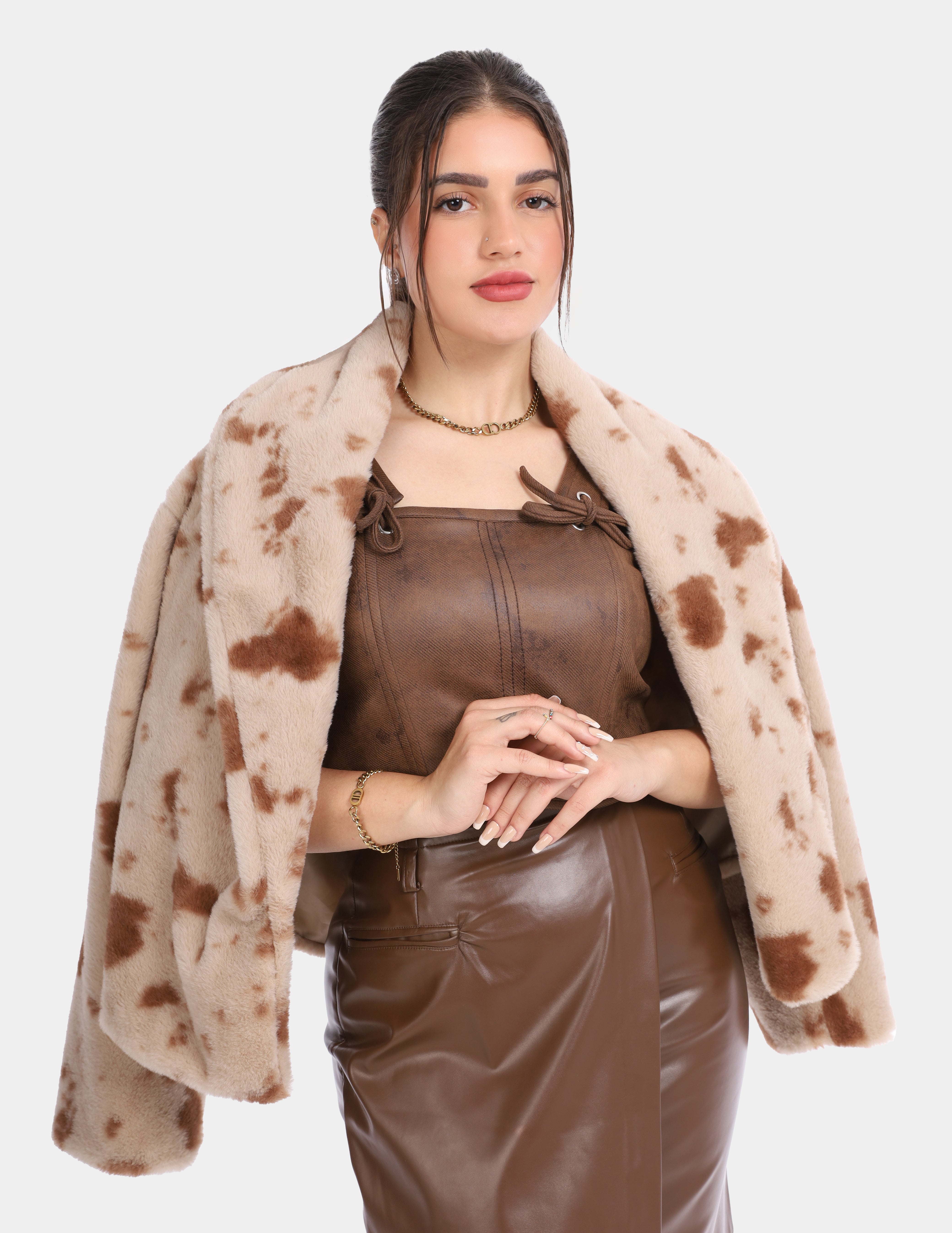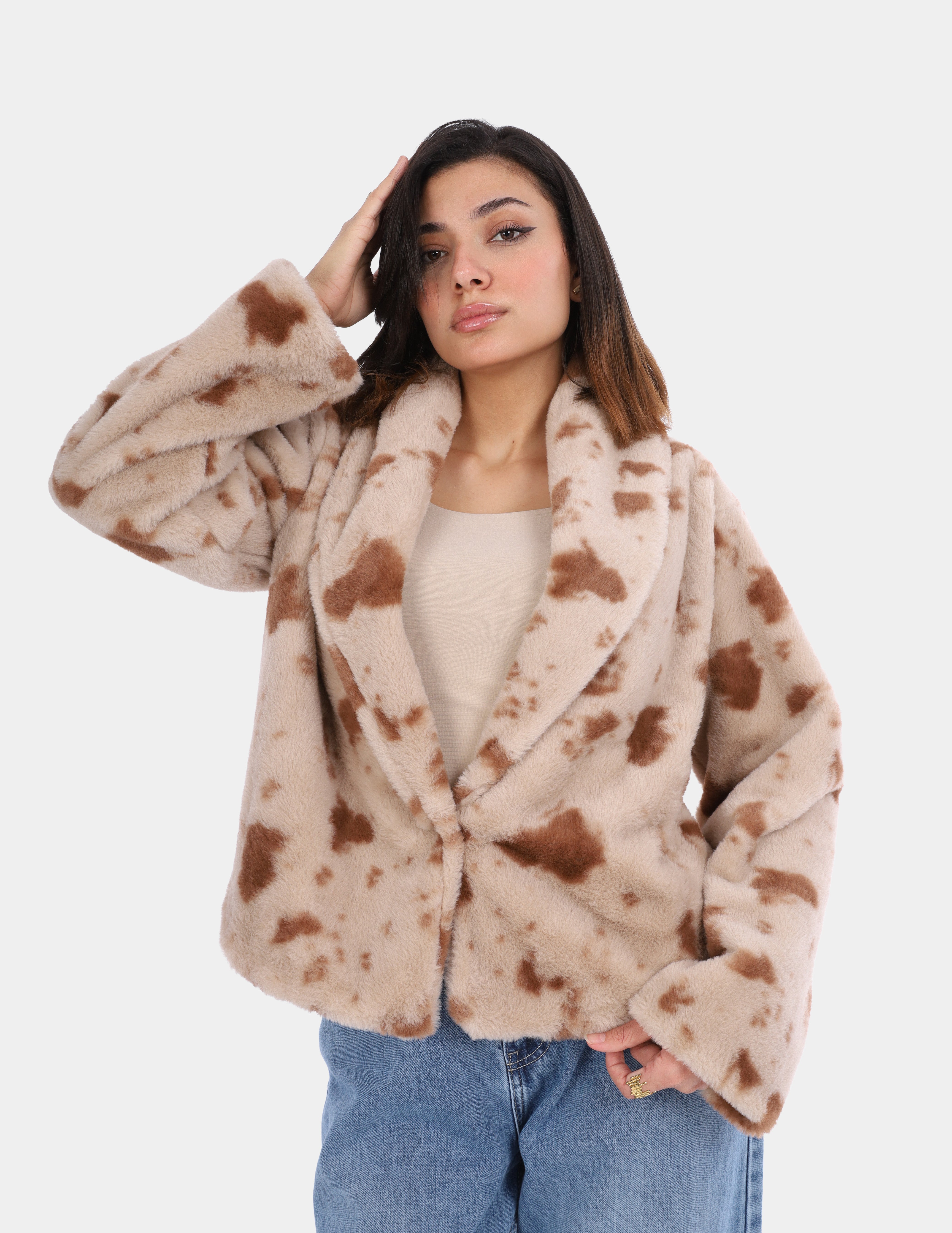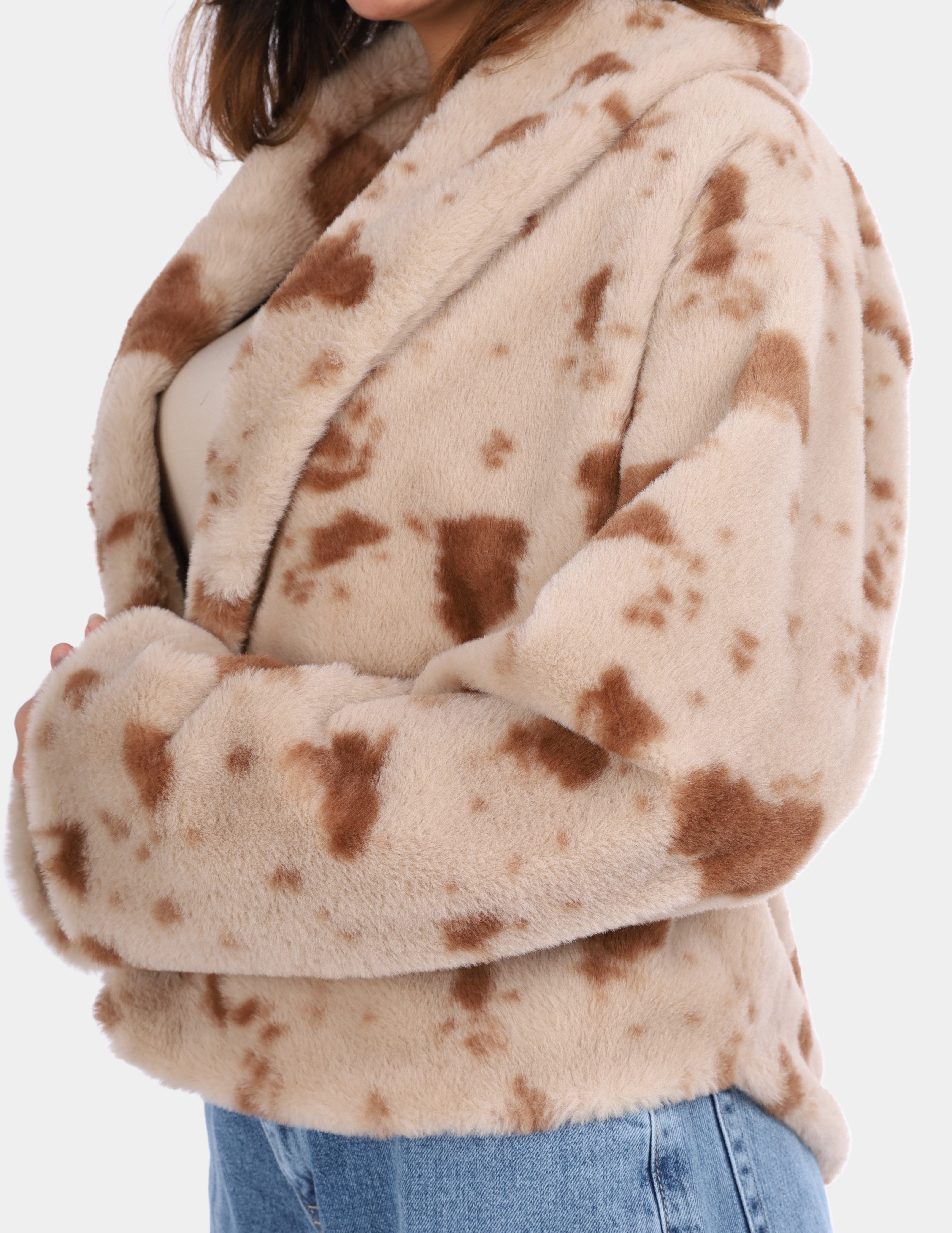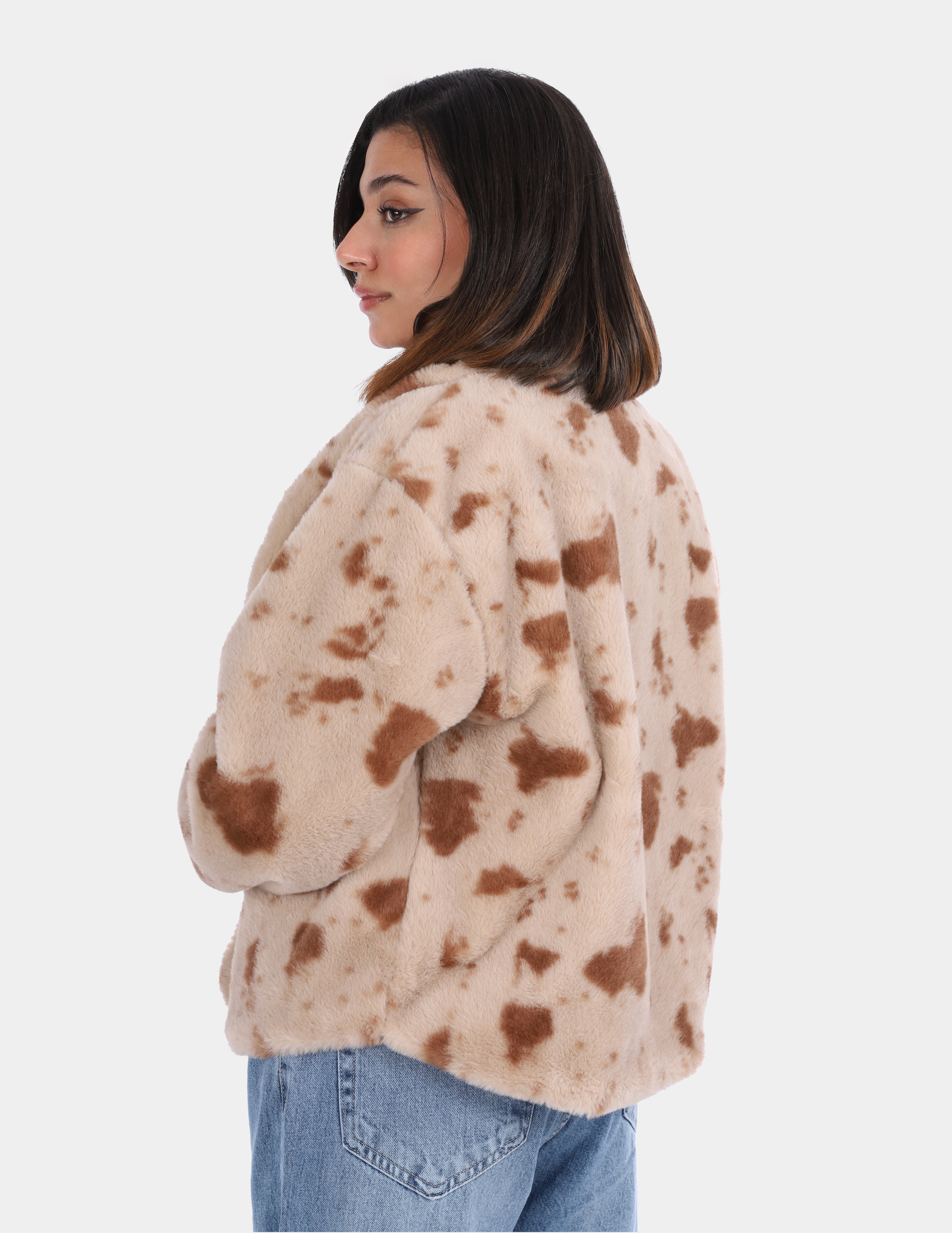 Stay cozy and trendy with this soft cow print fleece jacket. Perfect for casual outings