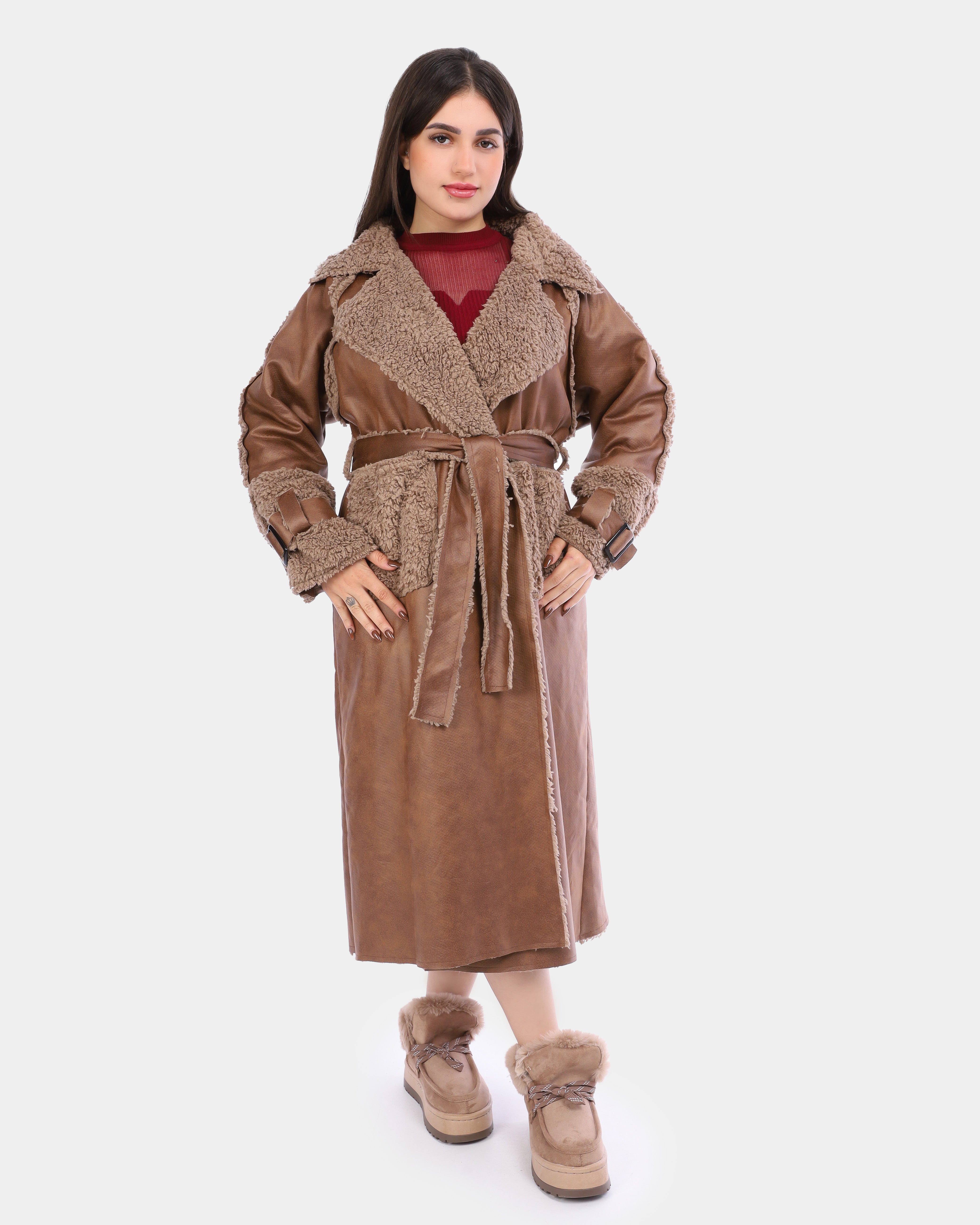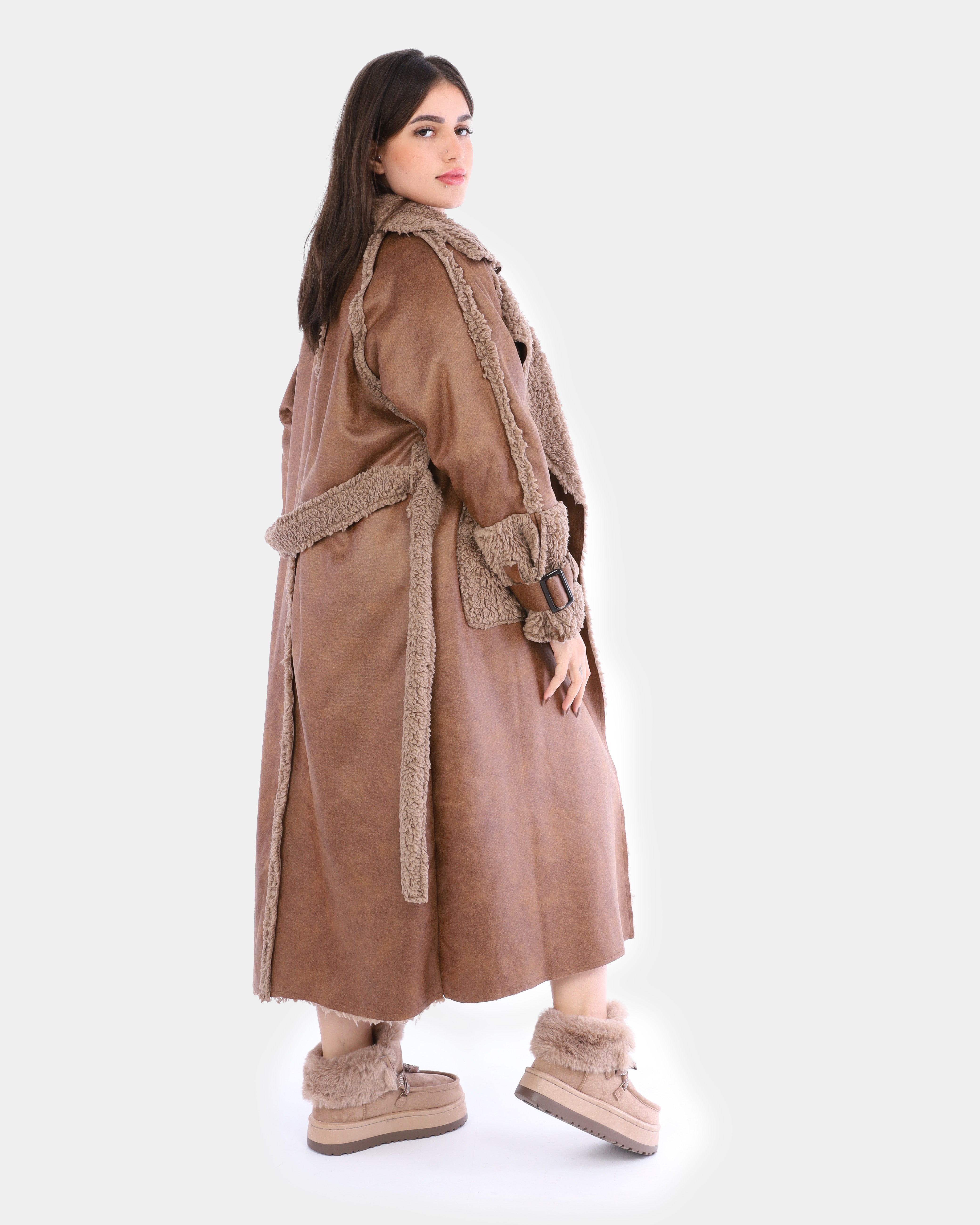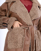 Long Leather Faux Shearling Coat with Belt w1710C06/1