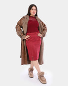 Elegant long coat designed with a soft faux shearling lining and trim for extra warmth.