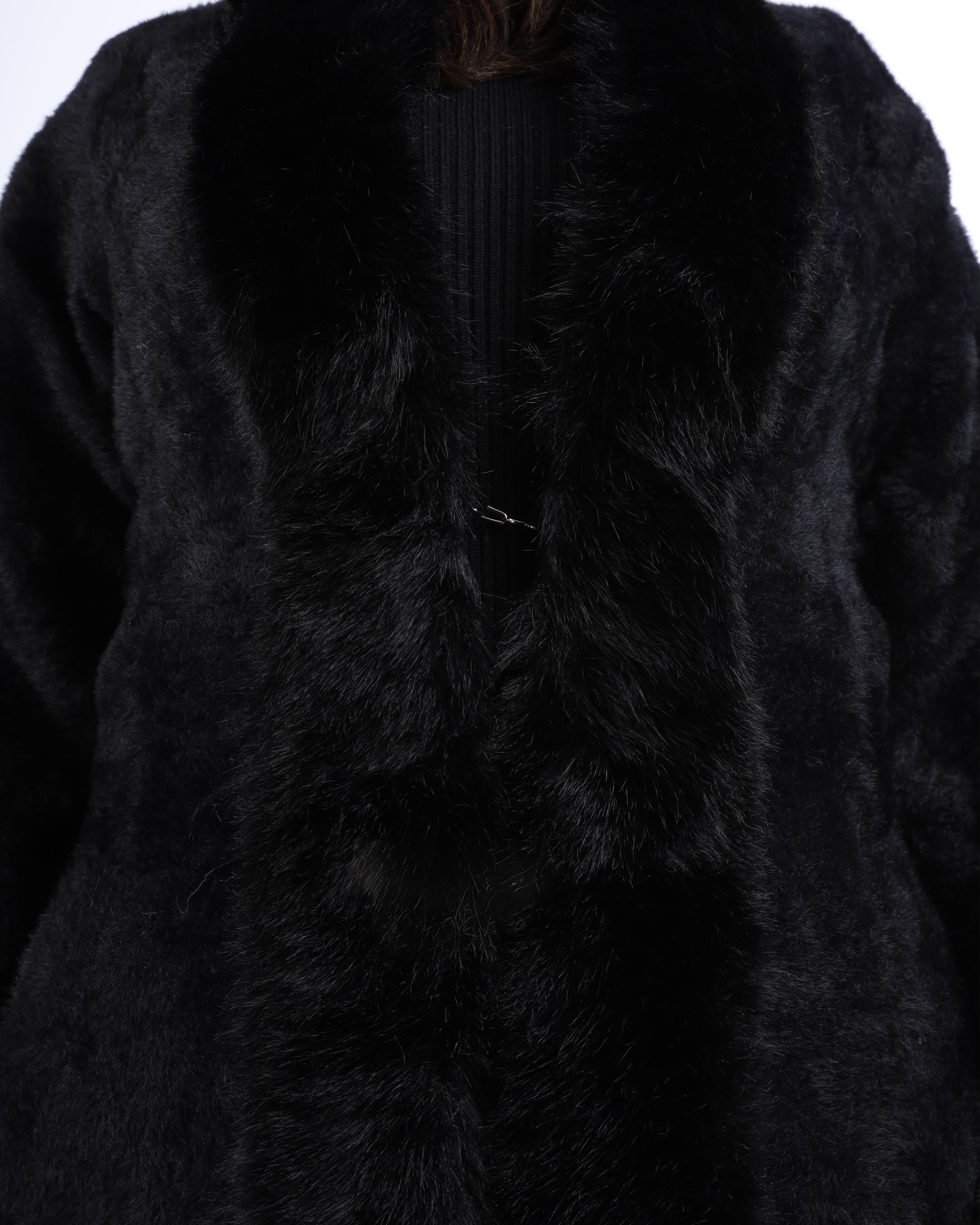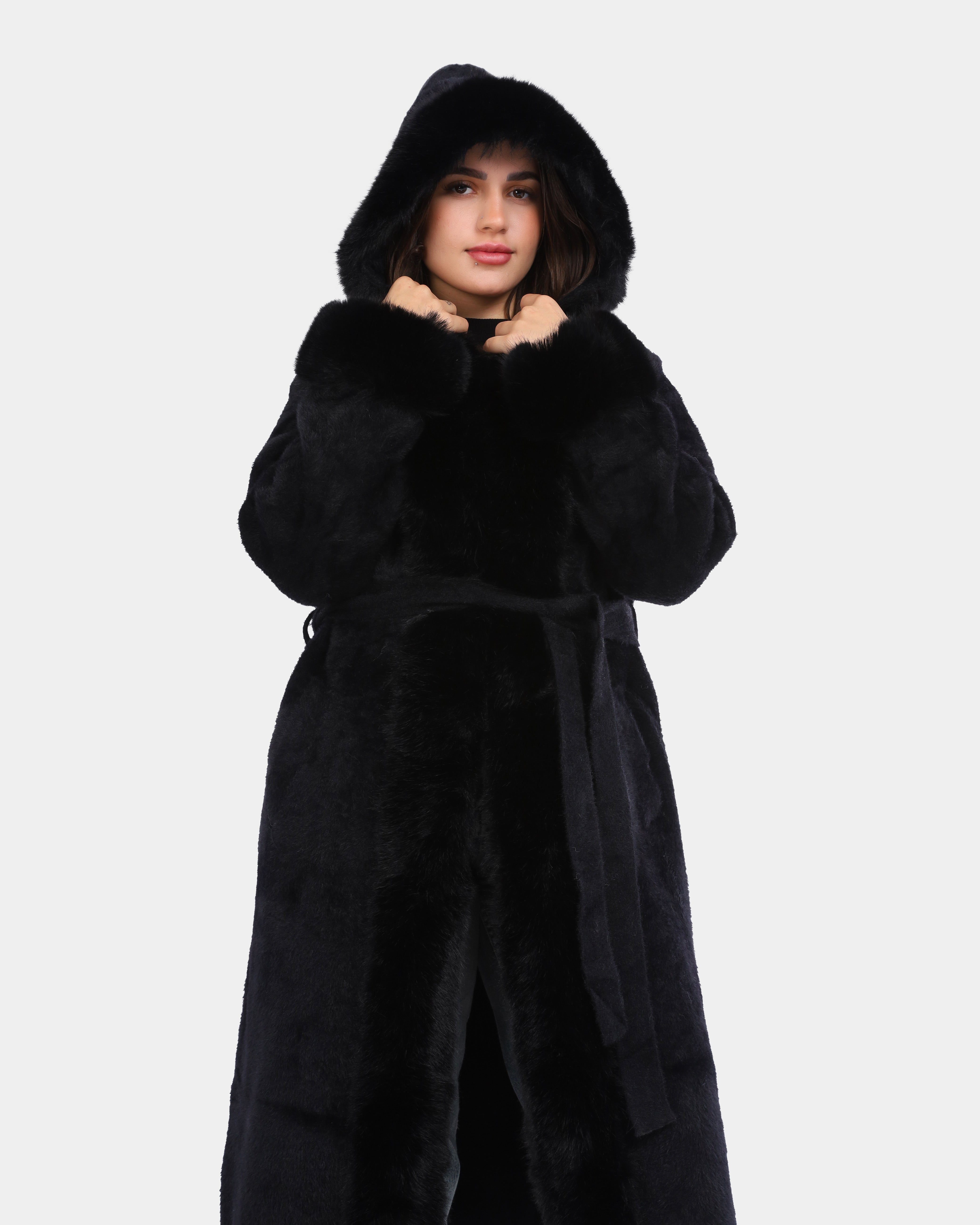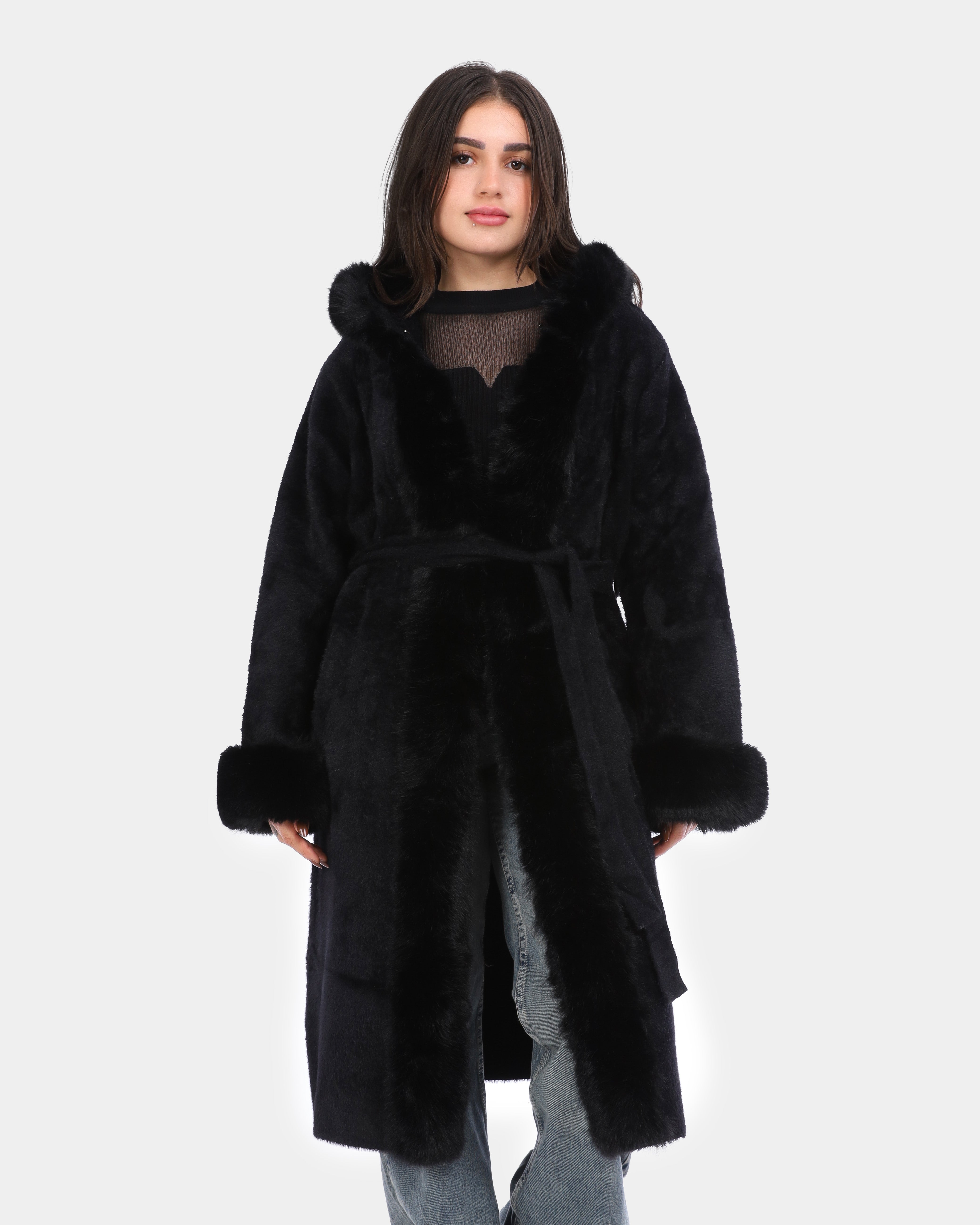 Luxury coat with soft faux fur details and a waist belt for a refined, elegant winter look.