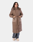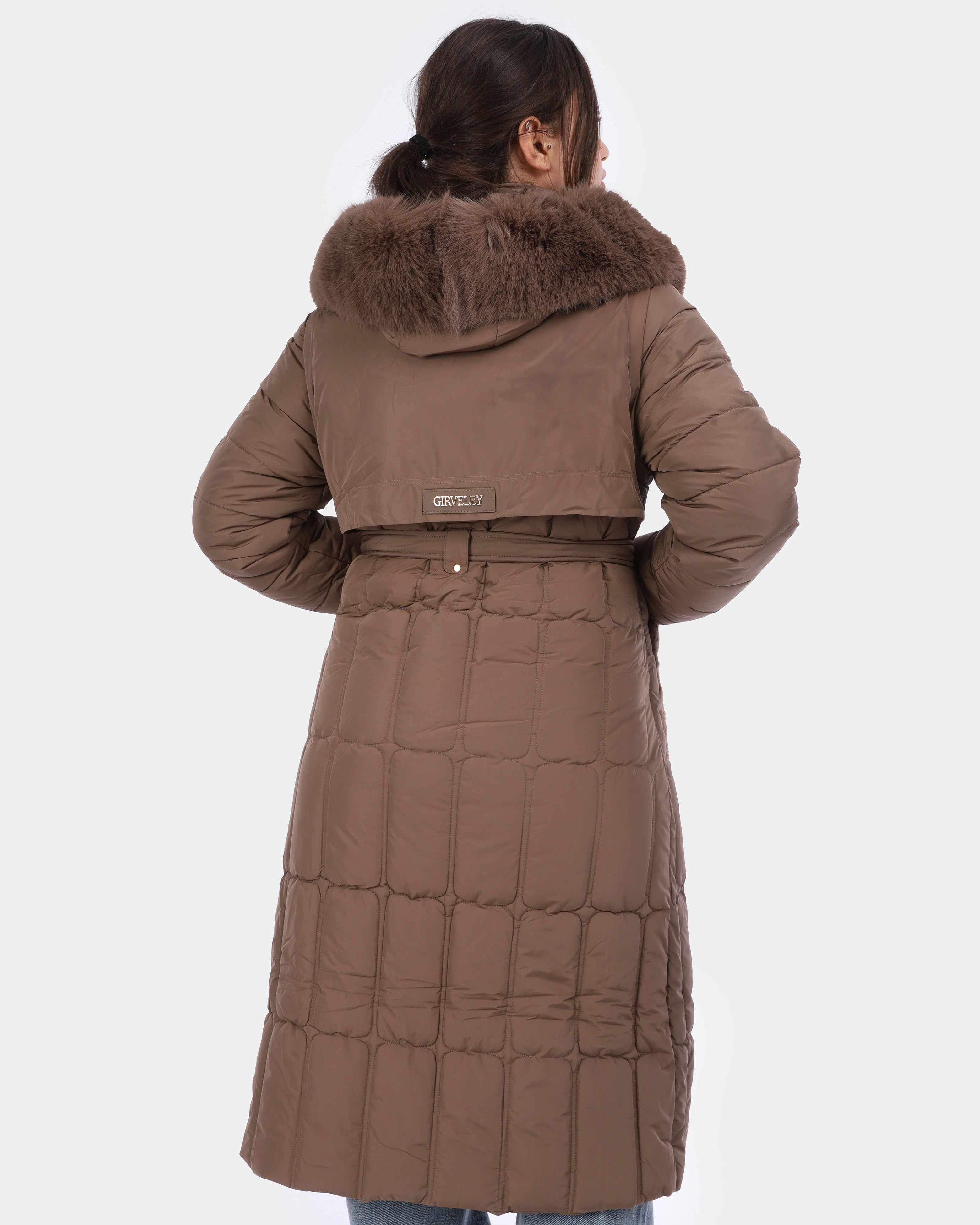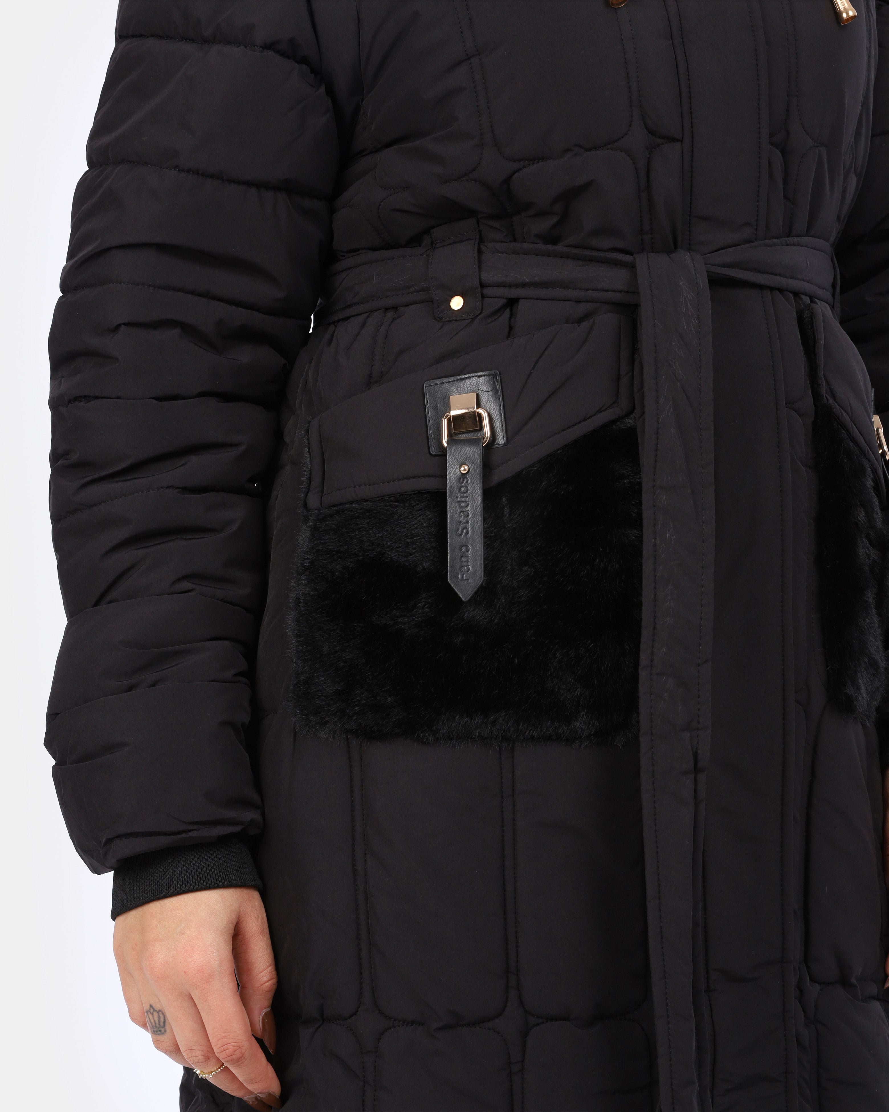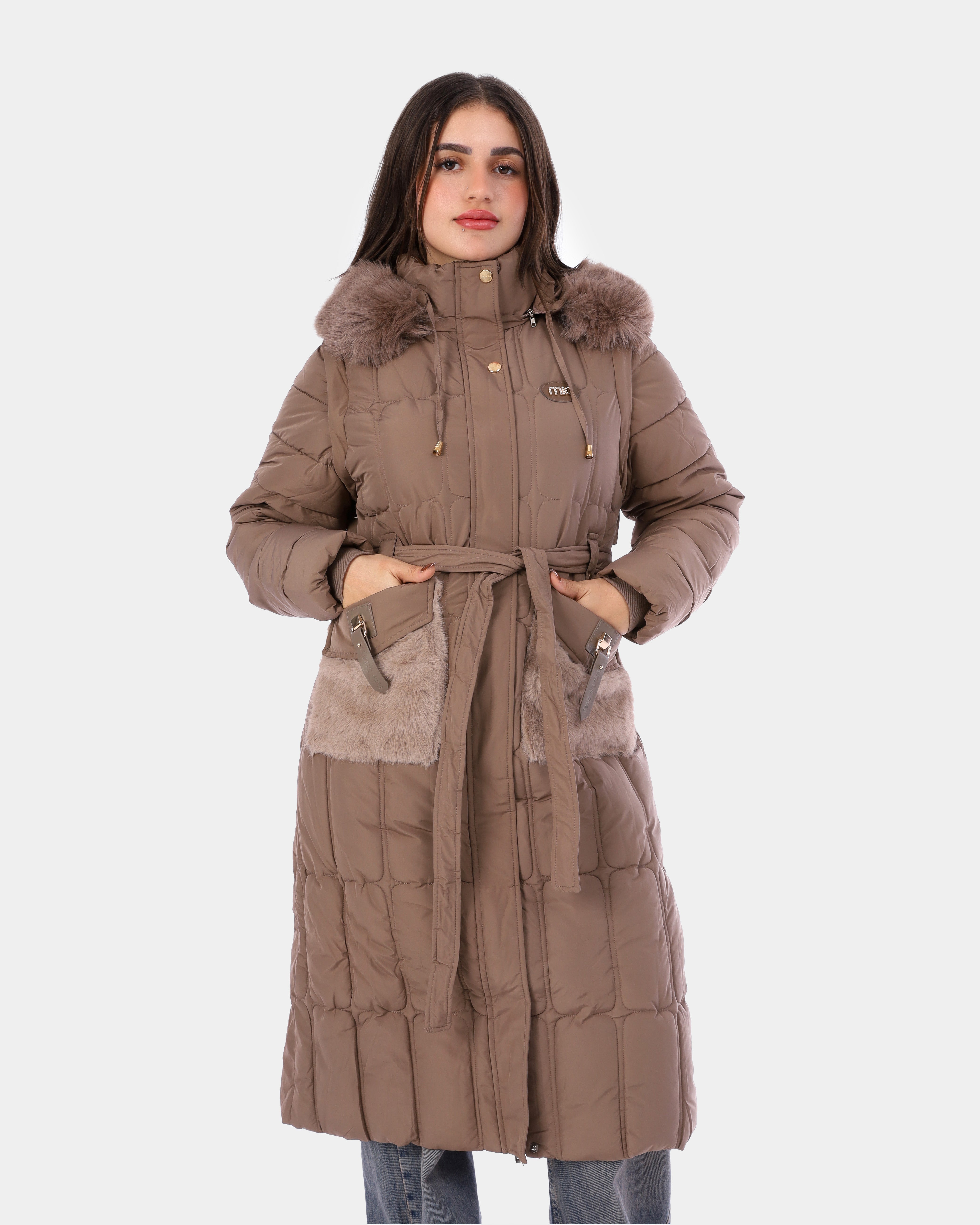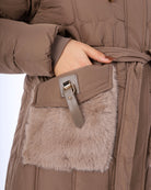 Elegant long puffer coat featuring a waist-defining belt, warm padding, and a faux-fur trimmed hood. Designed with practical pockets and a flattering fit