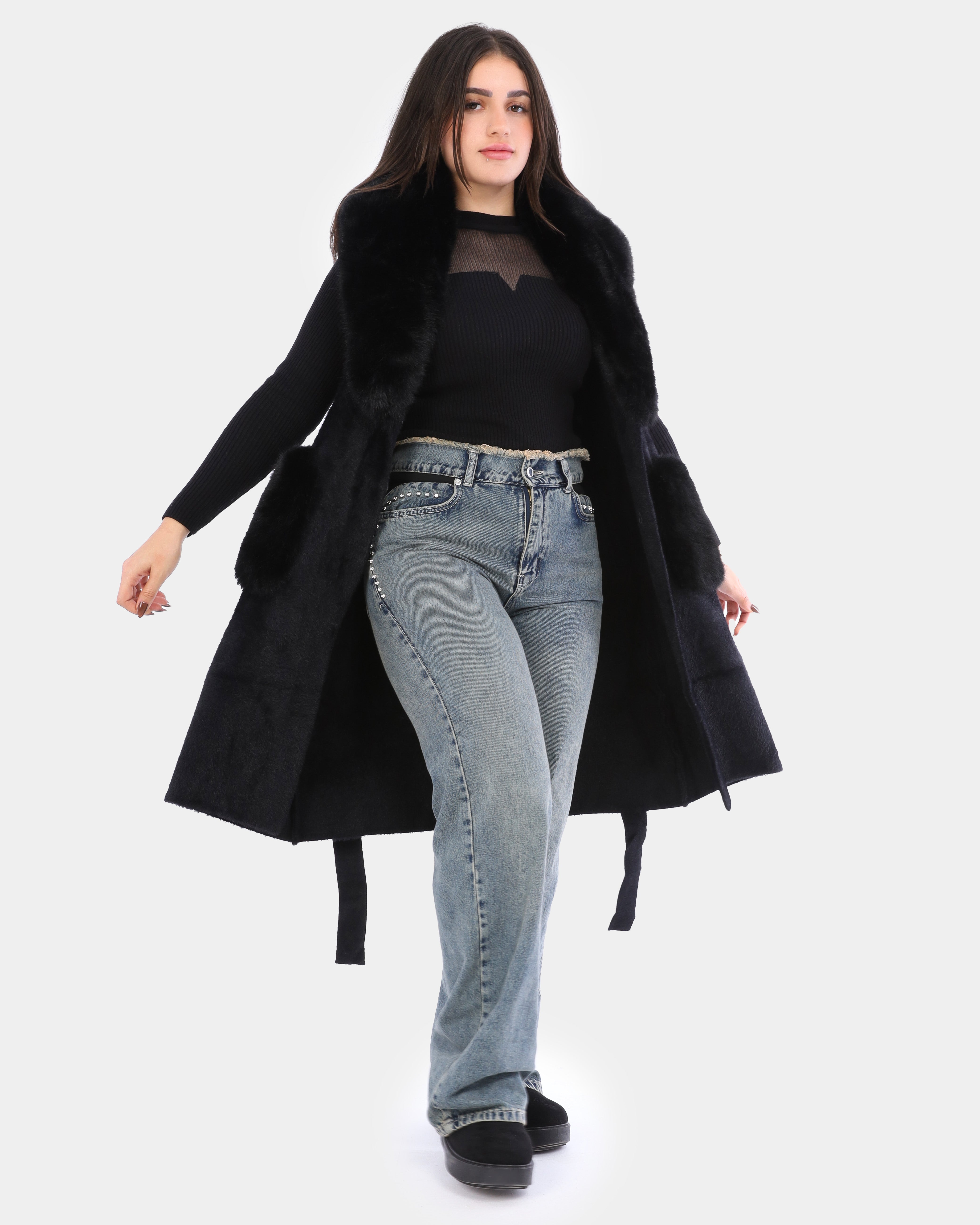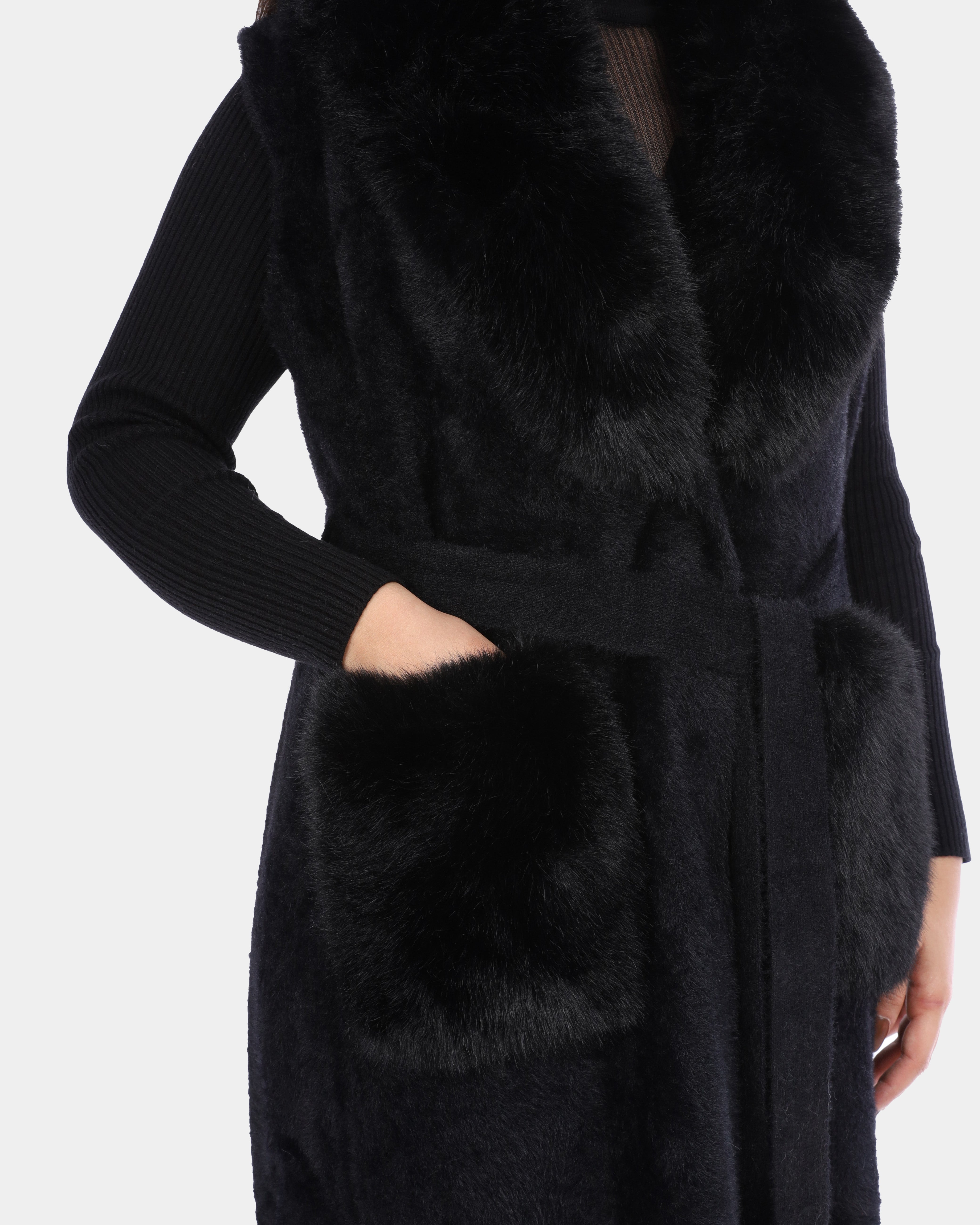 A stylish long sleeveless faux fur coat with belt. texture with fluffy toned faux fur accents on the collar and pockets, it ideal for casual outings.