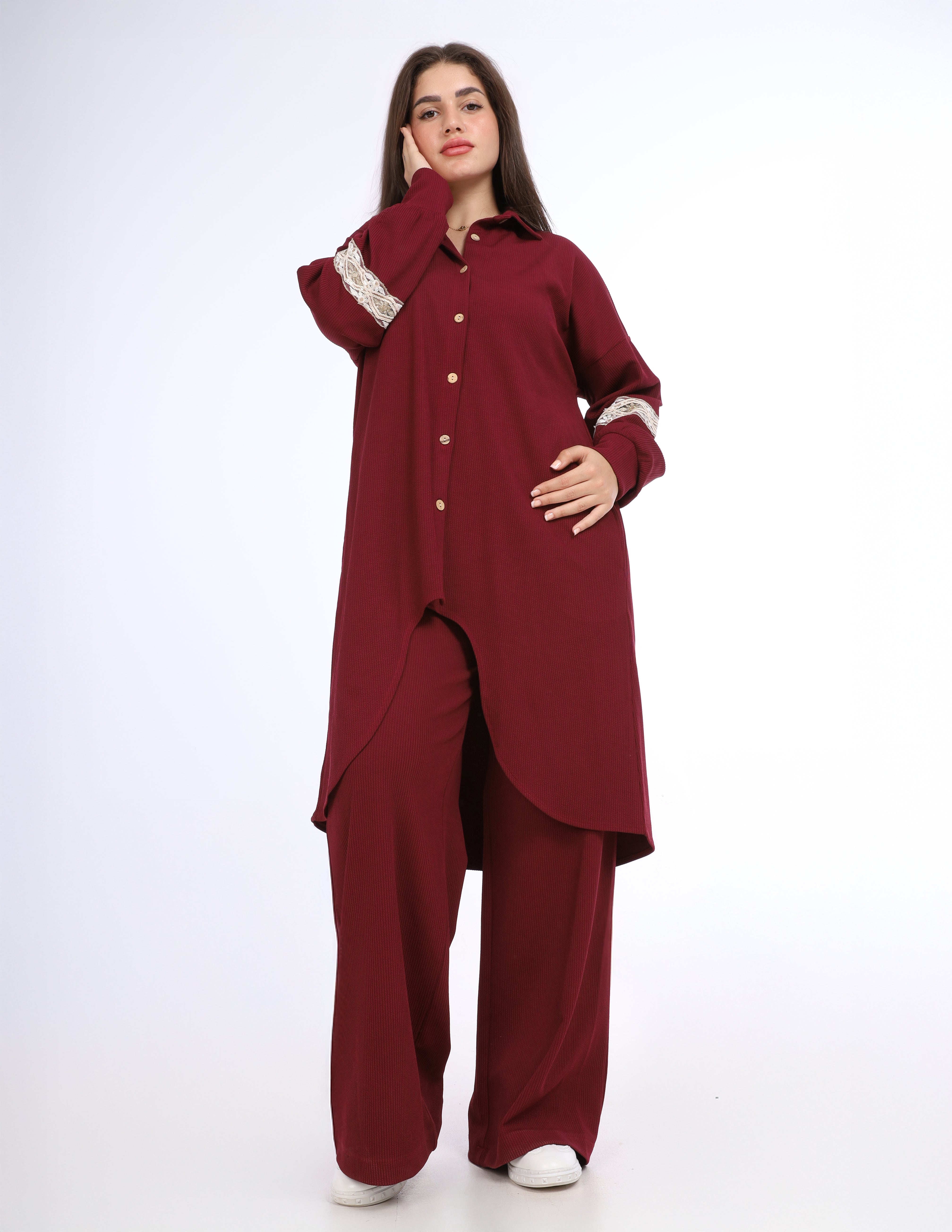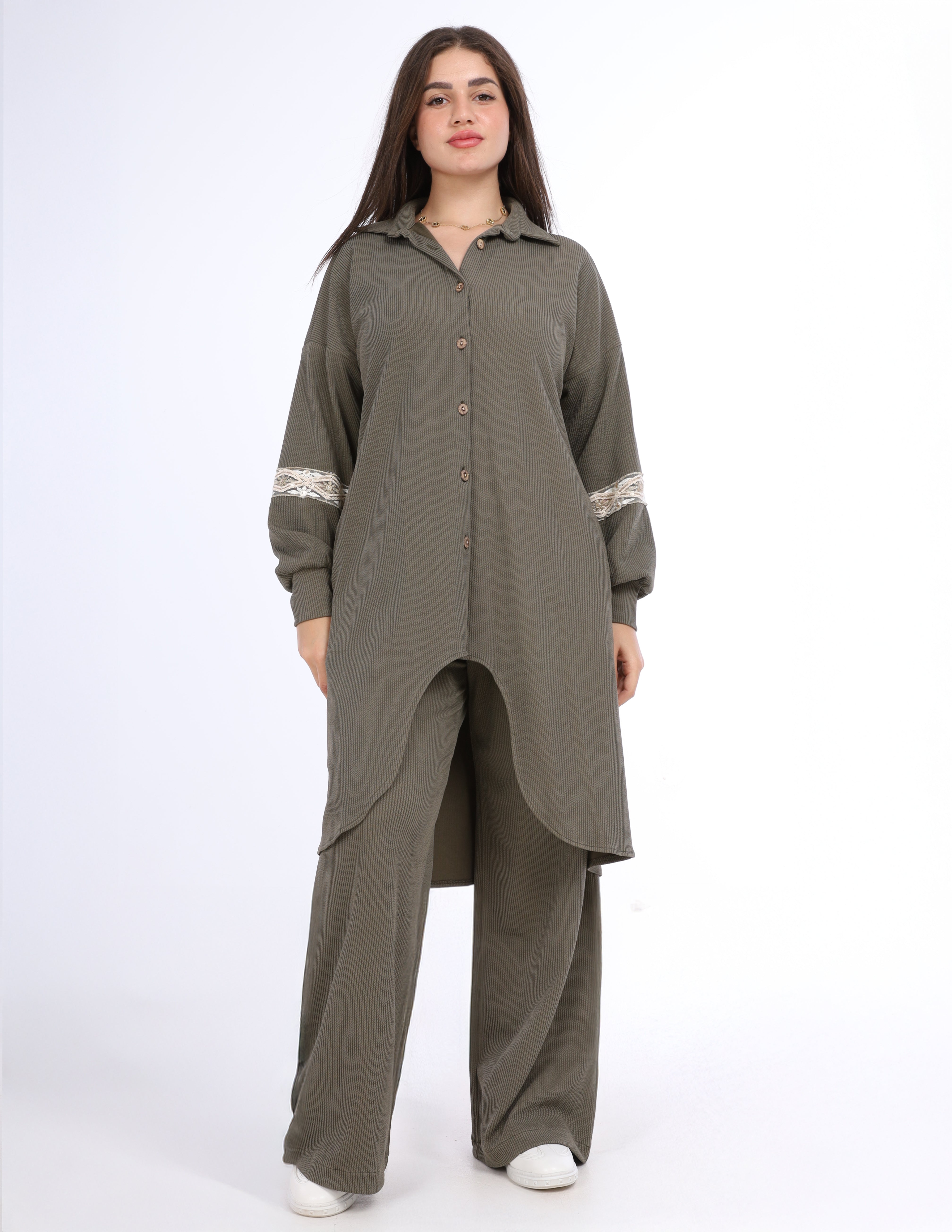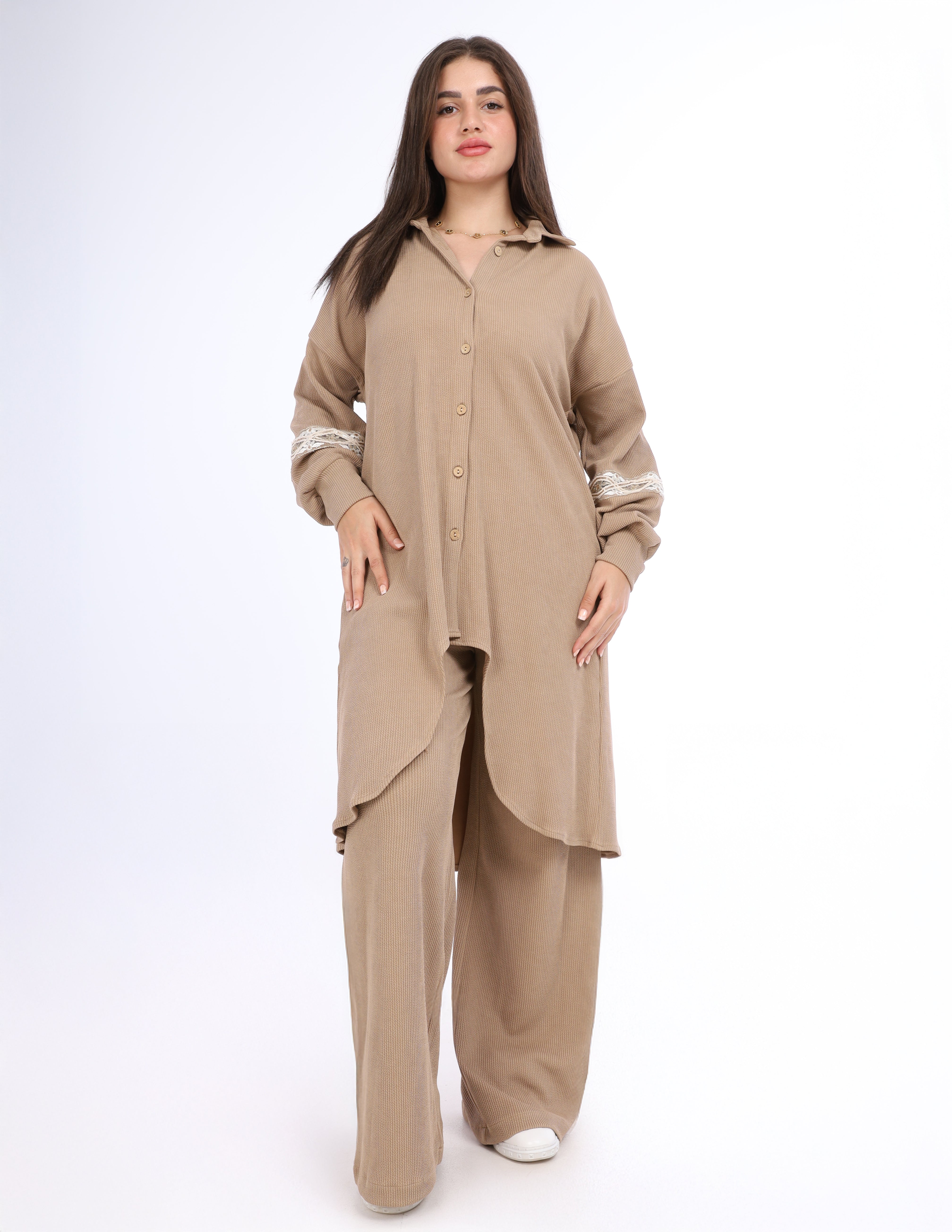 Elegant two-piece ribbed set featuring a long shirt with embroidered lace details on the sleeves and back, paired with matching wide-leg pants. Perfect for a chic and feminine look.