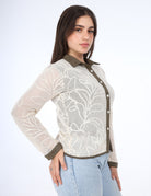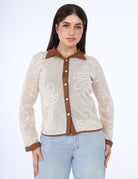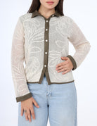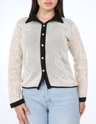 Elegant sheer shirt featuring delicate embroidered leaf patterns and contrast trims along the collar, cuffs, and button placket.