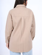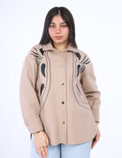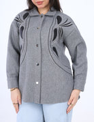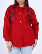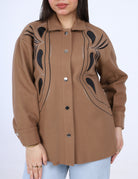 Stylish button-up Shirt featuring decorative black applique and embroidered detailing along the chest and shoulders.
