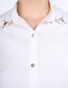 A classic white shirt featuring elegant rhinestone embellishments along the collar