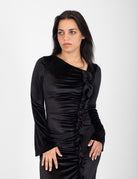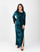 Elegant velvet maxi dress featuring a soft shiny finish, asymmetrical neckline