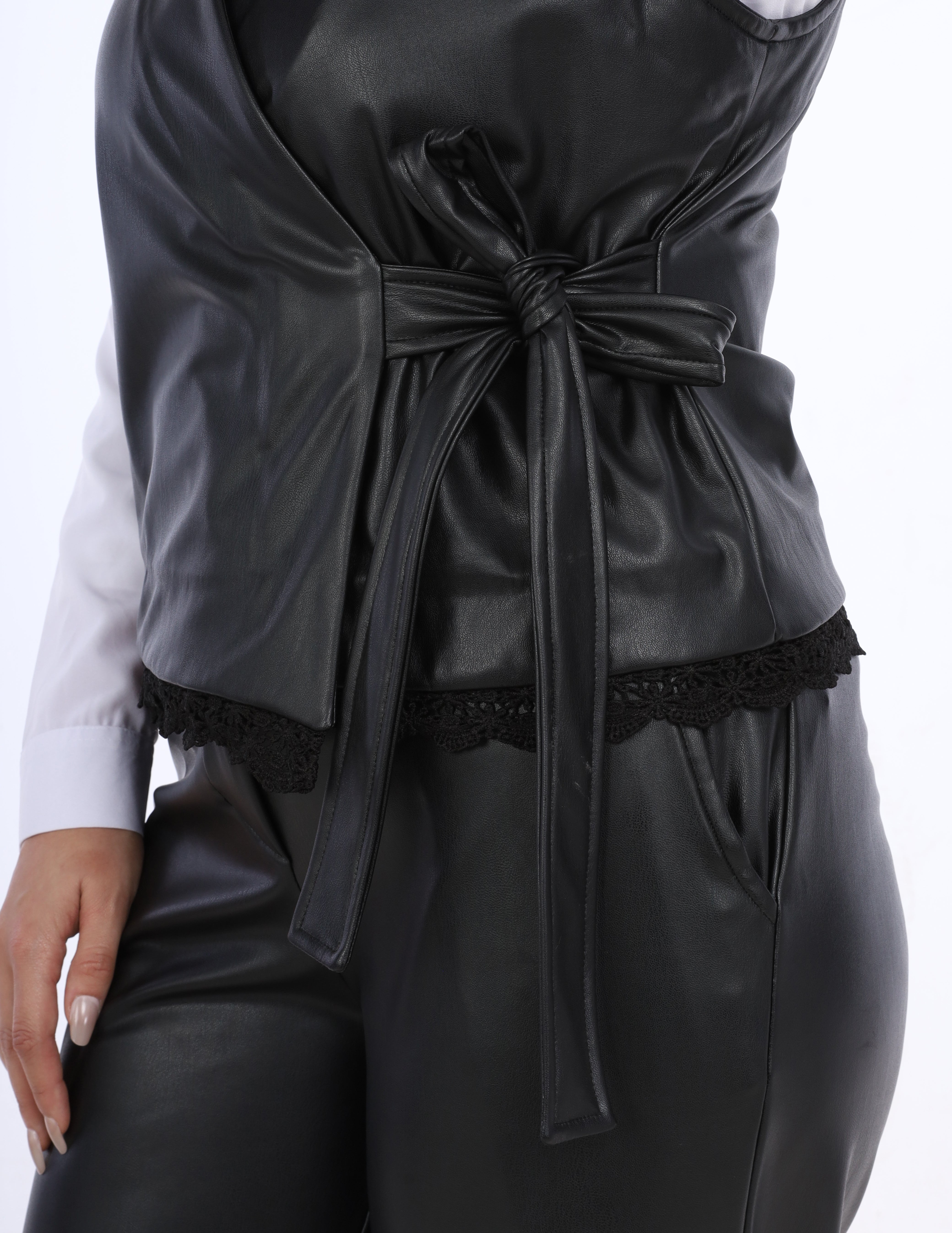 A stylish leather two-piece suit featuring a wrap vest with a belted waist and wide-leg pants, designed for a bold and modern look.