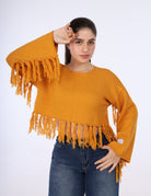 A trendy cropped knit pullover featuring a playful fringe hem and relaxed silhouette.