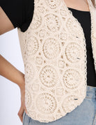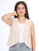 Chic sleeveless vest crafted with a mix of crochet and linen textures. Designed for a trendy layered look that blends boho charm with modern style.