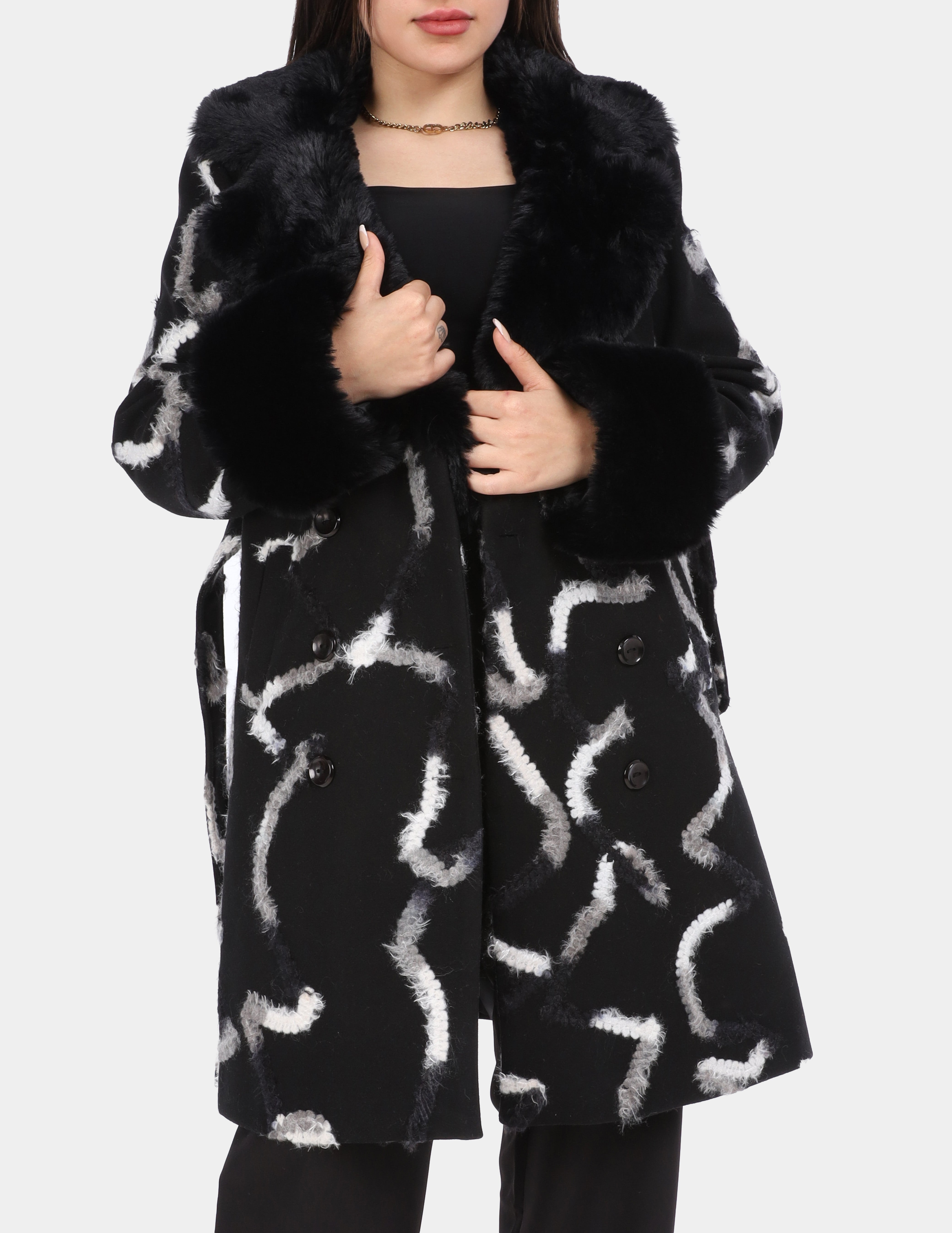 Abstract Print Faux Fur Trim Belted Coat w17201094