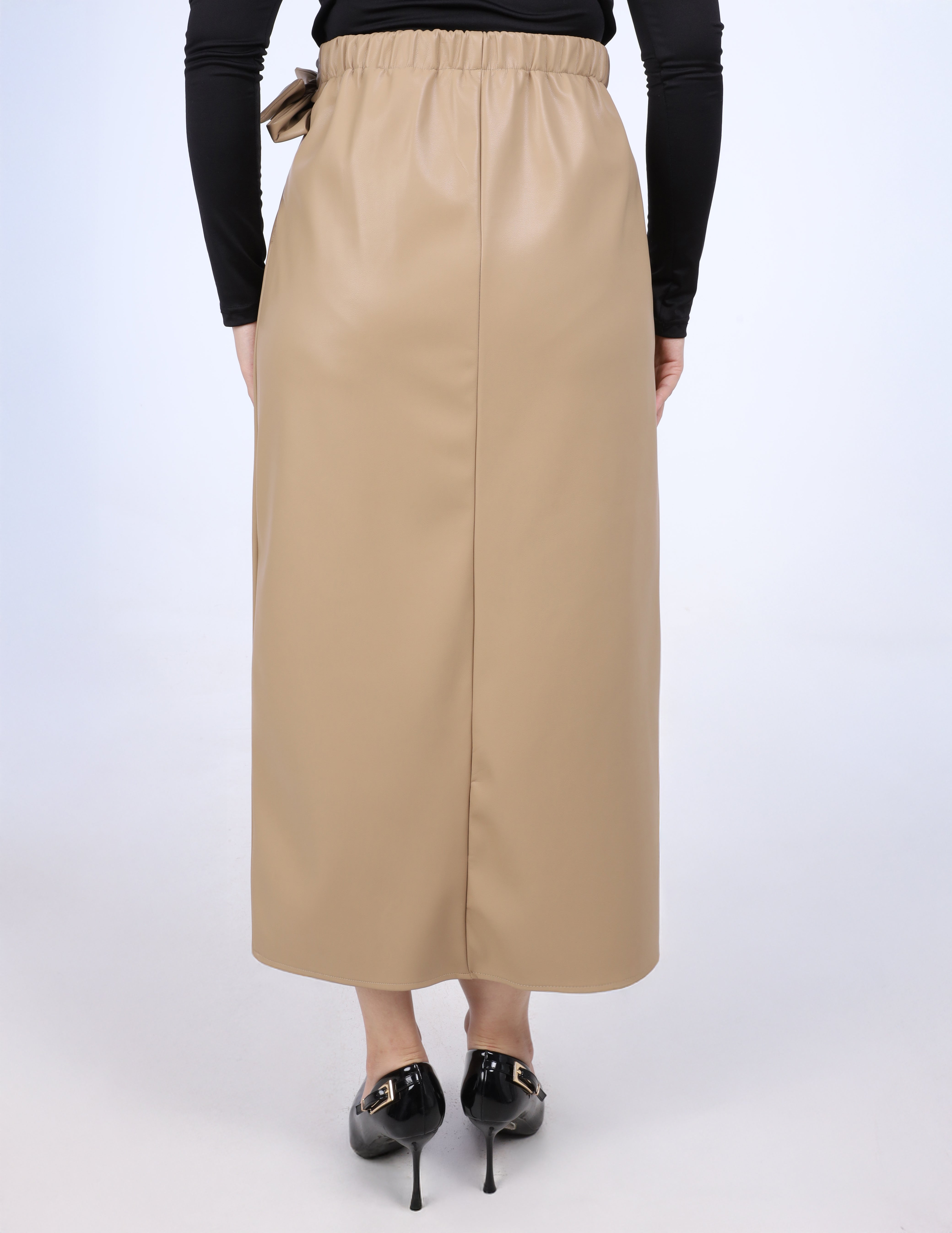 Faux Leather Midi Skirt with X-Button Detail w163040