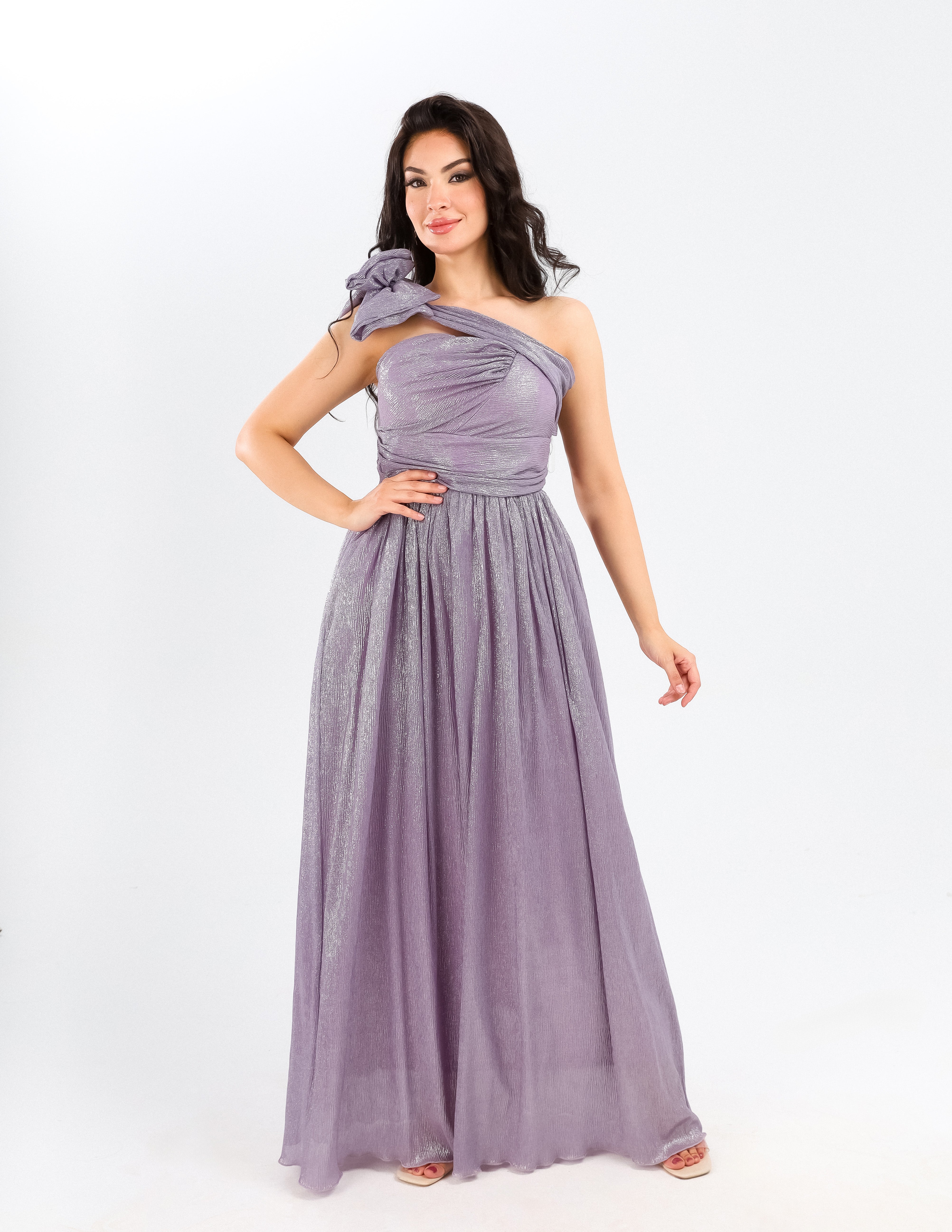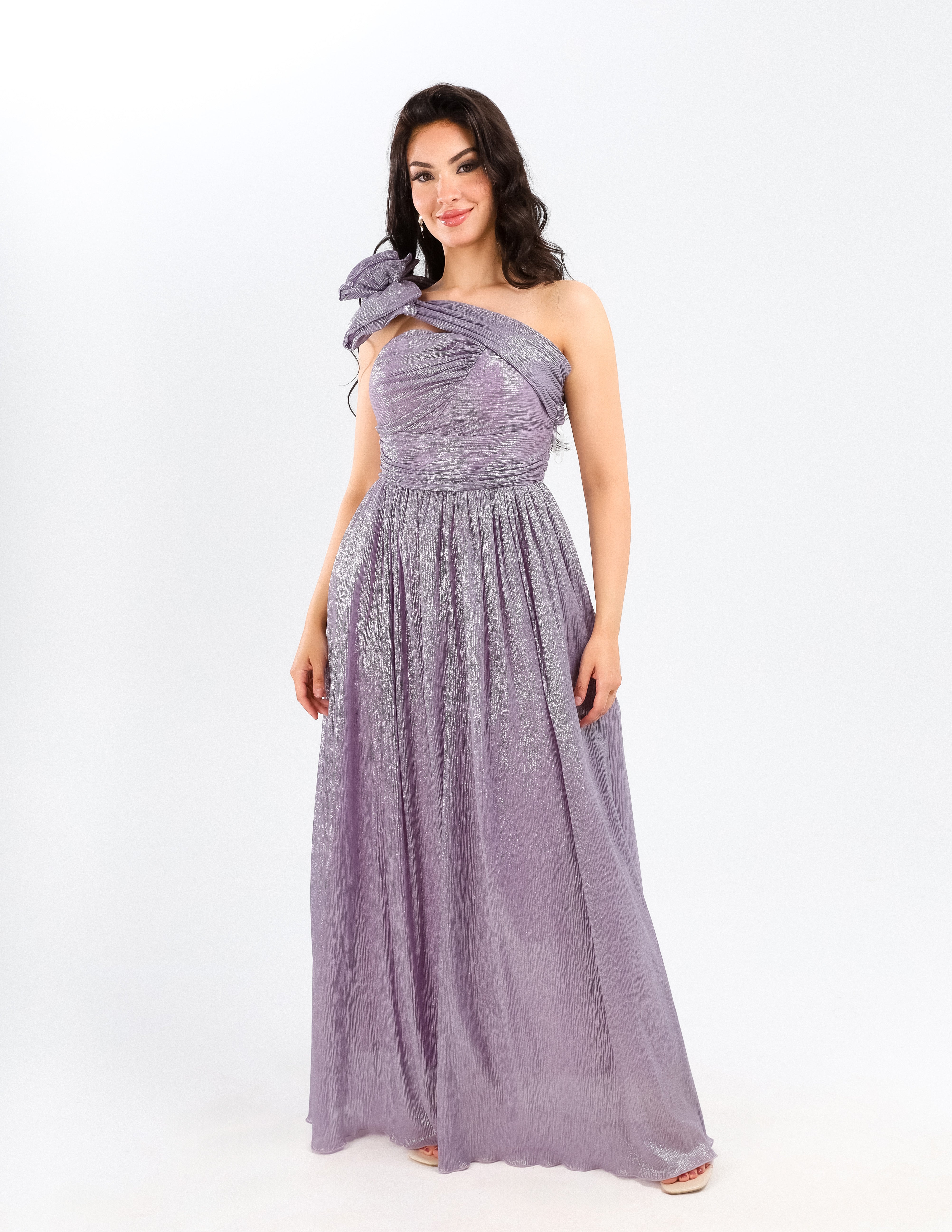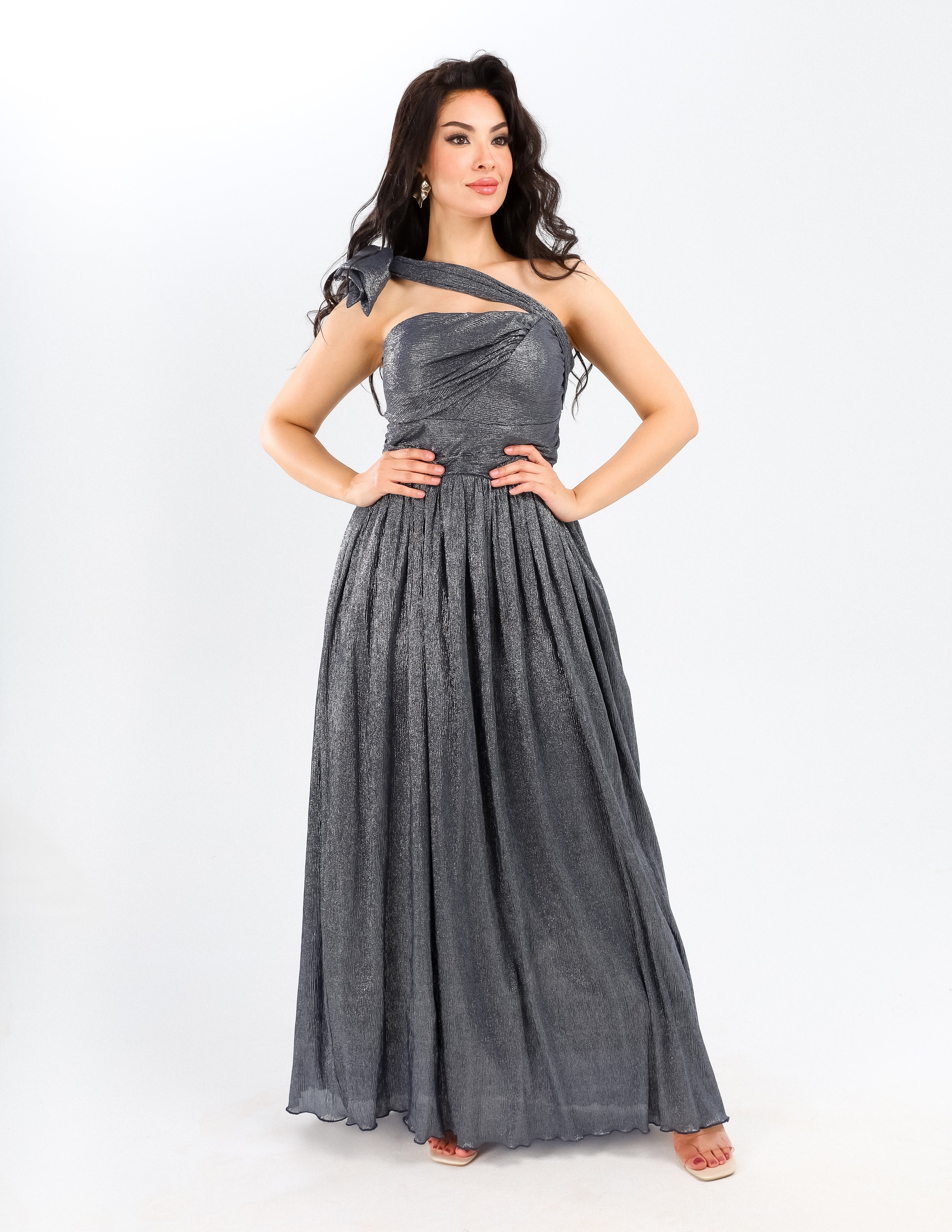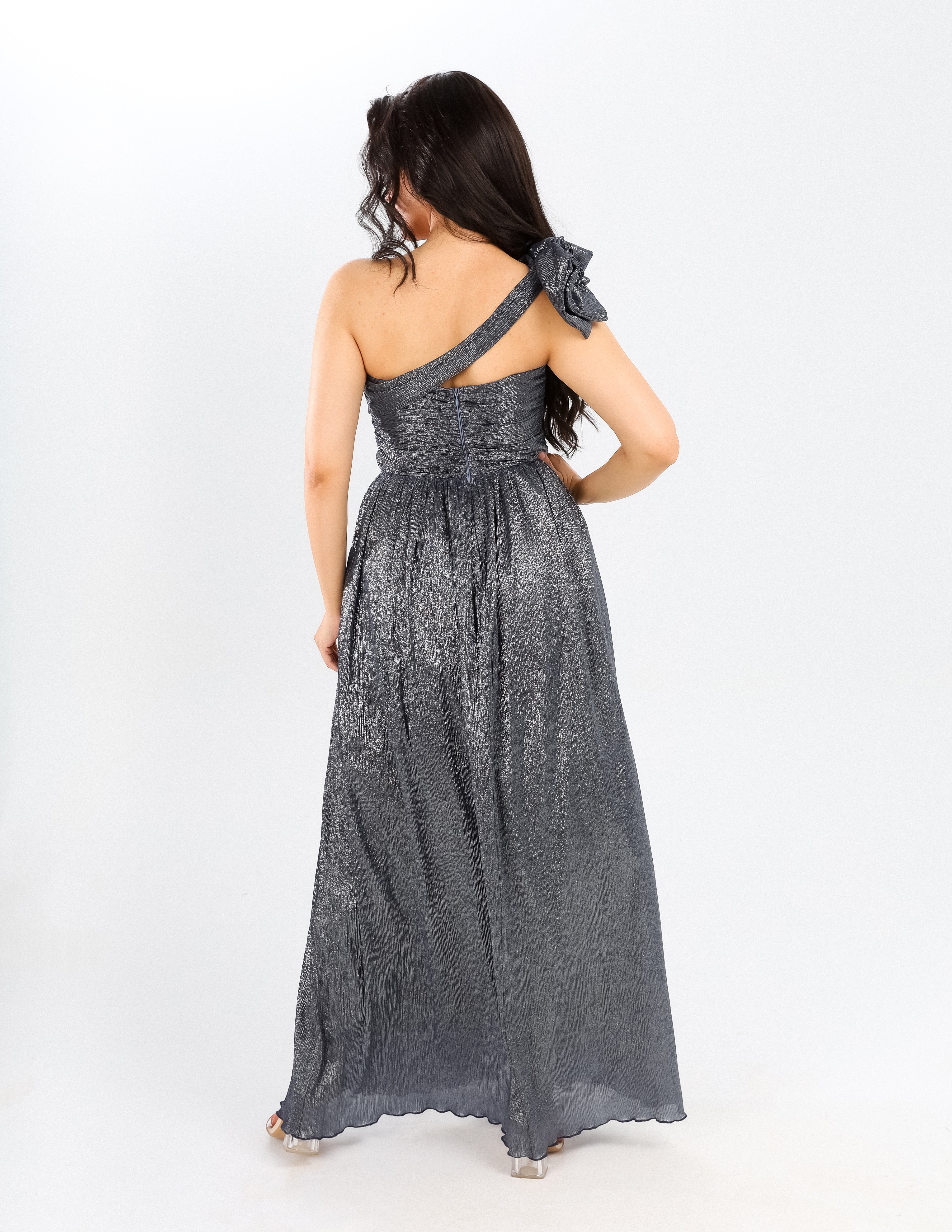 Metallic One-Shoulder Pleated Evening Gown s1593273