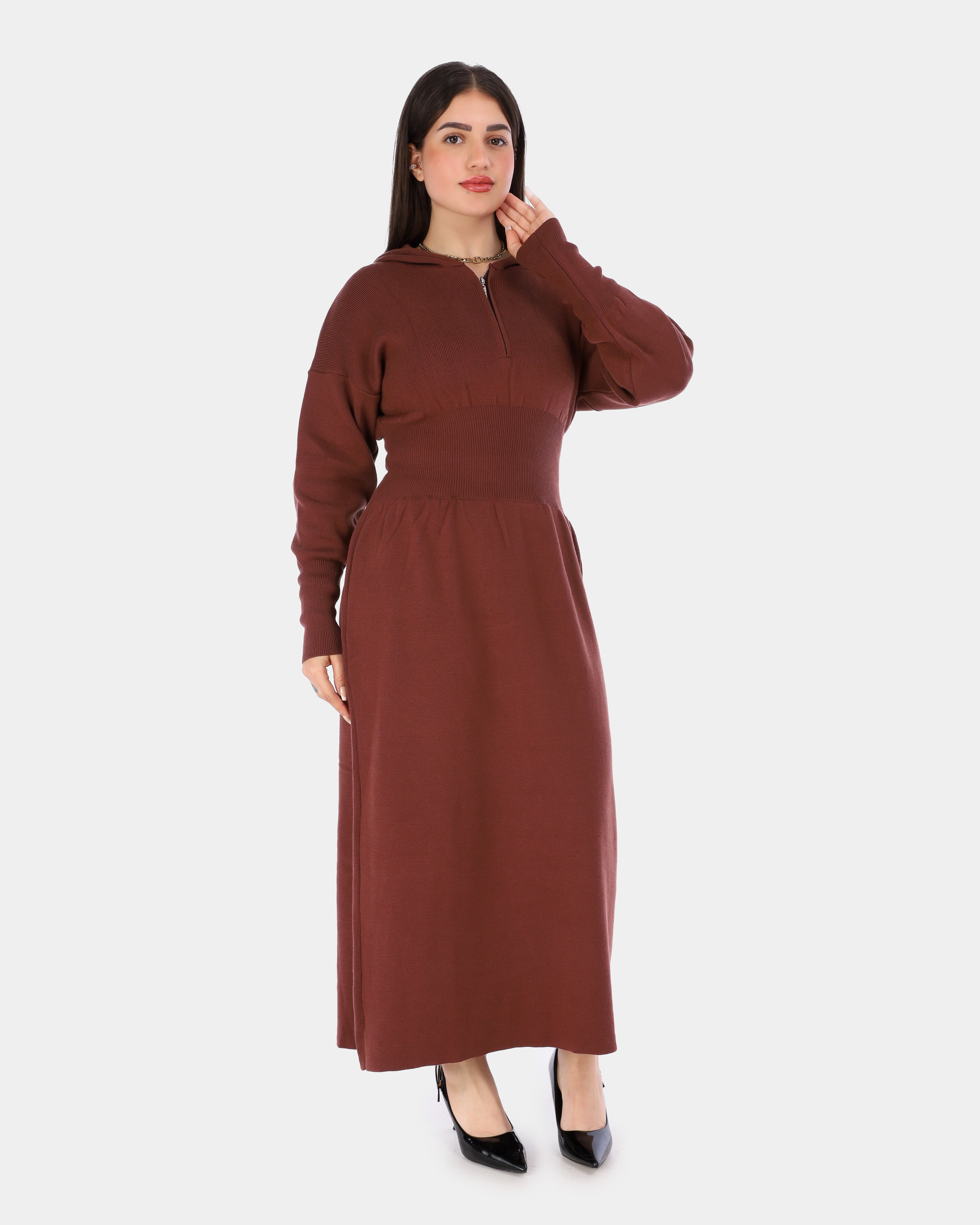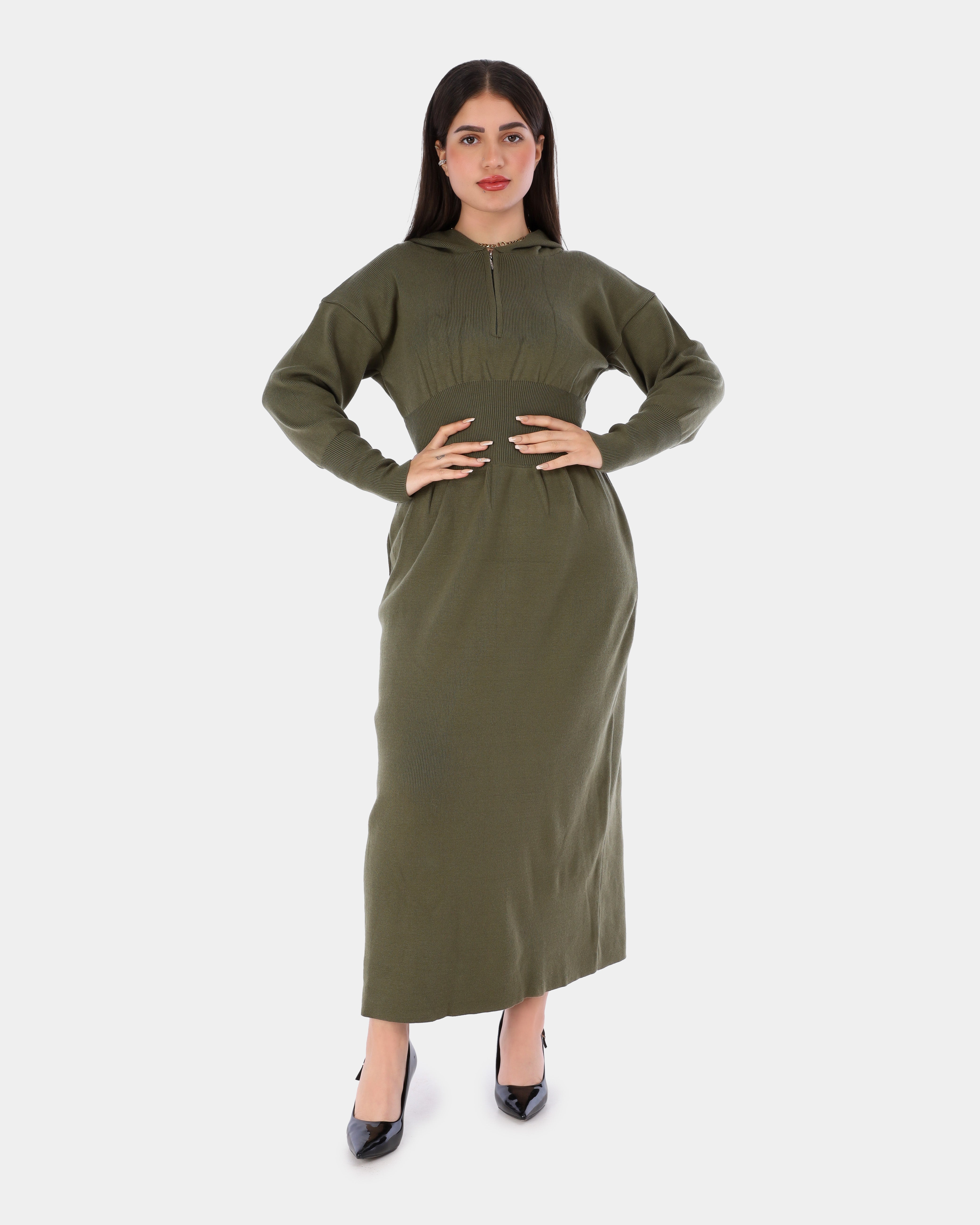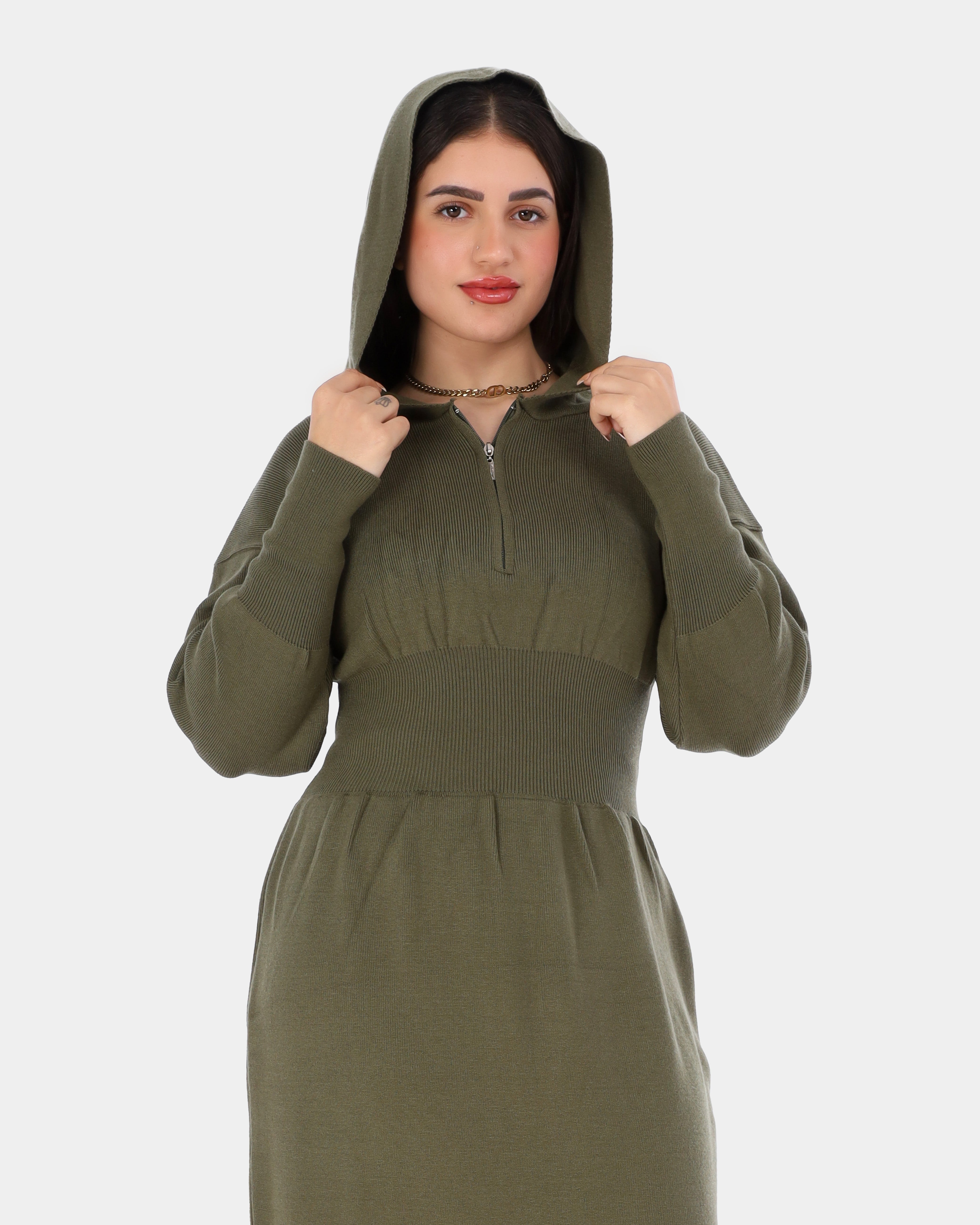 A cozy knit dress featuring a wide waist and hood, perfect for a relaxed yet stylish look.