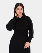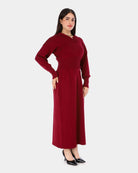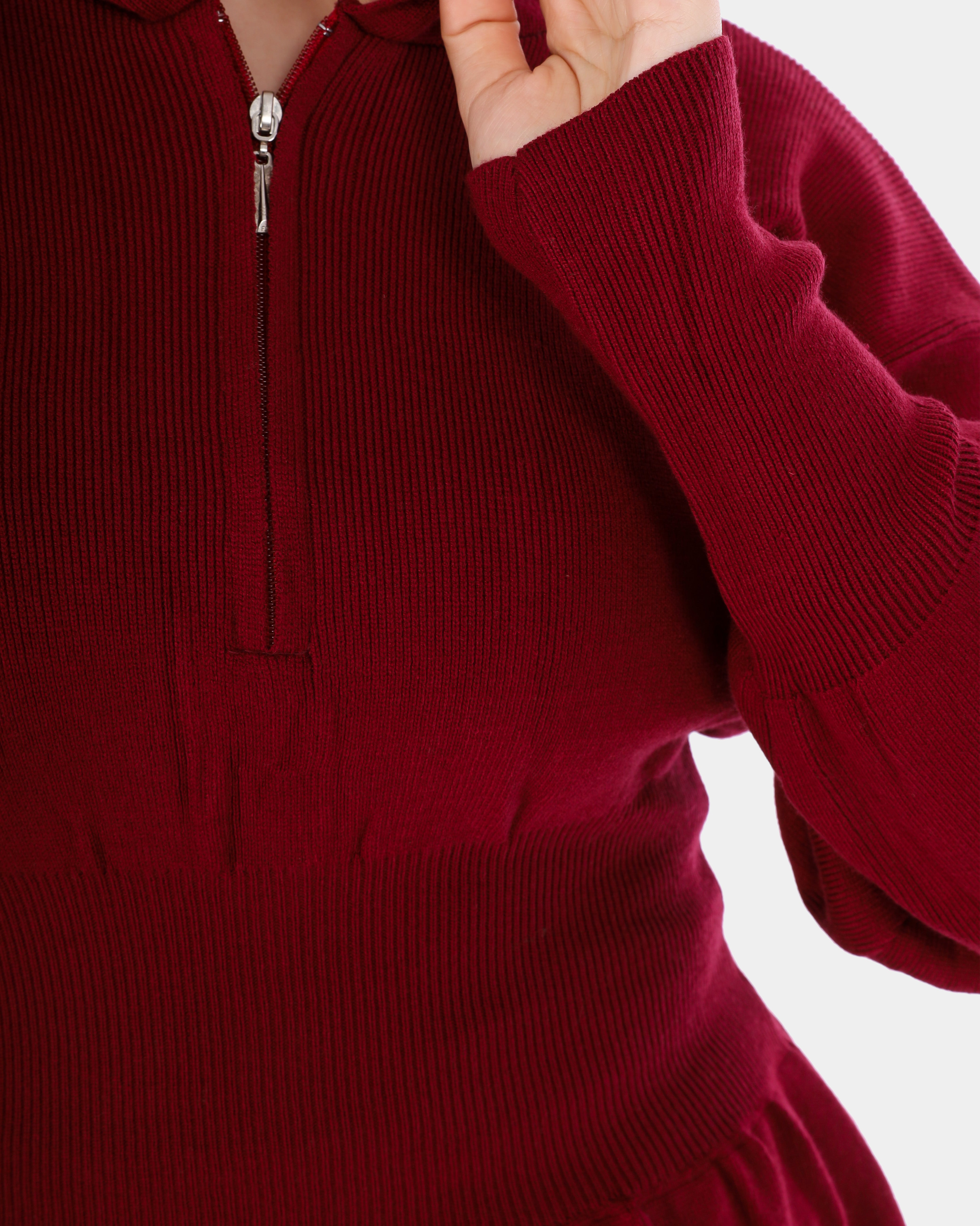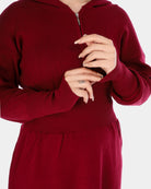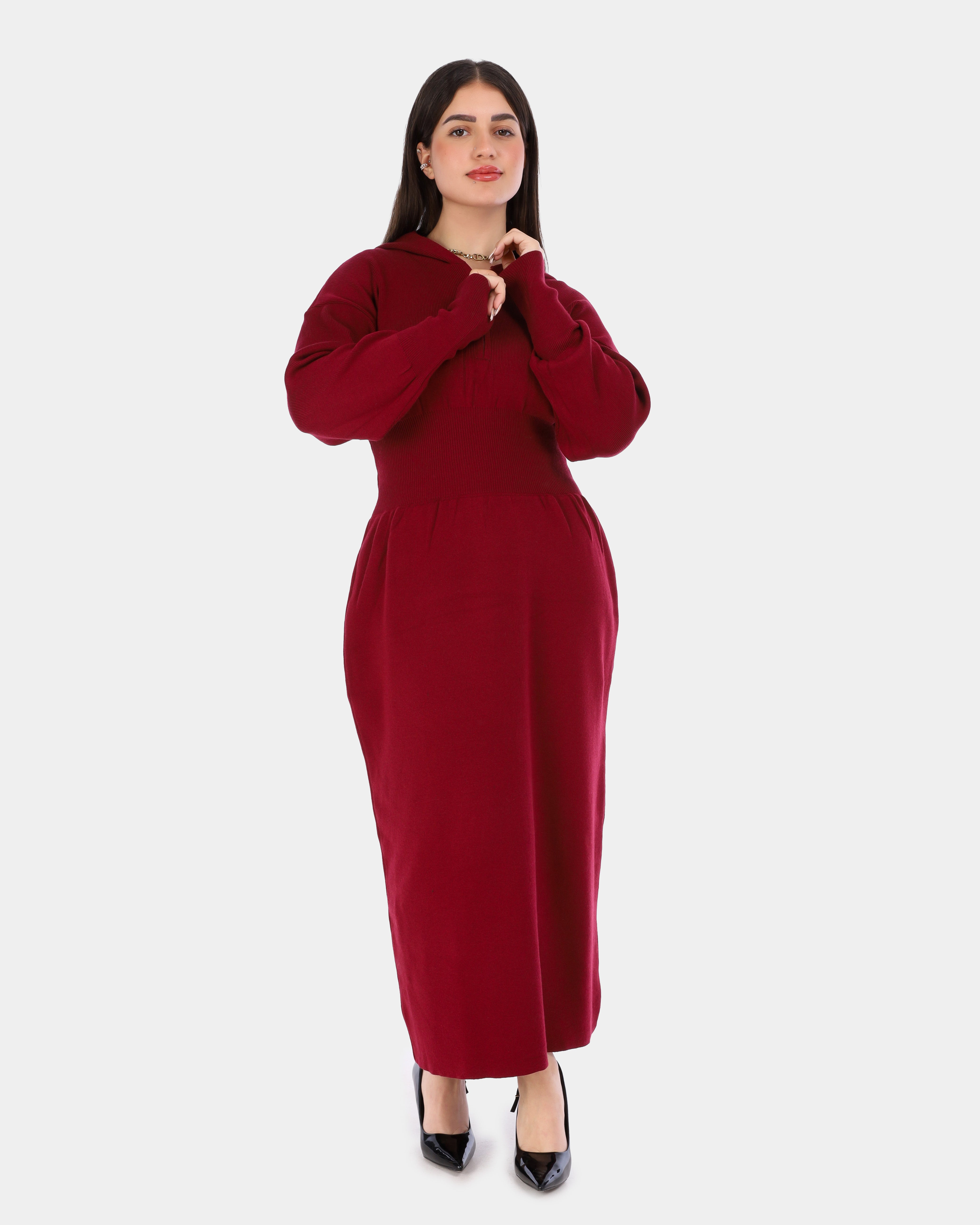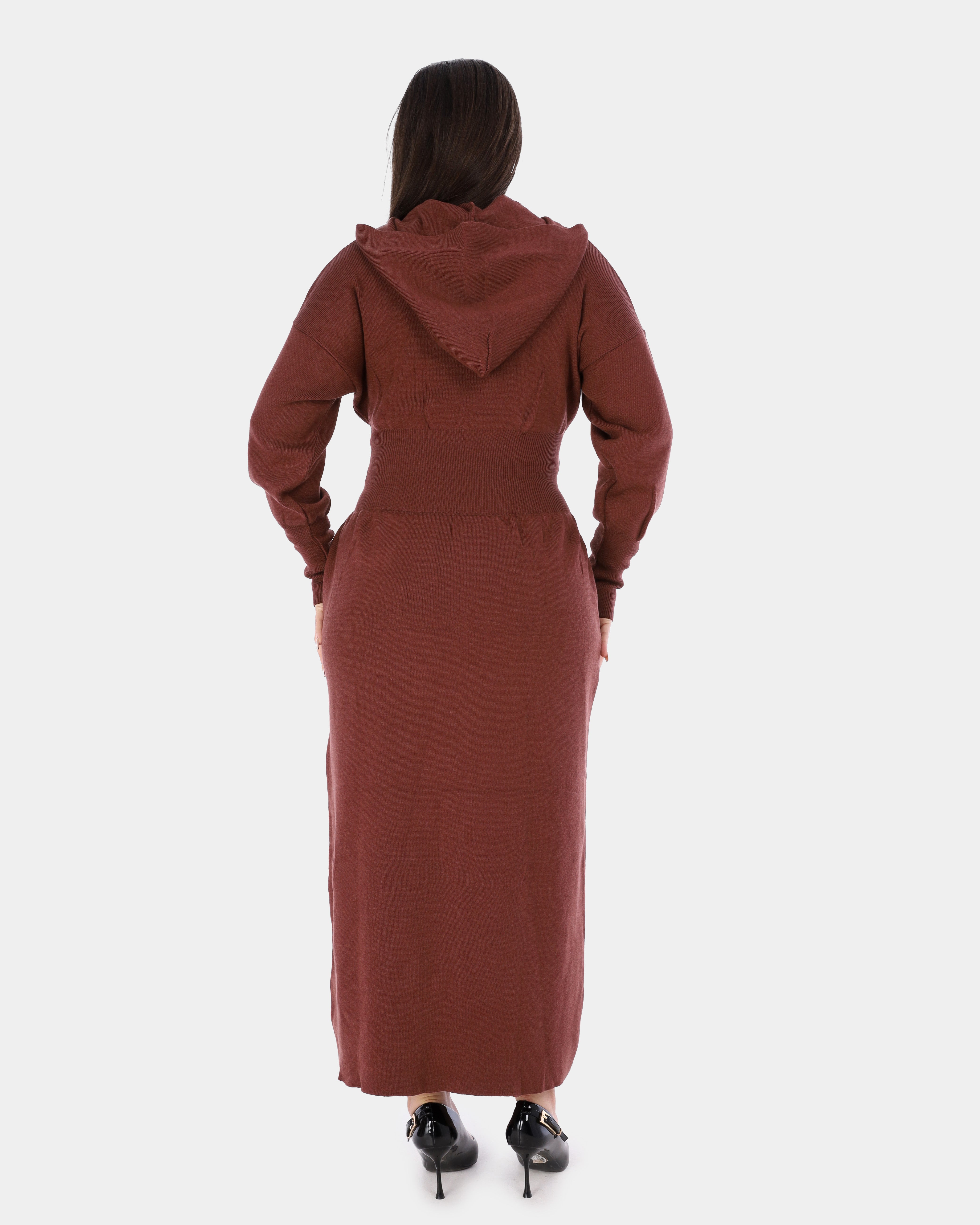A cozy knit dress featuring a wide waist and hood, perfect for a relaxed yet stylish look.