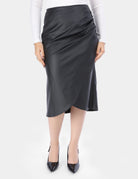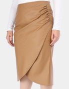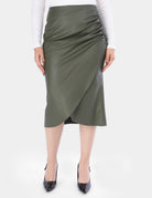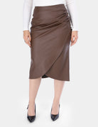 Chic wrap-style faux leather midi skirt with a modern fit.
