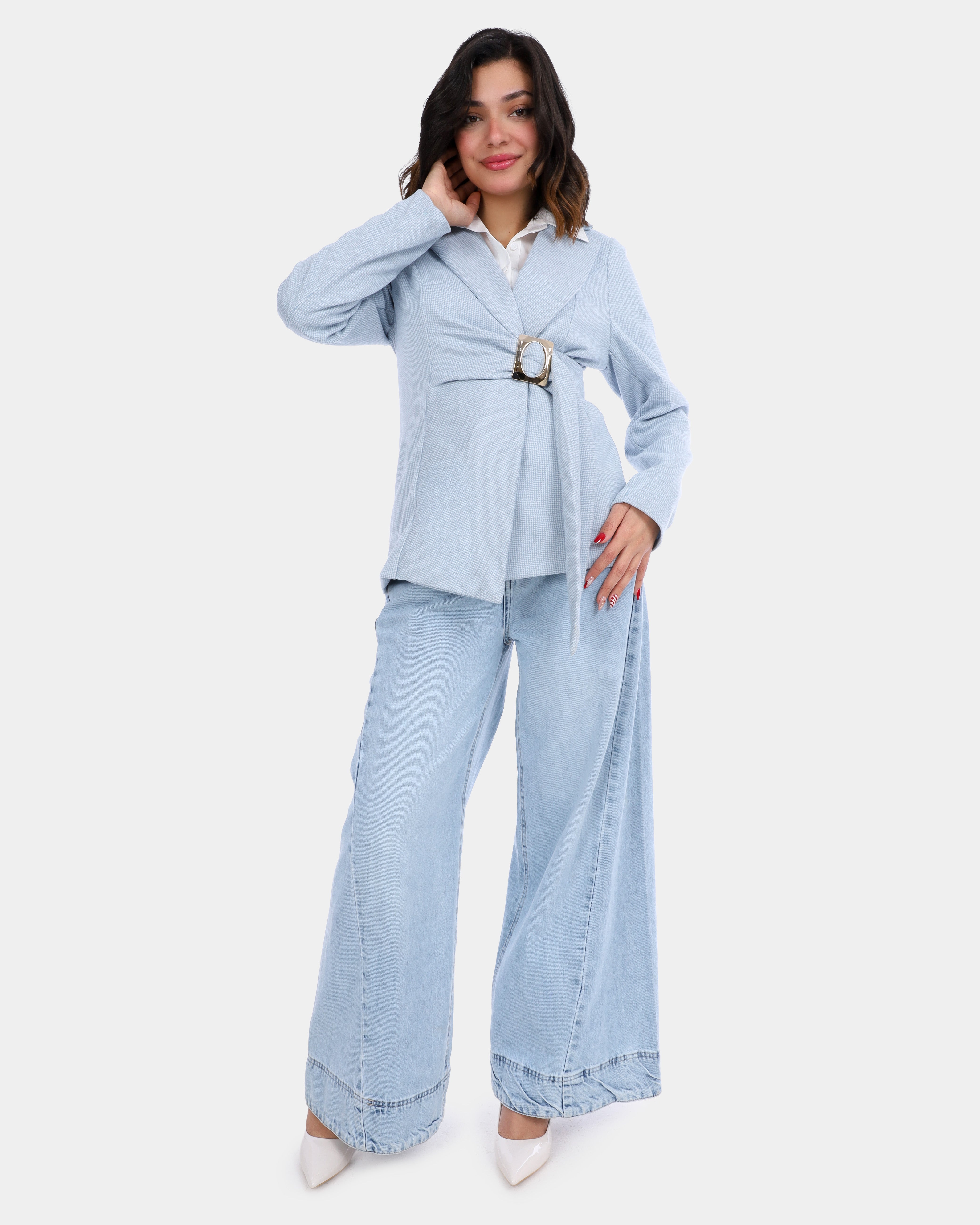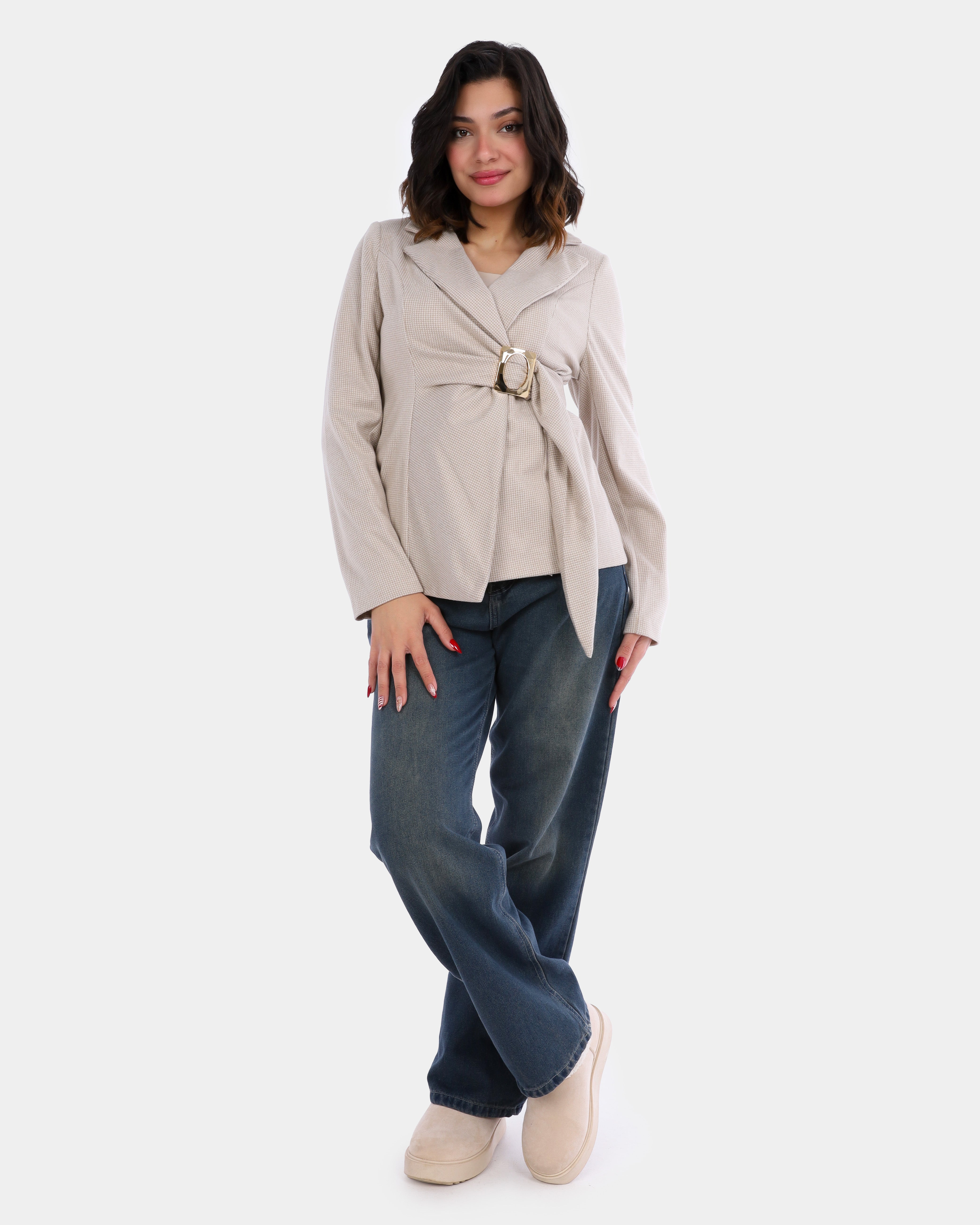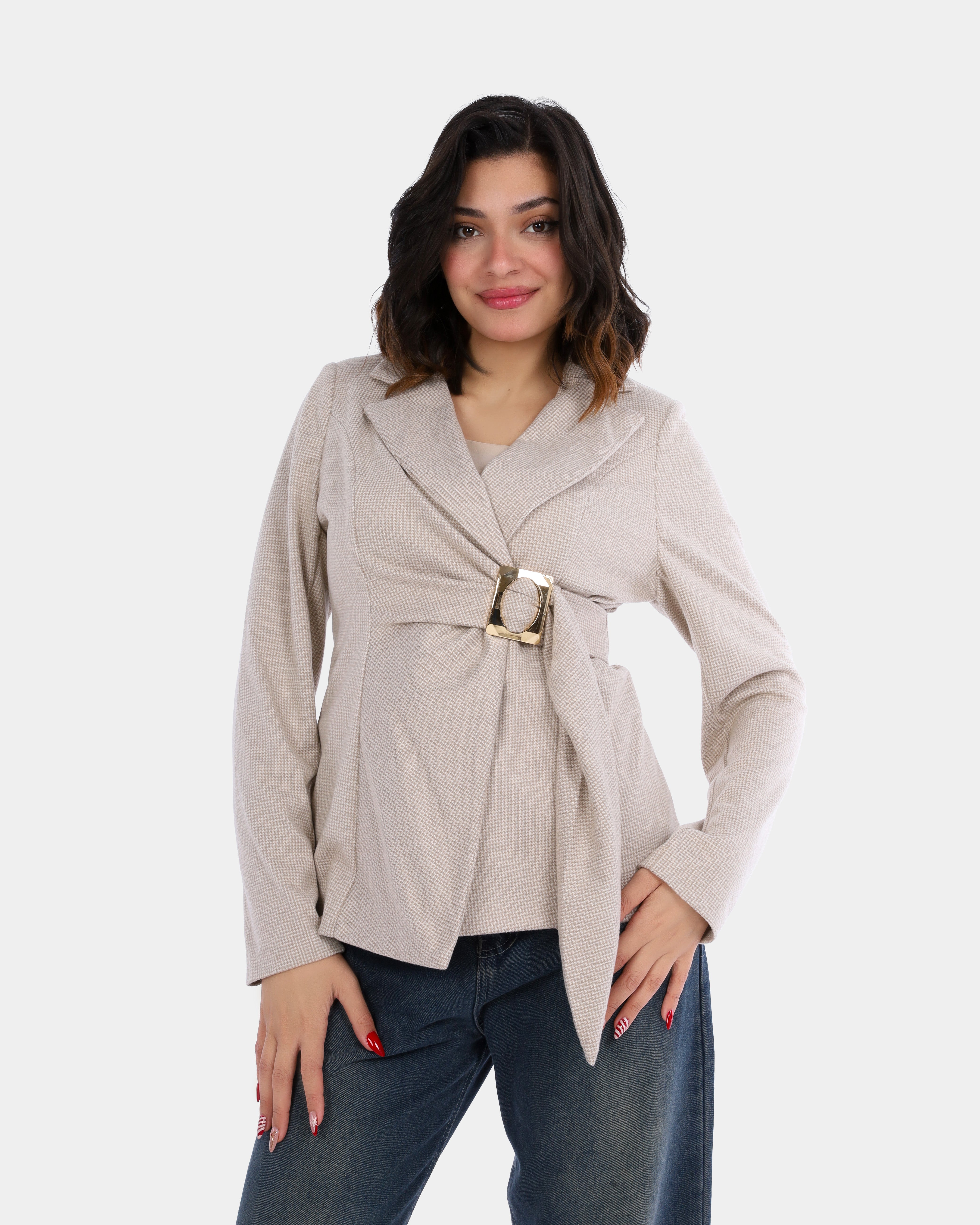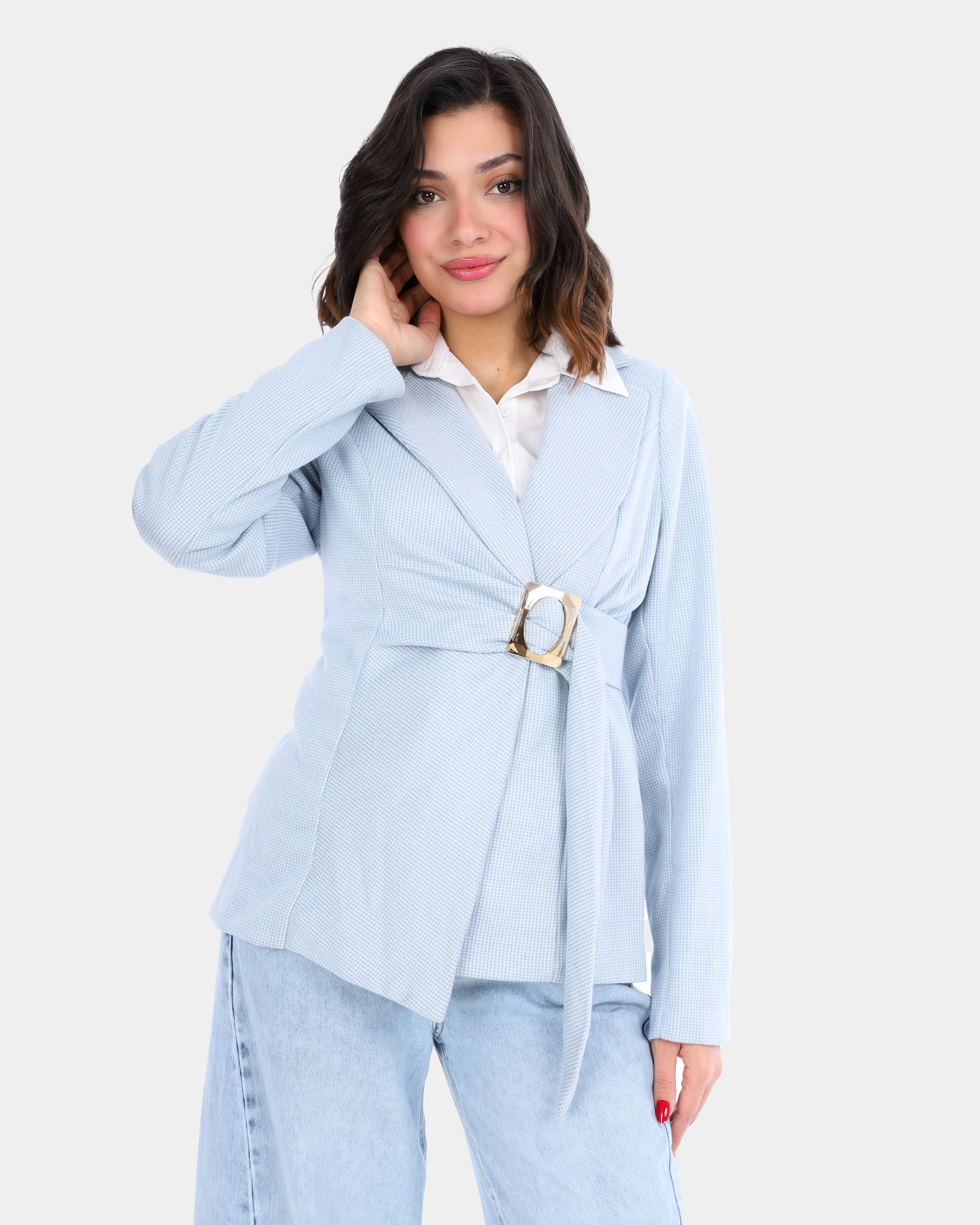 A chic wrap blazer featuring a waist-defining belt with a metal buckle, crafted in textured fabric for a sleek, elegant look.