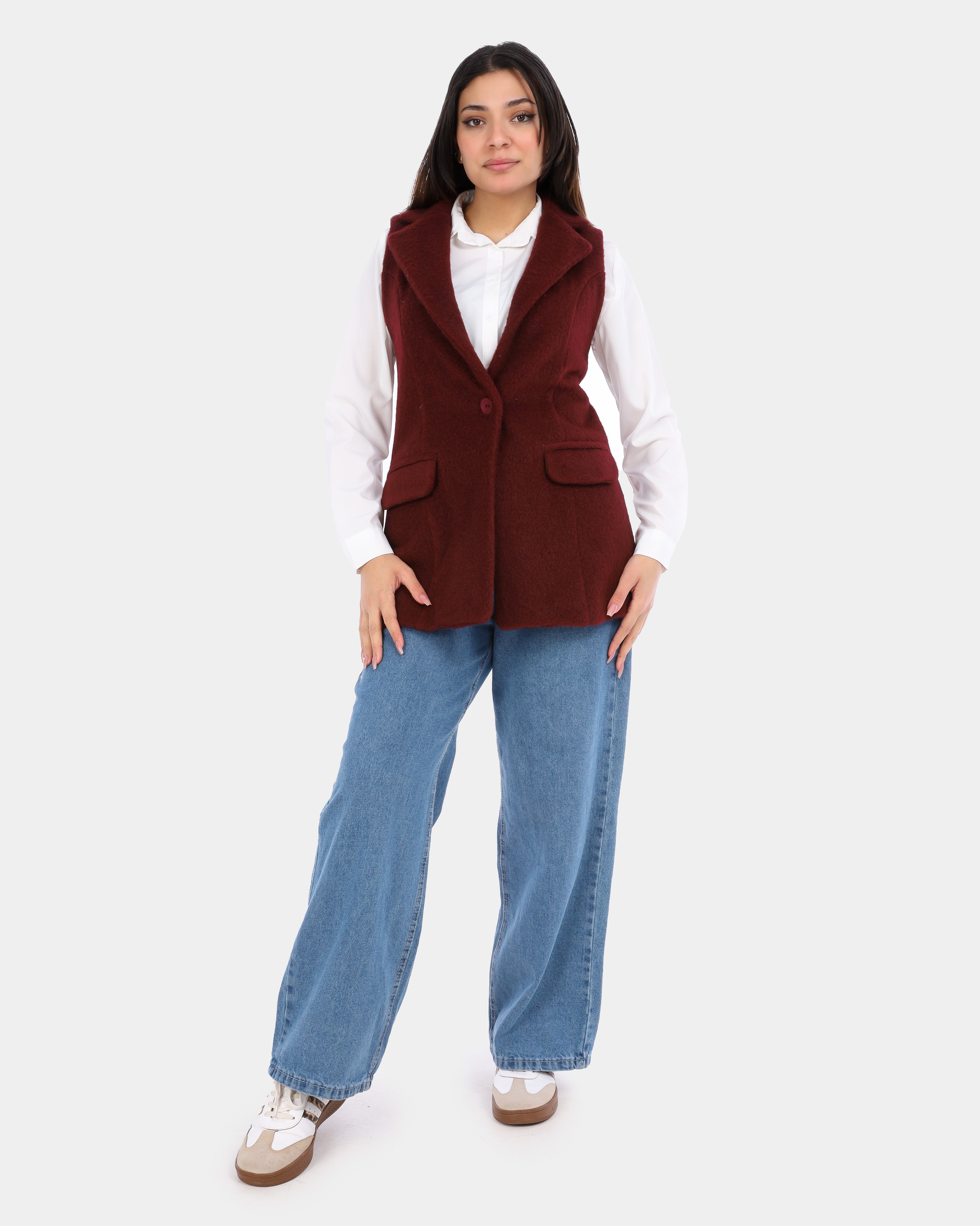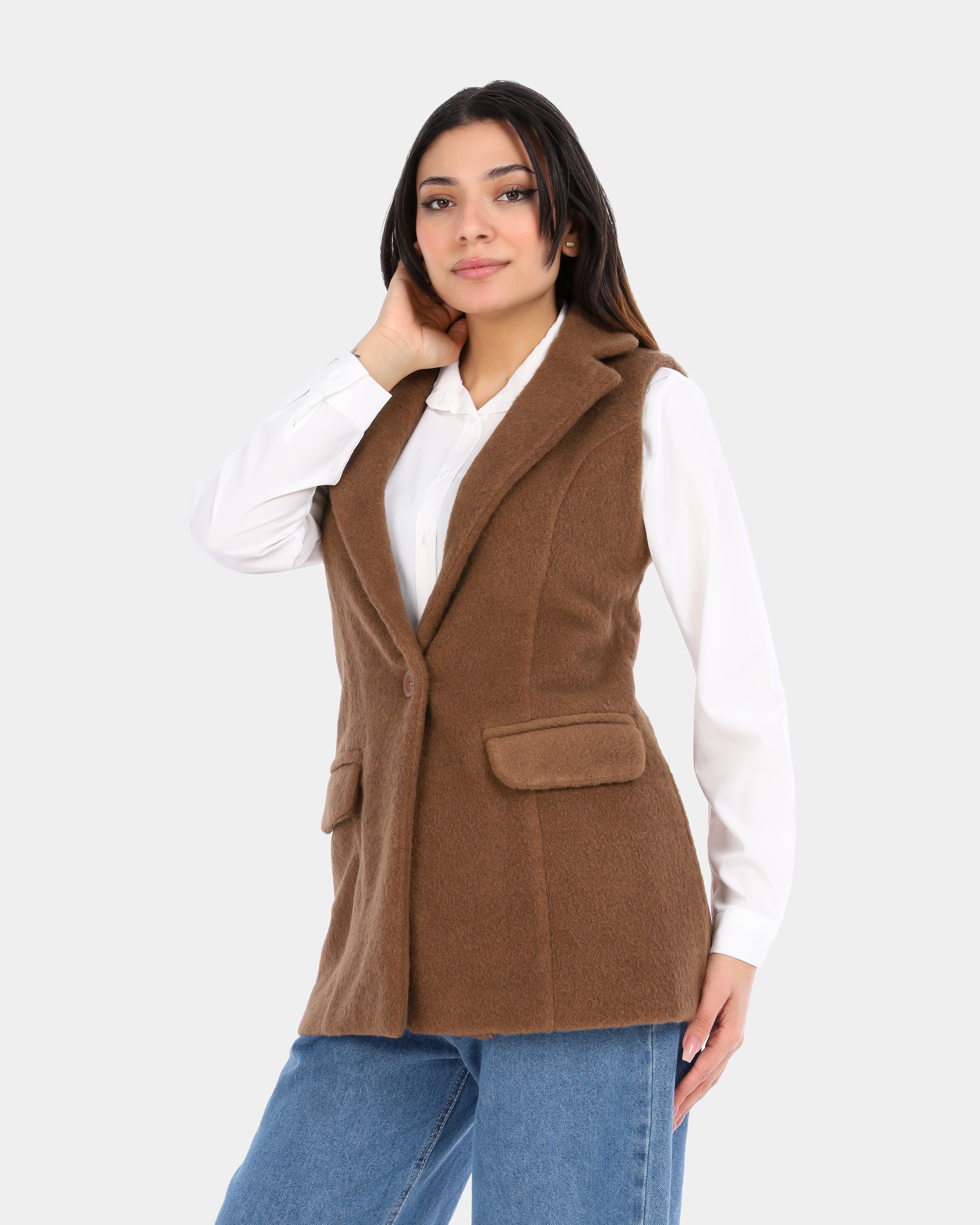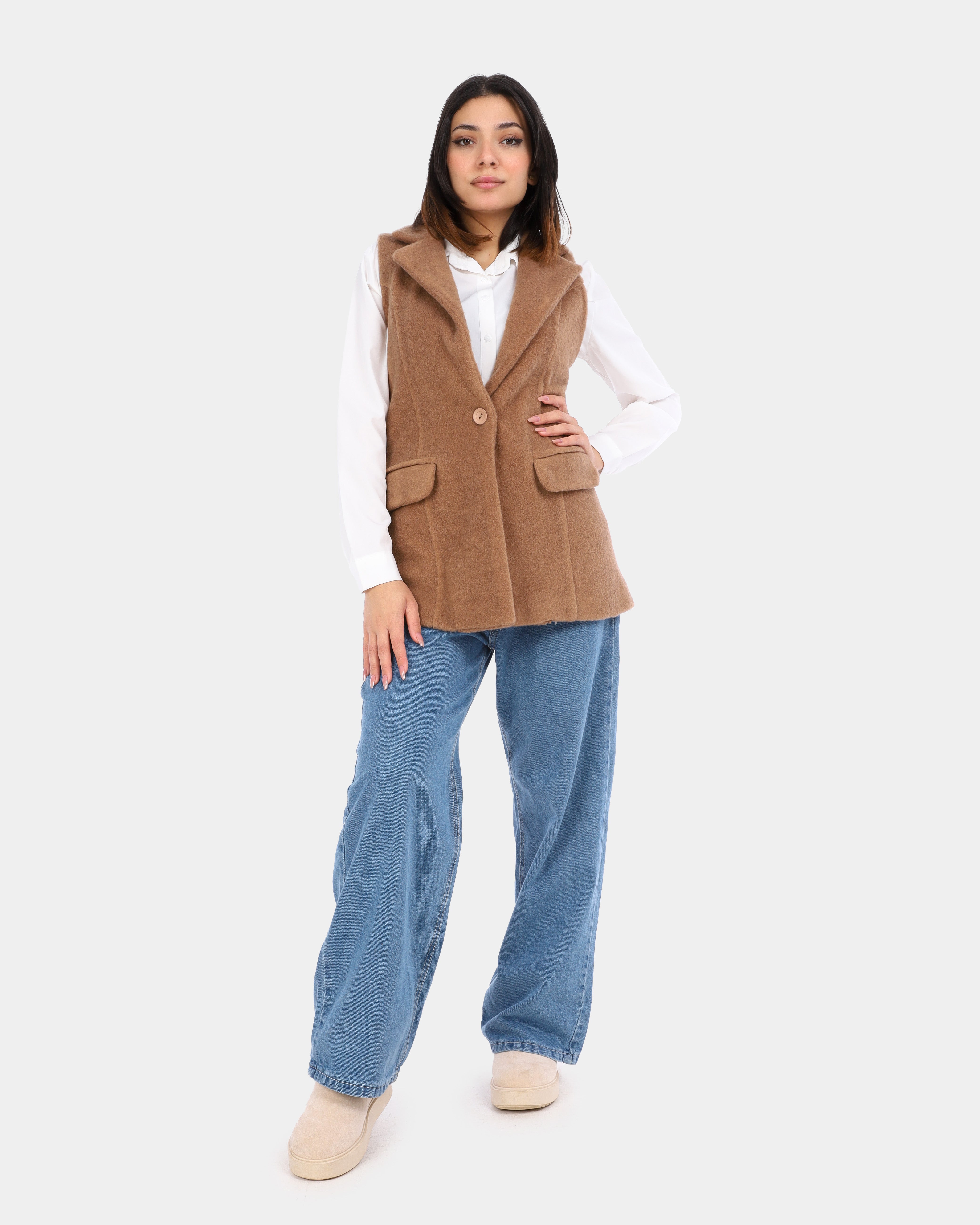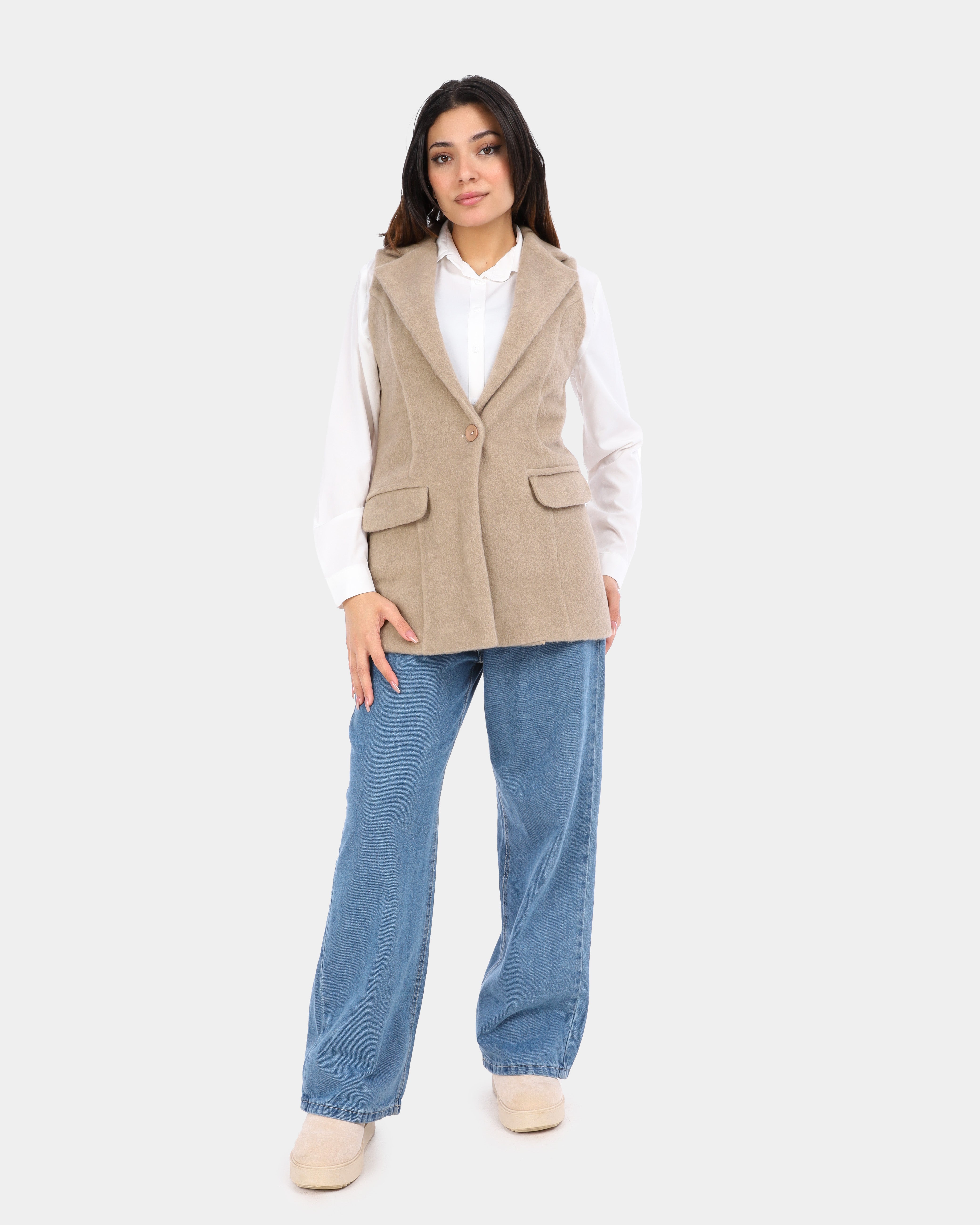 A cozy sleeveless vest made from textured hairy wool, ideal for layering and adding warmth with a stylish, contemporary touch.