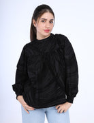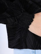 Long sleeve blouse with elastic cuffs and ruffles on the sides round neck.