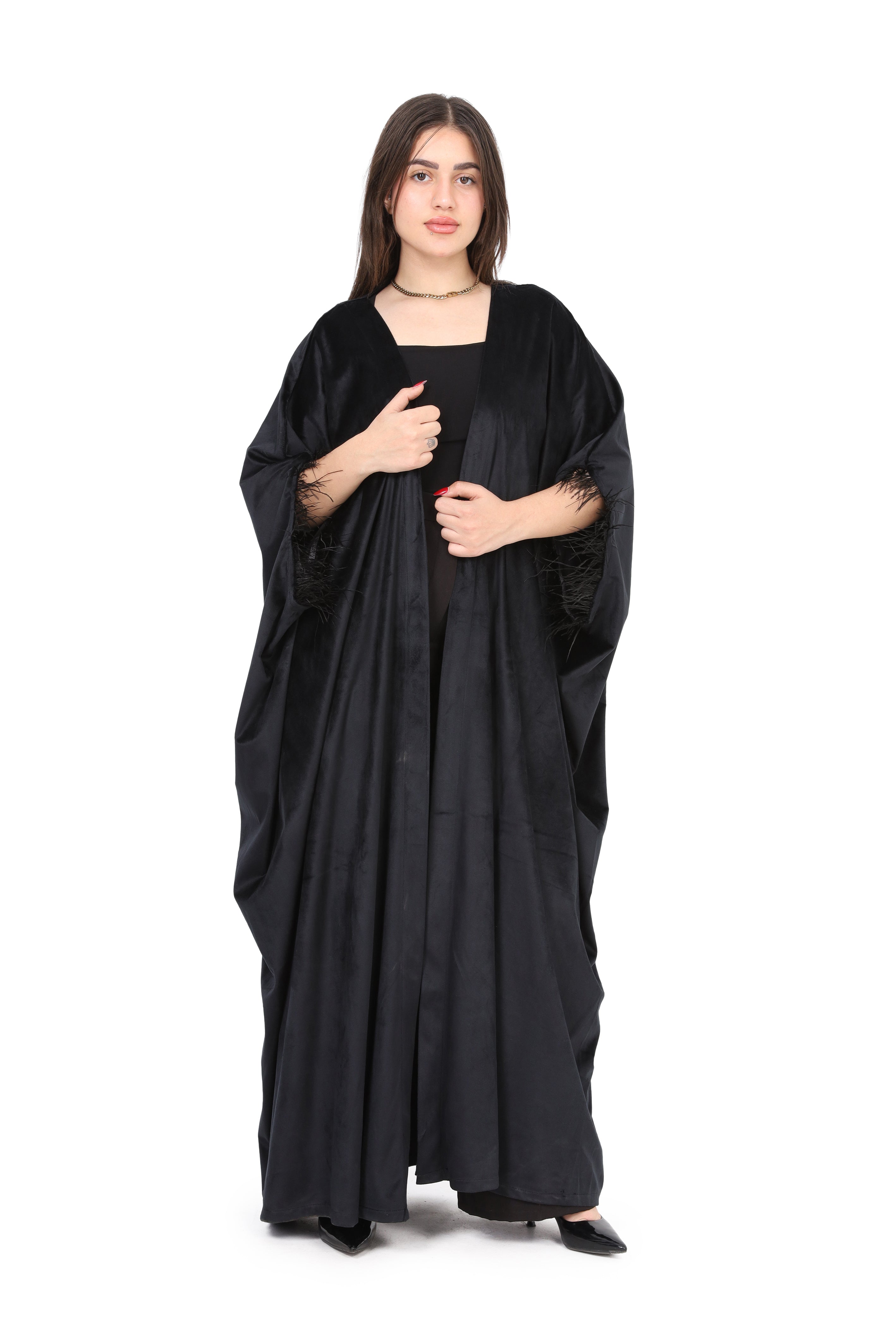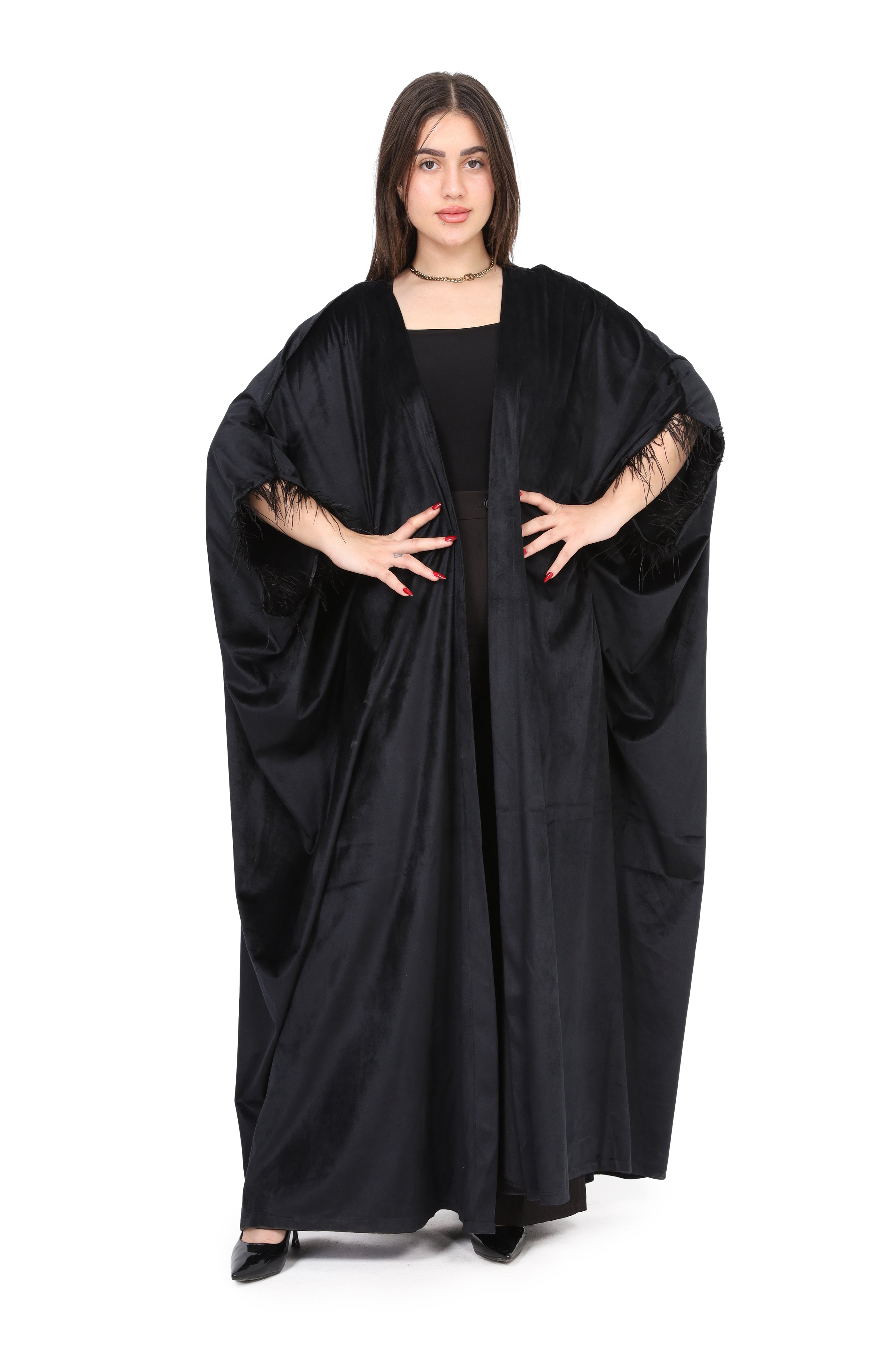 A luxury velvet open kimono featuring feather-trimmed sleeves and a flowing silhouette. Perfect for evening and statement styling.