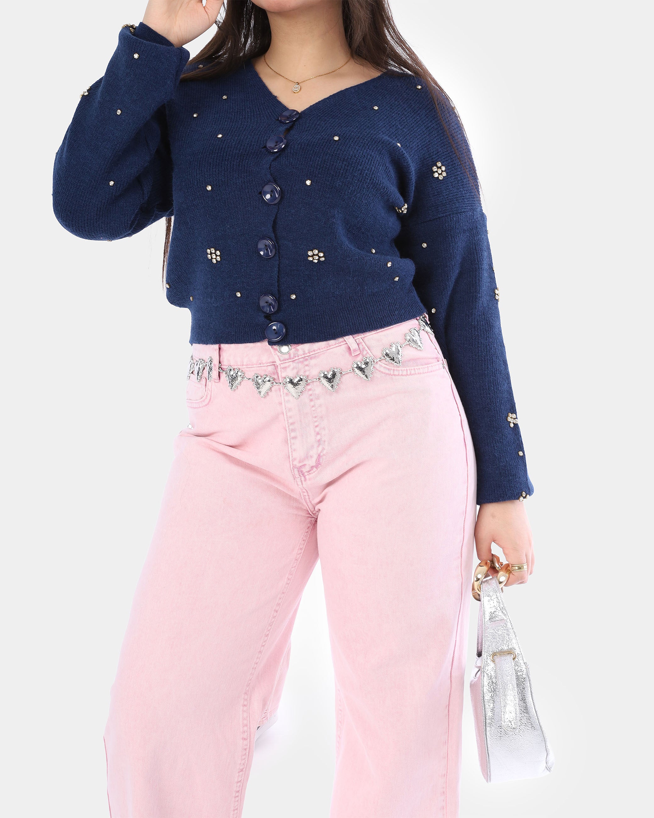 Soft mohair cardigan with sparkling rhinestone accents.