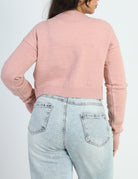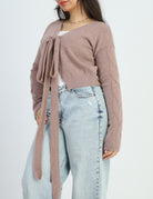 A soft knit cropped cardigan featuring a front tie closure and long sleeves. Perfect for layering over dresses or tops for a feminine and cozy look.